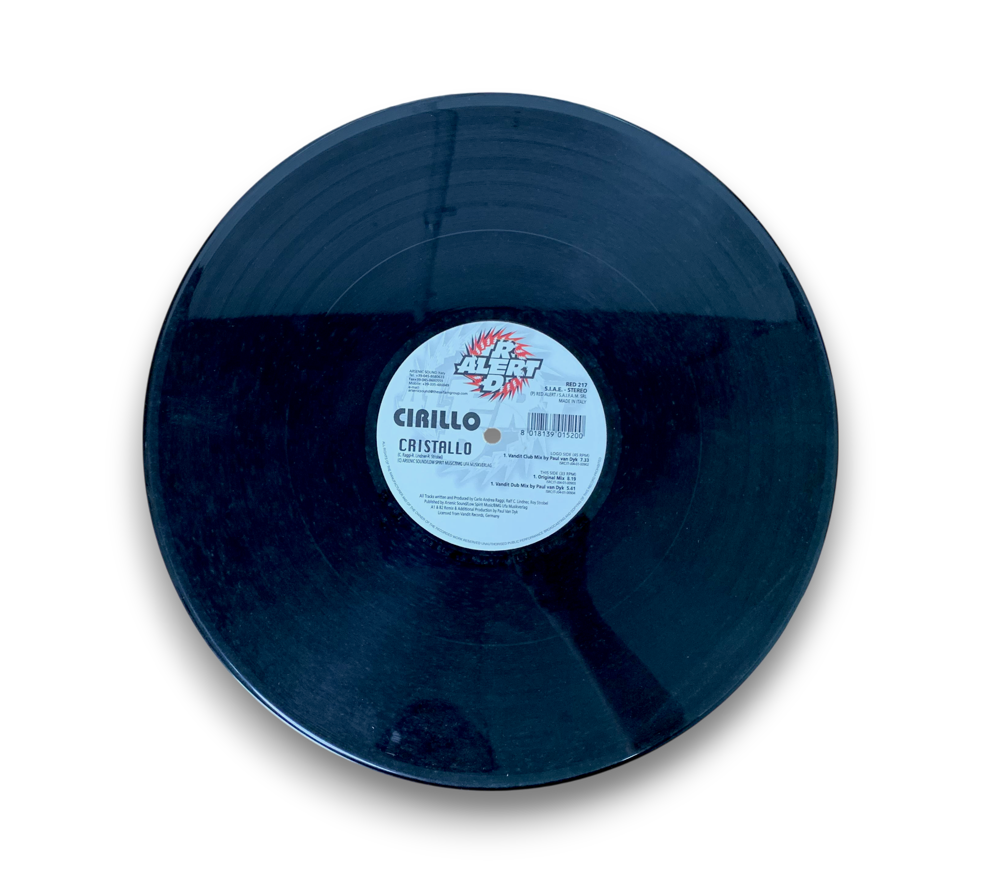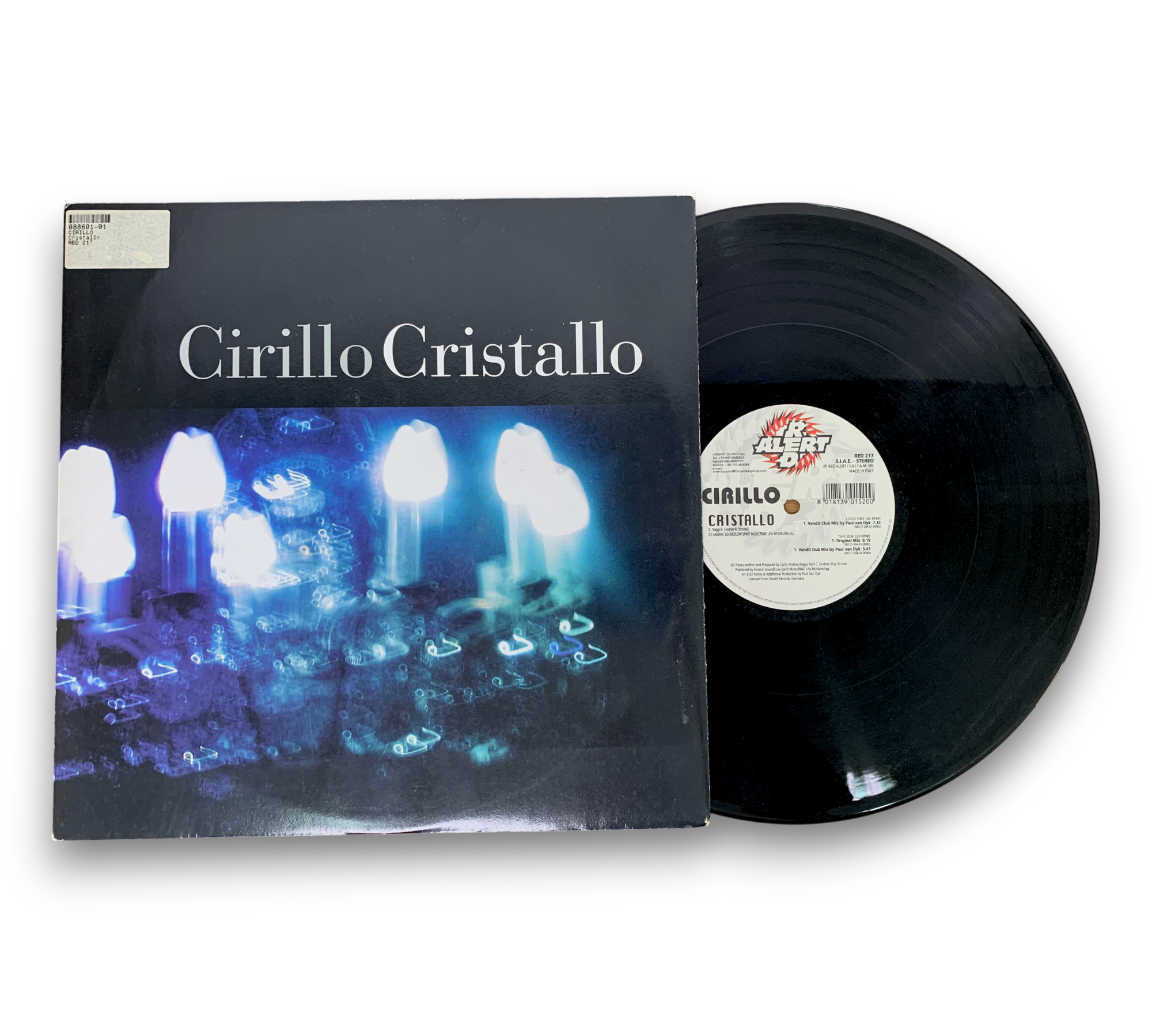Experience the mesmerizing sounds of Cirillo's "Cristallo," released in 2002 by Arsenic Sound. This vinyl record features a captivating blend of electronic music, including the Vandit Club Mix and the Original Mix, showcasing Cirillo's unique trance style. The striking visuals on the cover enhance the listening experience, making it a must-have for electronic music enthusiasts. For more details on packaging and inserts, please refer to the accompanying photos.