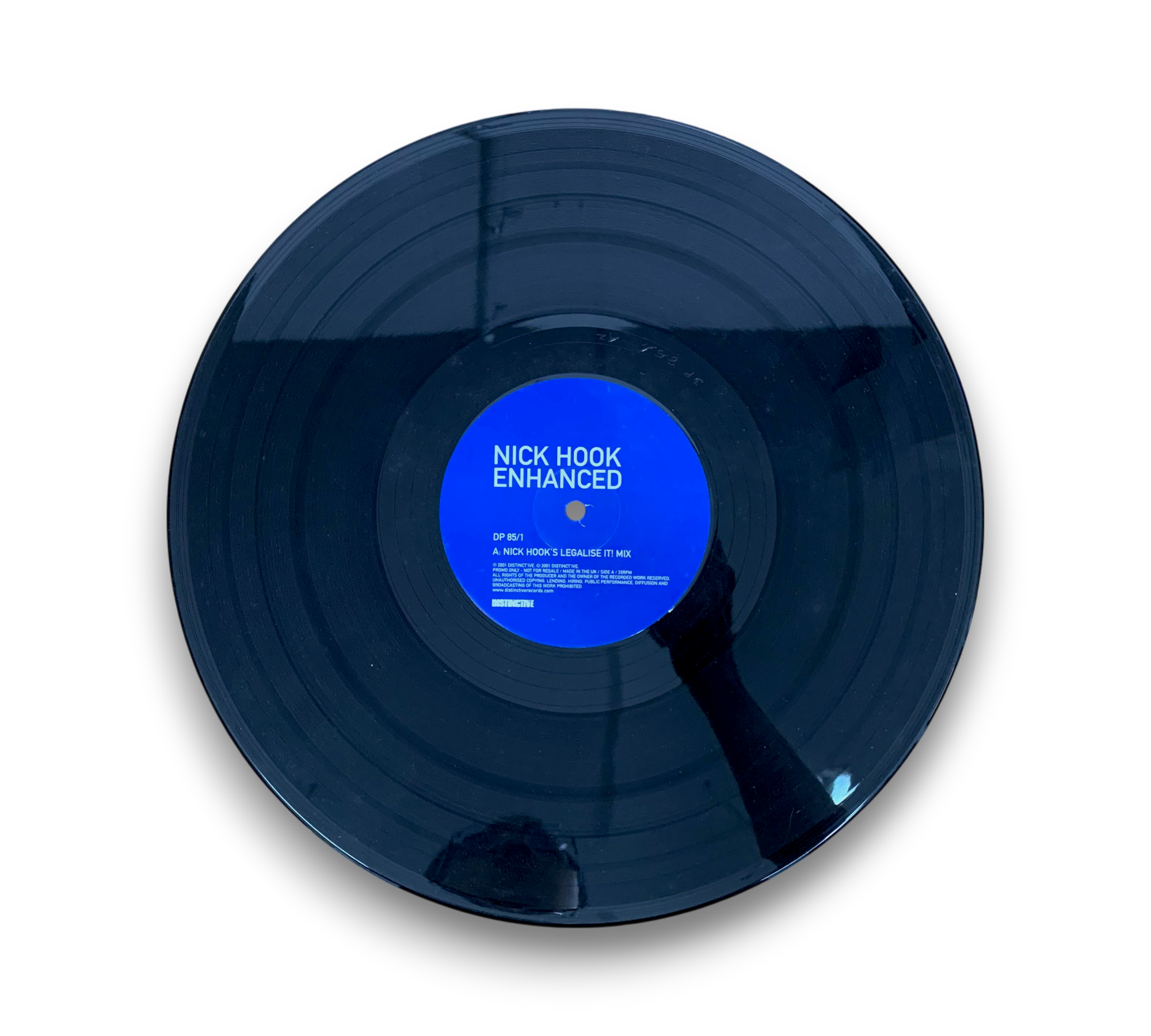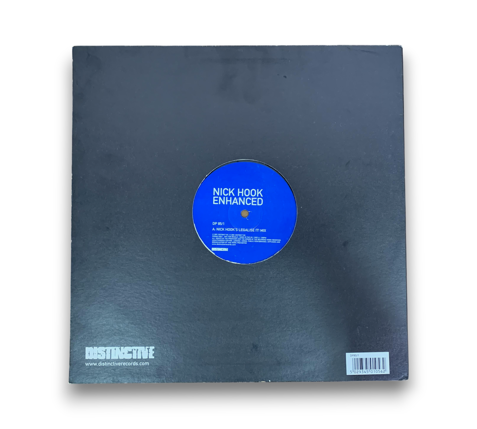 Promo only release from Distinct'ive, this record features tracks by Nick Hook, including "Legalise It Mix" and "Soul Mekanik Remix." The release is marked with ℗ 2001 Distinct'ive and is made in the UK. Some copies may include a sticker on the back with the catalog number 'DP85/1' and a barcode. For further details regarding the packaging and inserts, please refer to the accompanying photos.