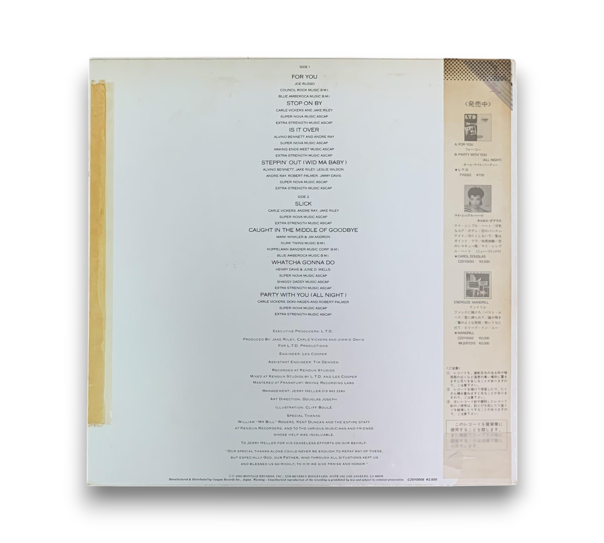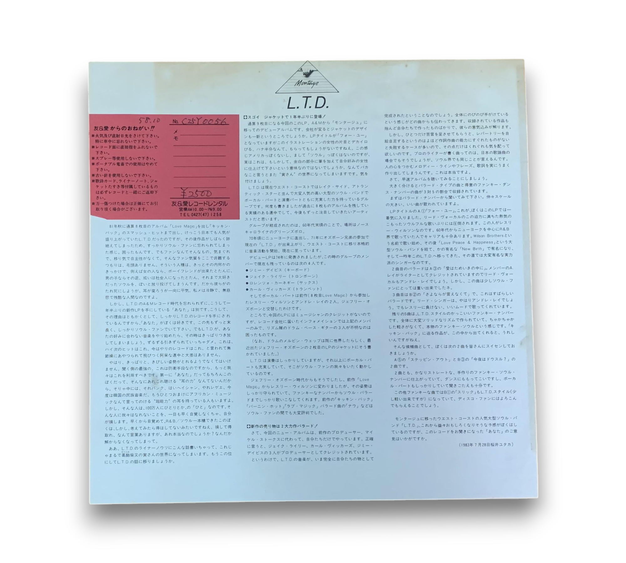 This listing features the album "For You" by L.T.D., priced at ¥2,500. The record includes an additional lyric insert, which is confirmed by the images provided. Please refer to the accompanying photos for a detailed view of the album's condition and any included materials.