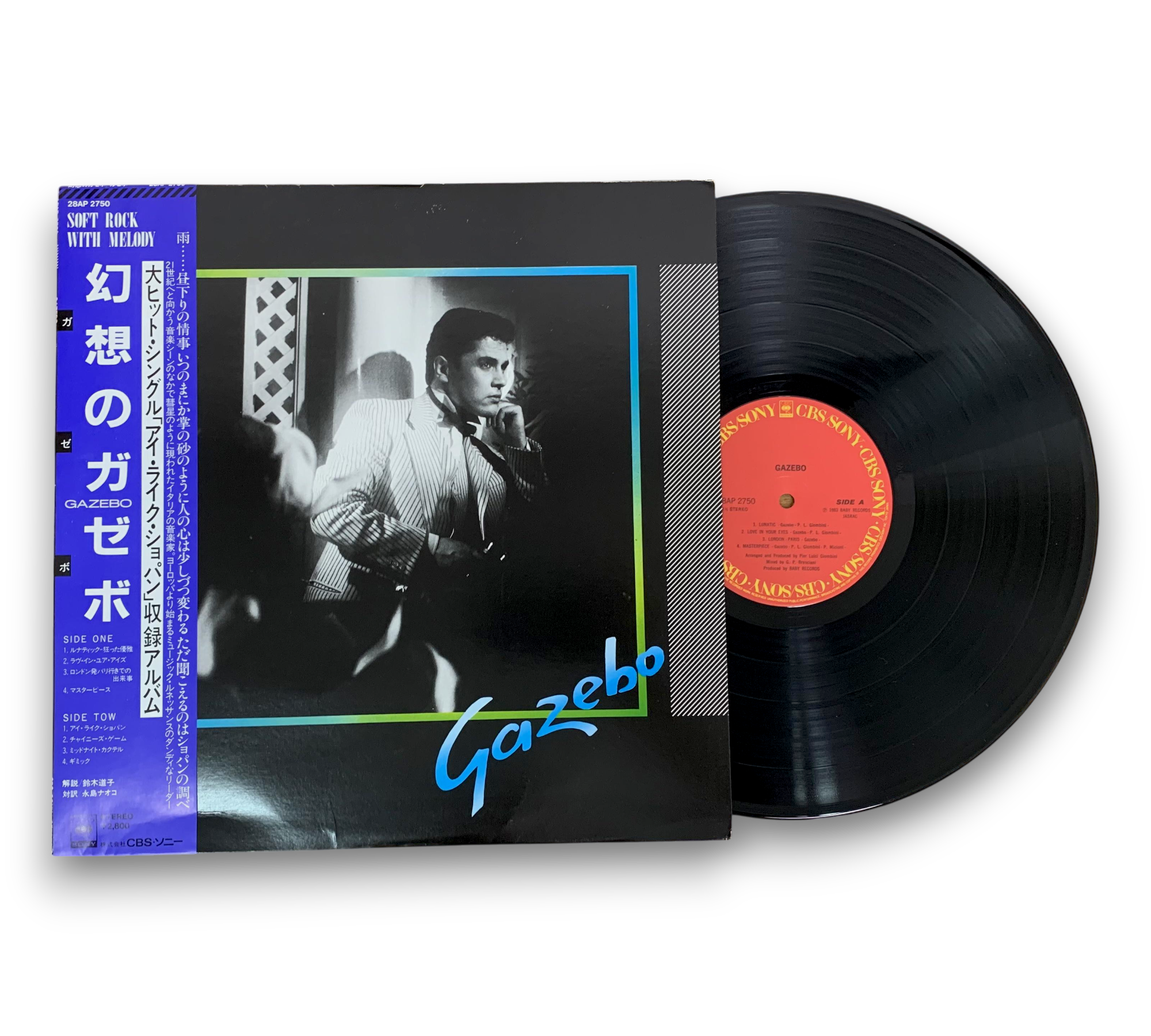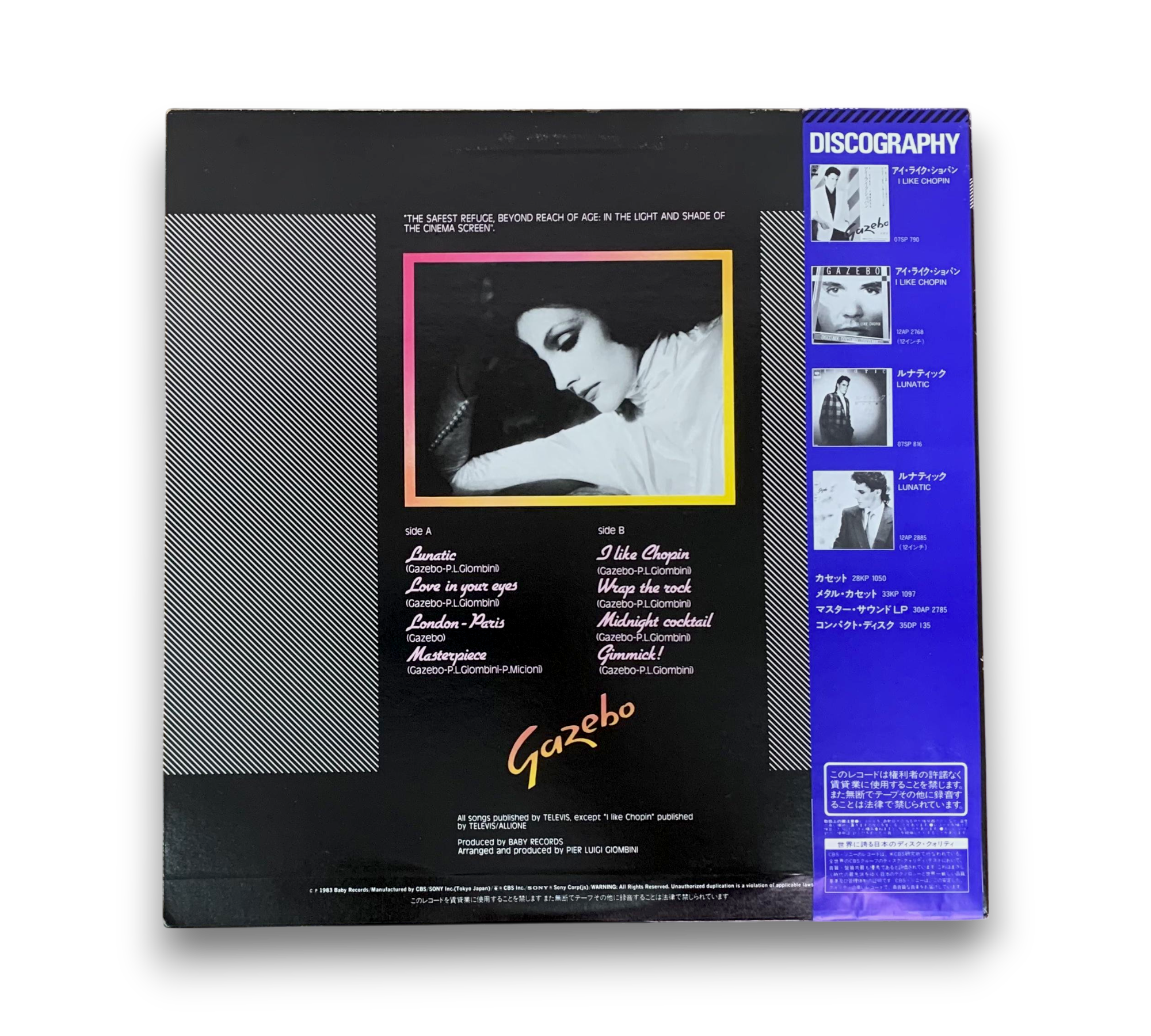 Discover the captivating sounds of Gazebo with this indigo obi version of their 1983 album, featuring the iconic track "I Like Chopin." This vinyl release showcases a striking cover design and includes a detailed discography on the back. With a blend of Italo-Disco and Synth-pop, the album features standout tracks like "Lunatic" and "Love In Your Eyes." A must-have for electronic music enthusiasts and collectors alike!
