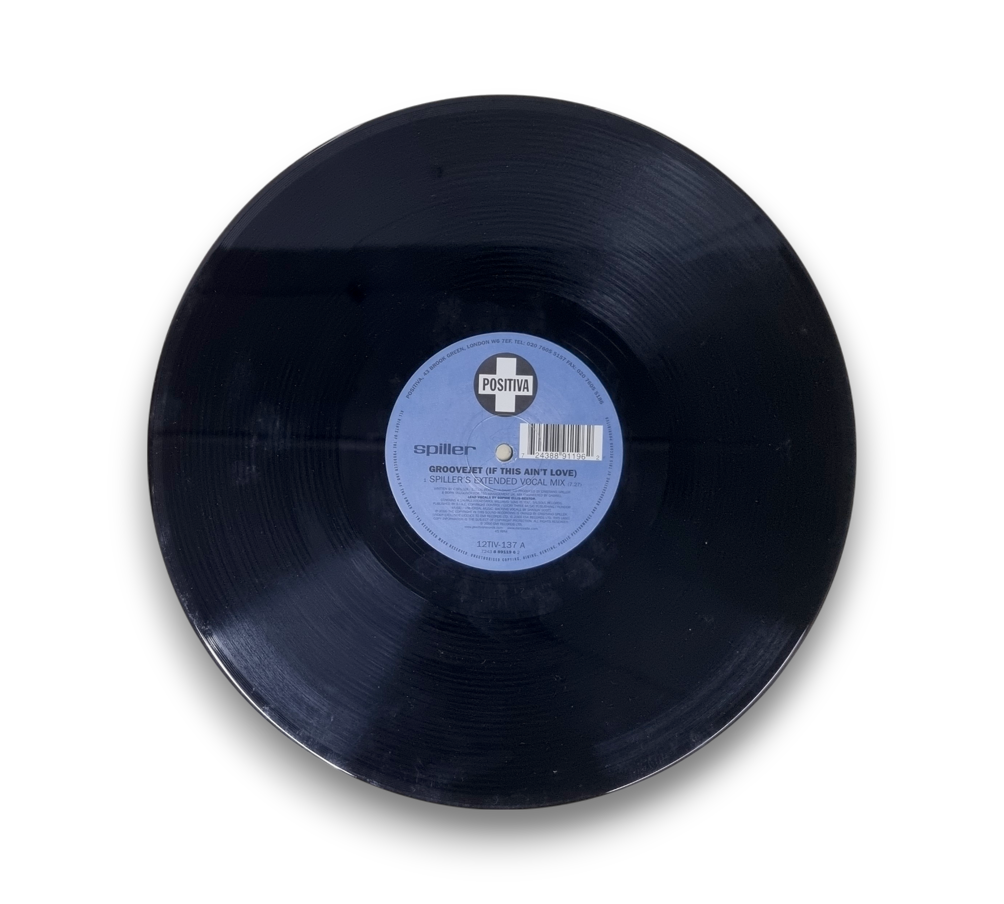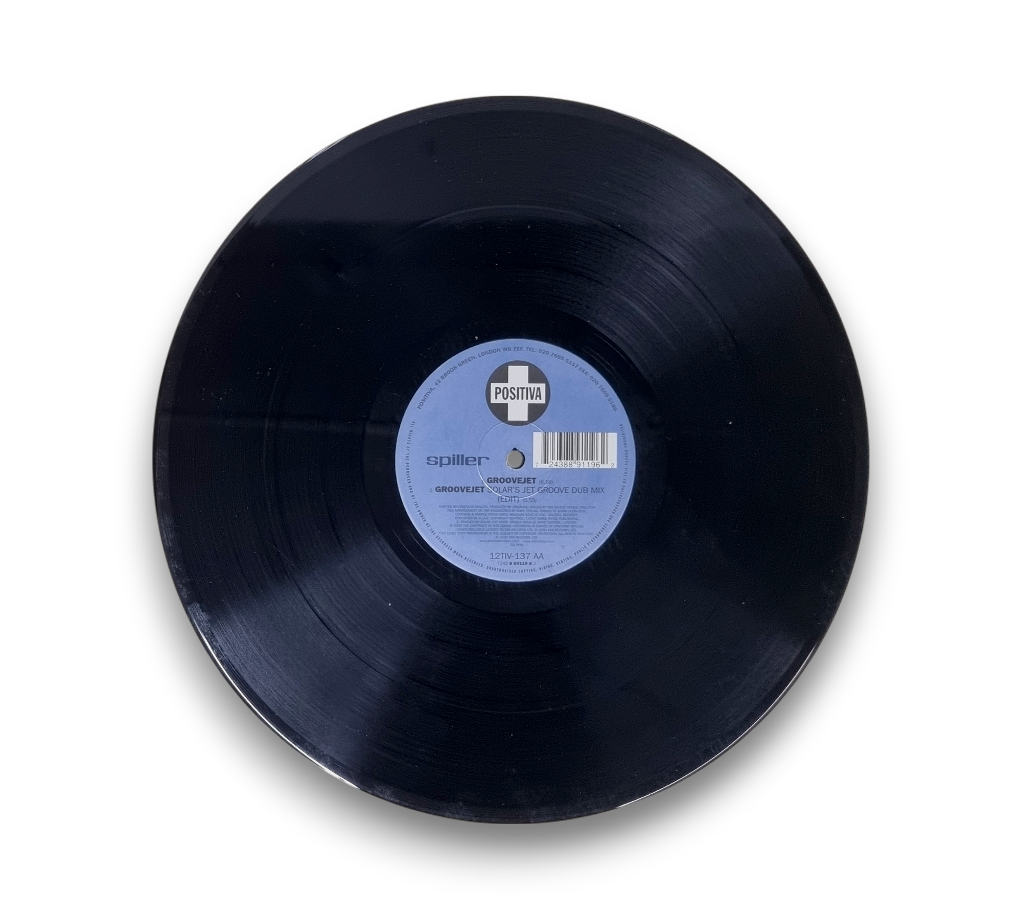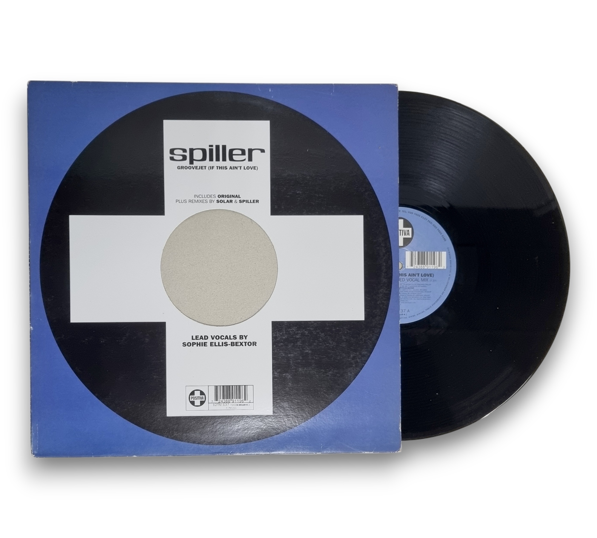 This record features the hit "Groovejet (If This Ain't Love)" by Spiller, showcasing lead vocals by Sophie Ellis-Bextor. The A-side includes the original extended vocal mix, while the AA-side features remixes, including a groove dub mix. The record is produced by Cristiano Spiller and Boris Dlugosch, with remixes by Solar. It is pressed on vinyl with the A-side playing at 45 RPM and the AA-side at 33 ⅓ RPM. For further details regarding the packaging and inserts, please refer to the accompanying photos.