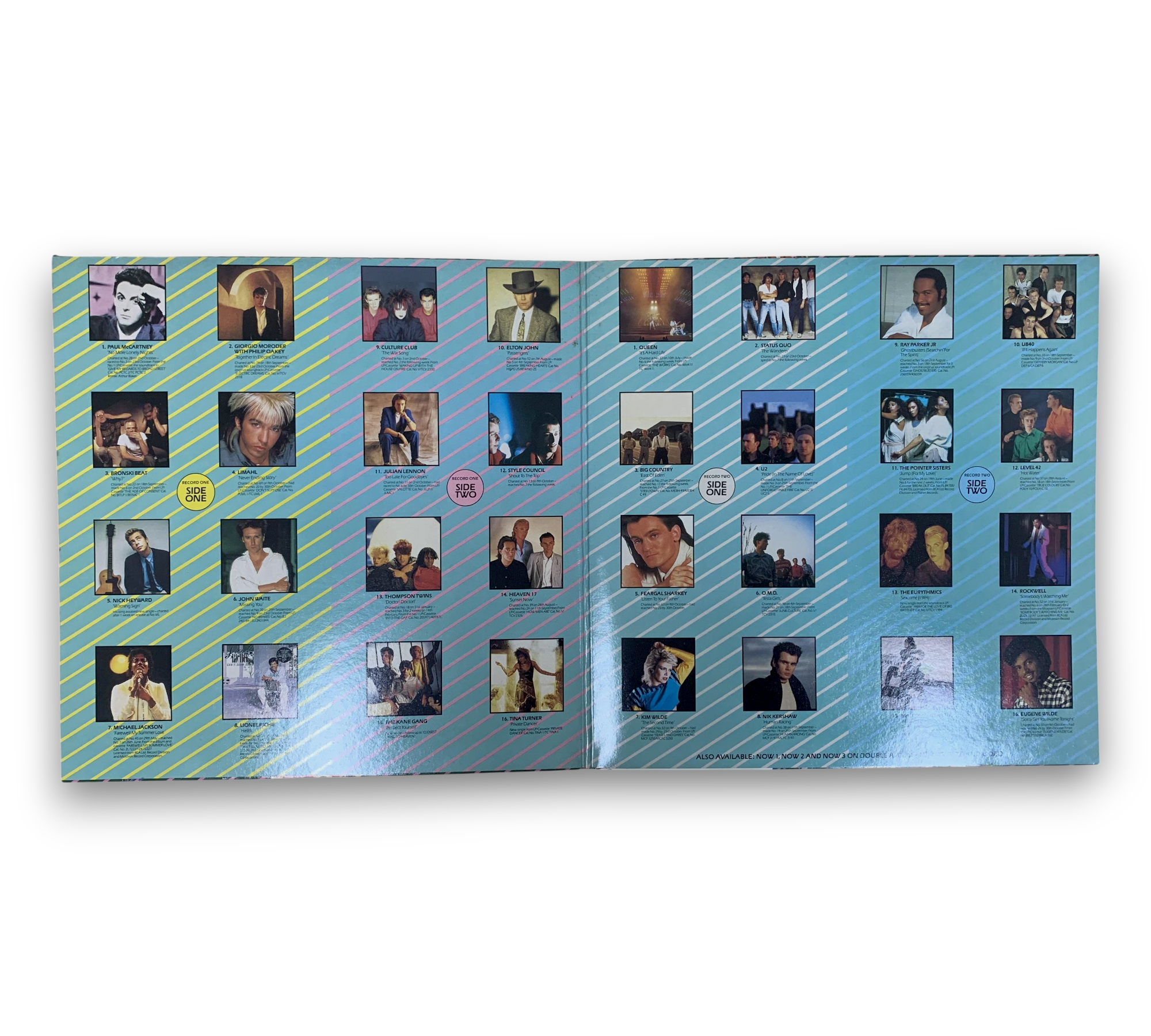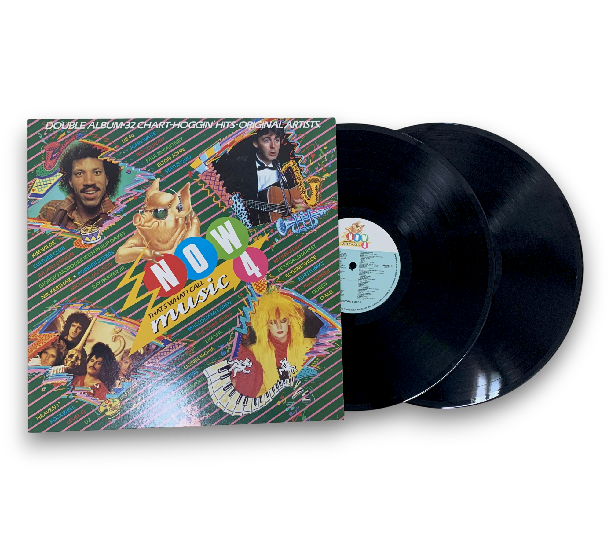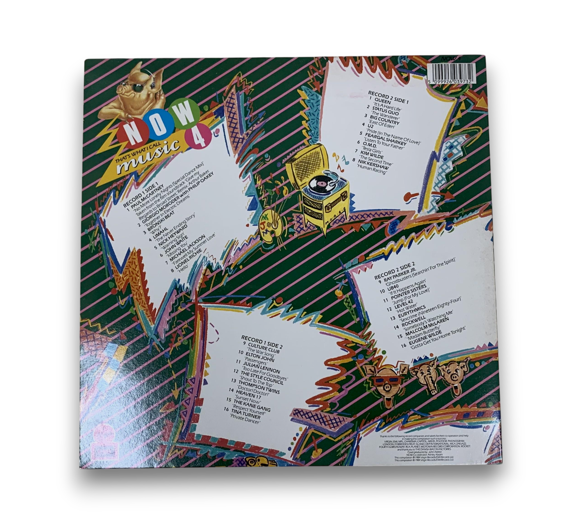 This compilation, titled "NOW That's What I Call Music 4," was released in 1984 by Virgin Records/EMI Records Ltd. It features a gatefold sleeve and includes a collection of chart-topping hits from various original artists. The records are made in England, and the runouts indicate a variant with "FM" etched just after the "D." For further details regarding the packaging and inserts, please refer to the accompanying photos.
