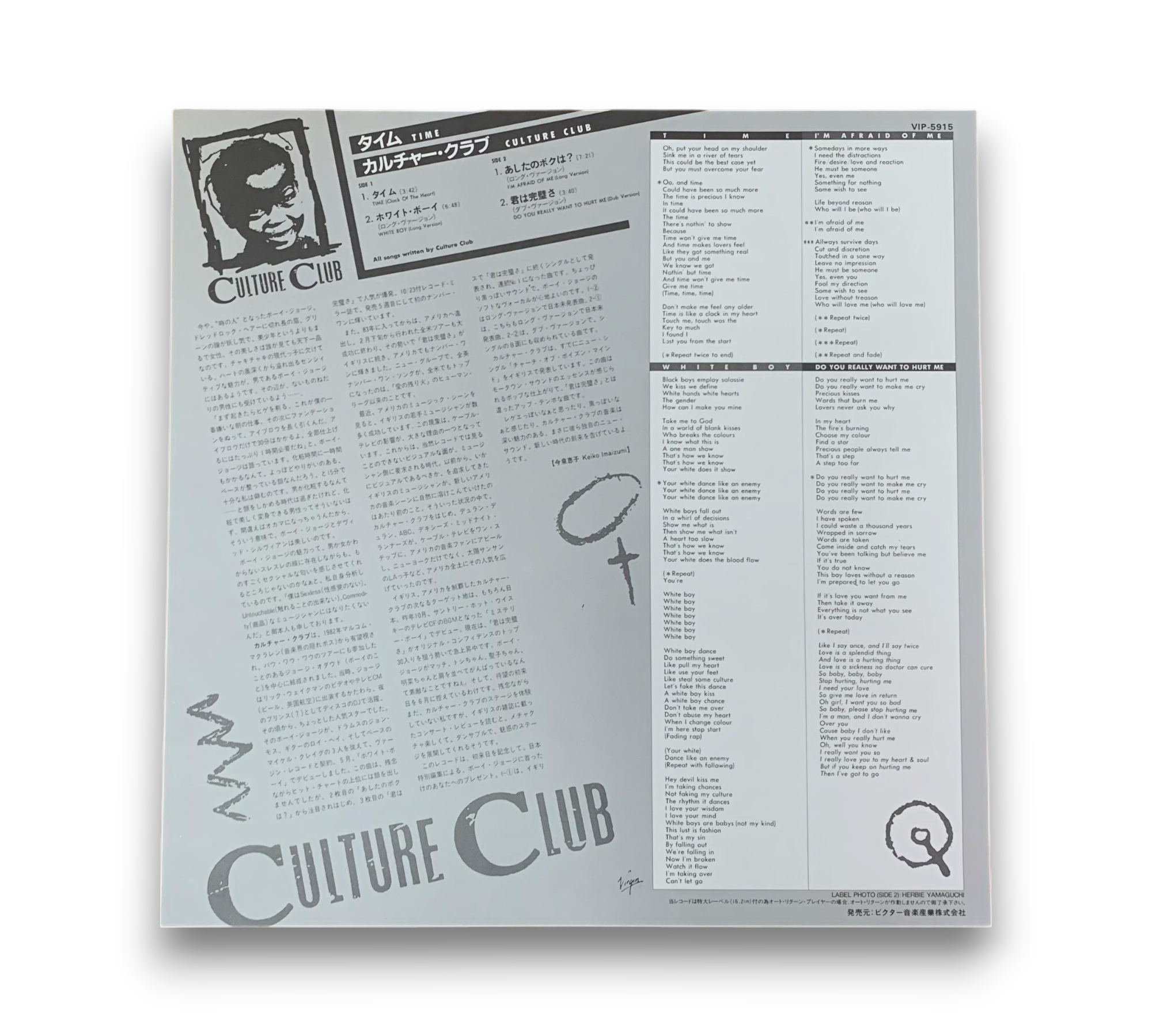 Discover the iconic sounds of Culture Club with the special edition vinyl of "Time," released in Japan in 1983. This unique record features a die-cut cover and an obi strip, celebrating the band's Japan tour. The tracklist includes hits like "Time (Clock Of The Heart)" and "Do You Really Want To Hurt Me," along with an insert containing Japanese liner notes and English lyrics. A must-have for fans of synth-pop and electronic music!
