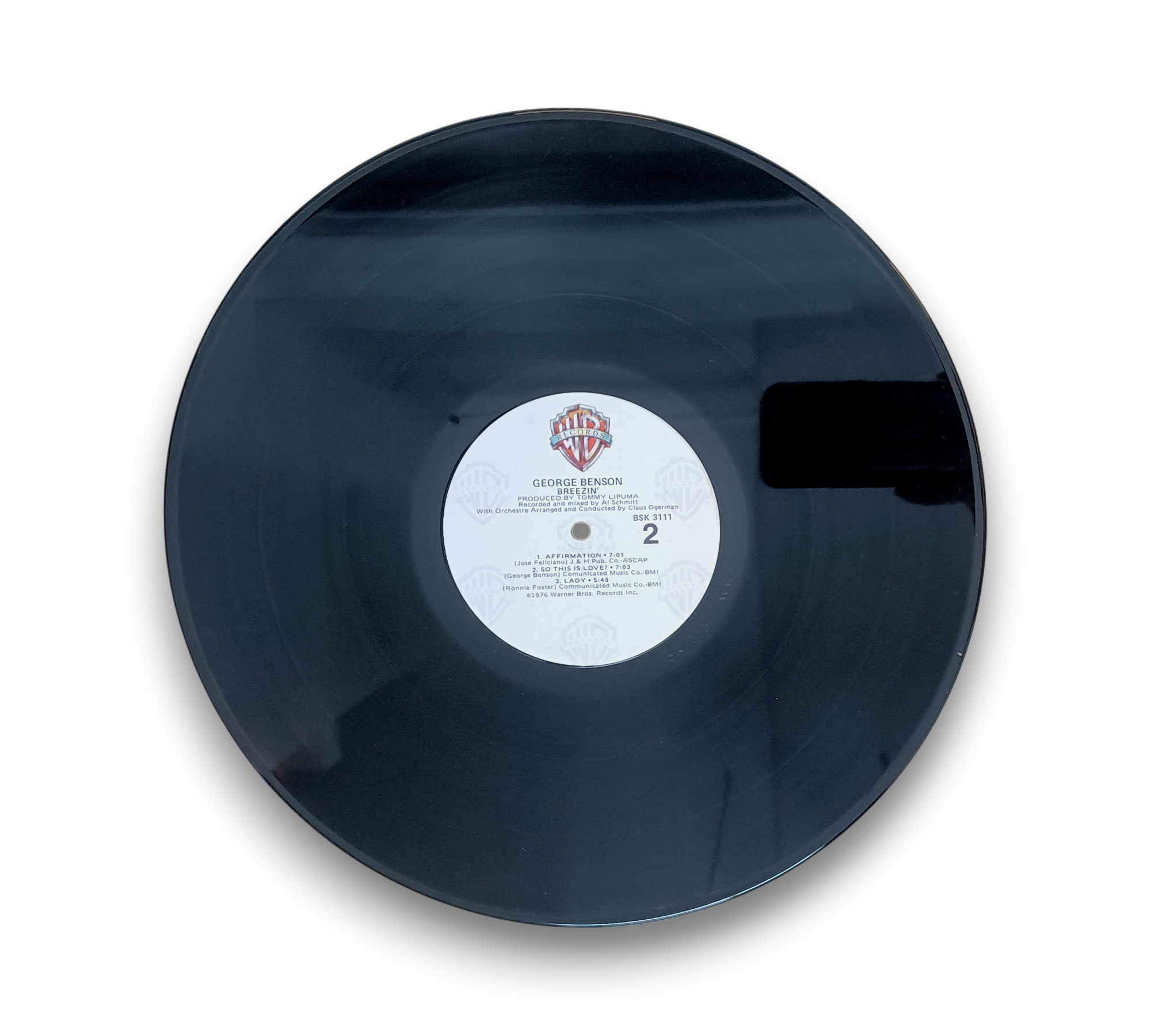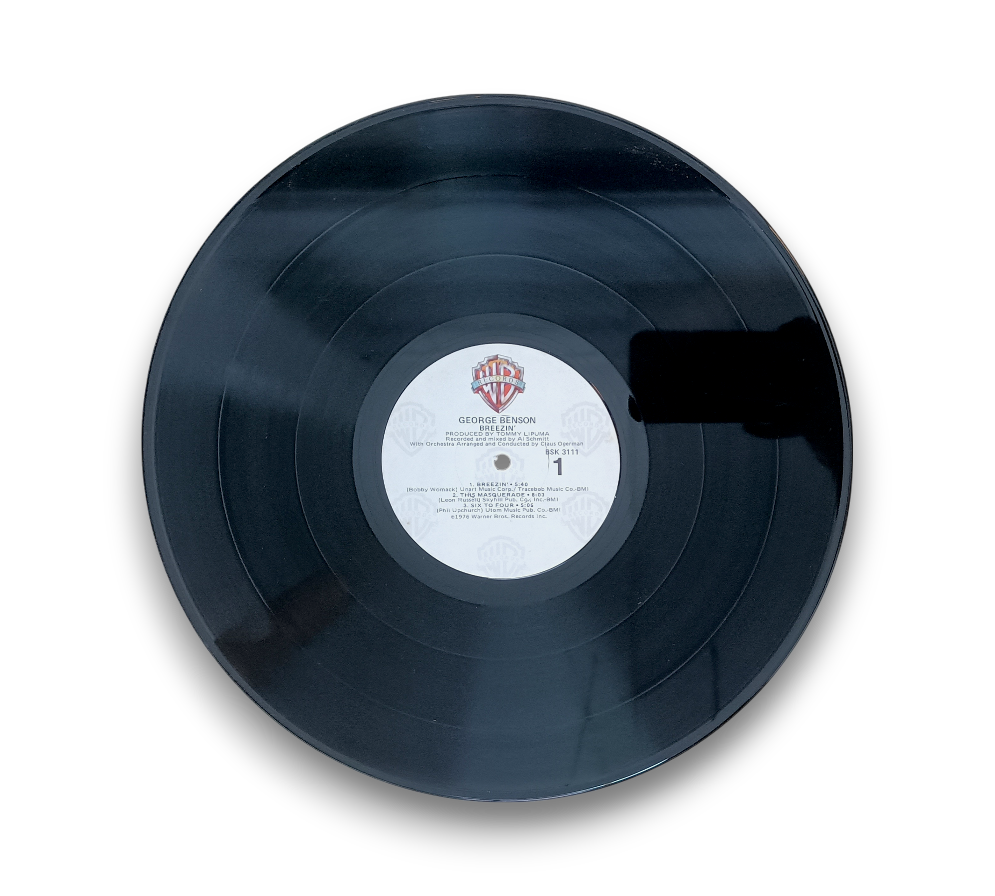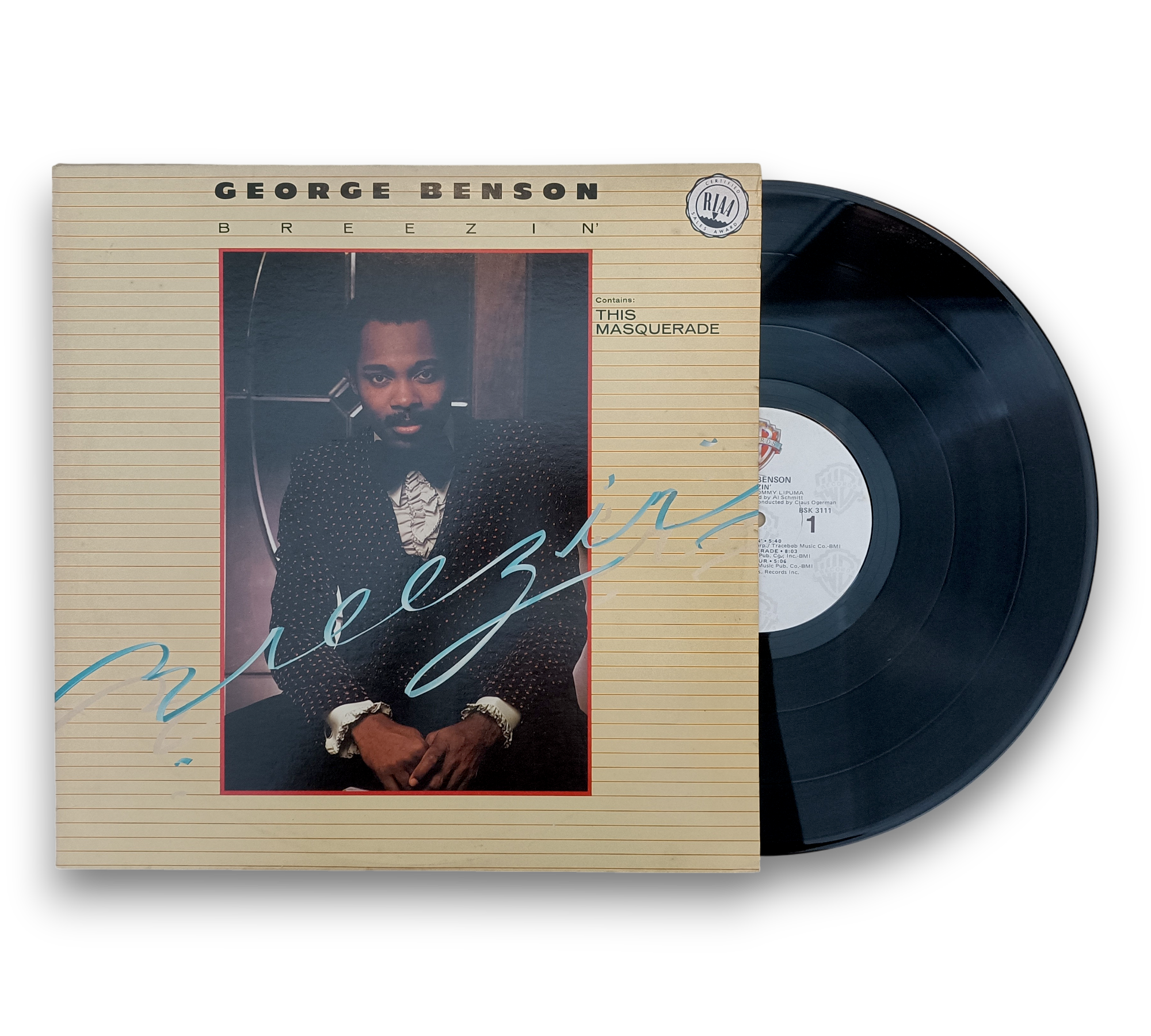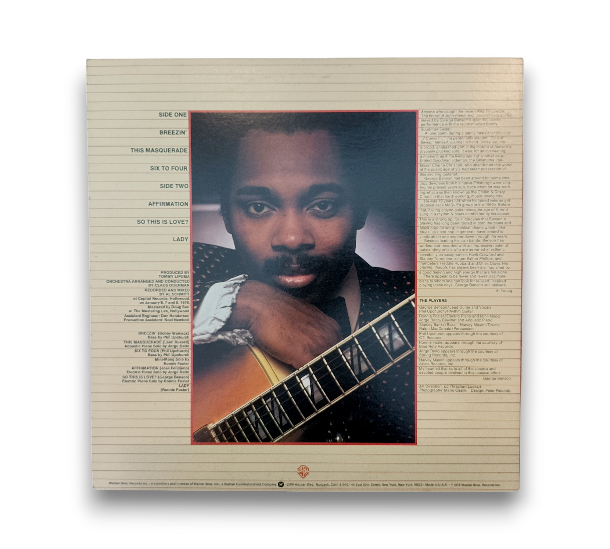 George Benson's "Breezin'" was recorded and mixed at Capital Records in Hollywood in January 1976 and mastered at The Mastering Lab, also in Hollywood. This album features tracks published by various music companies, showcasing contributions from notable artists such as Phil Upchurch, Ronnie Foster, Jorge Dalto, and Harvey Mason, each appearing courtesy of their respective labels. The record is identified as release #BSK 3111, and while the cover does include "Contains: This Masquerade," it does not feature the RIAA logo. For further details regarding the packaging and inserts, please refer to the accompanying photos.