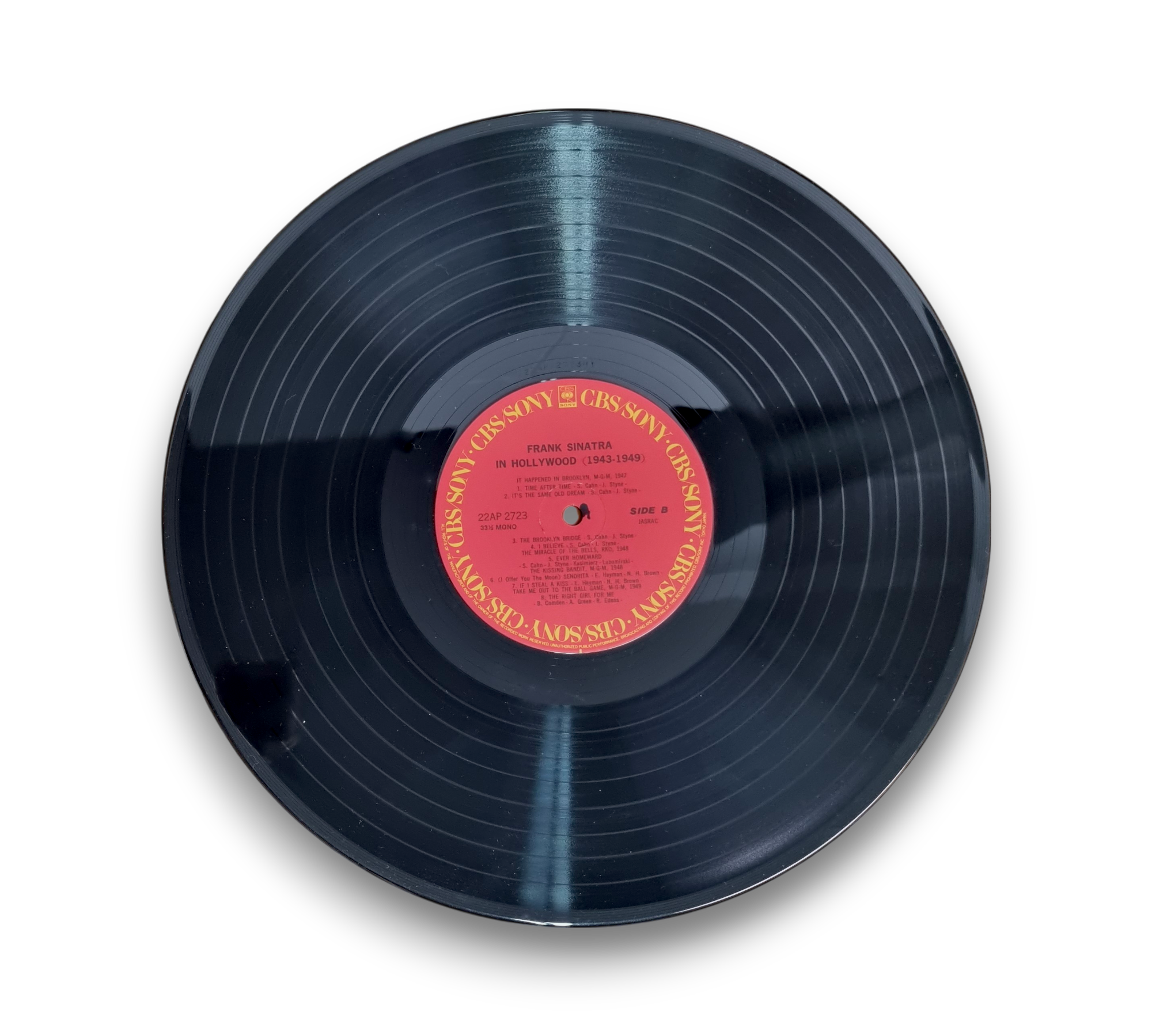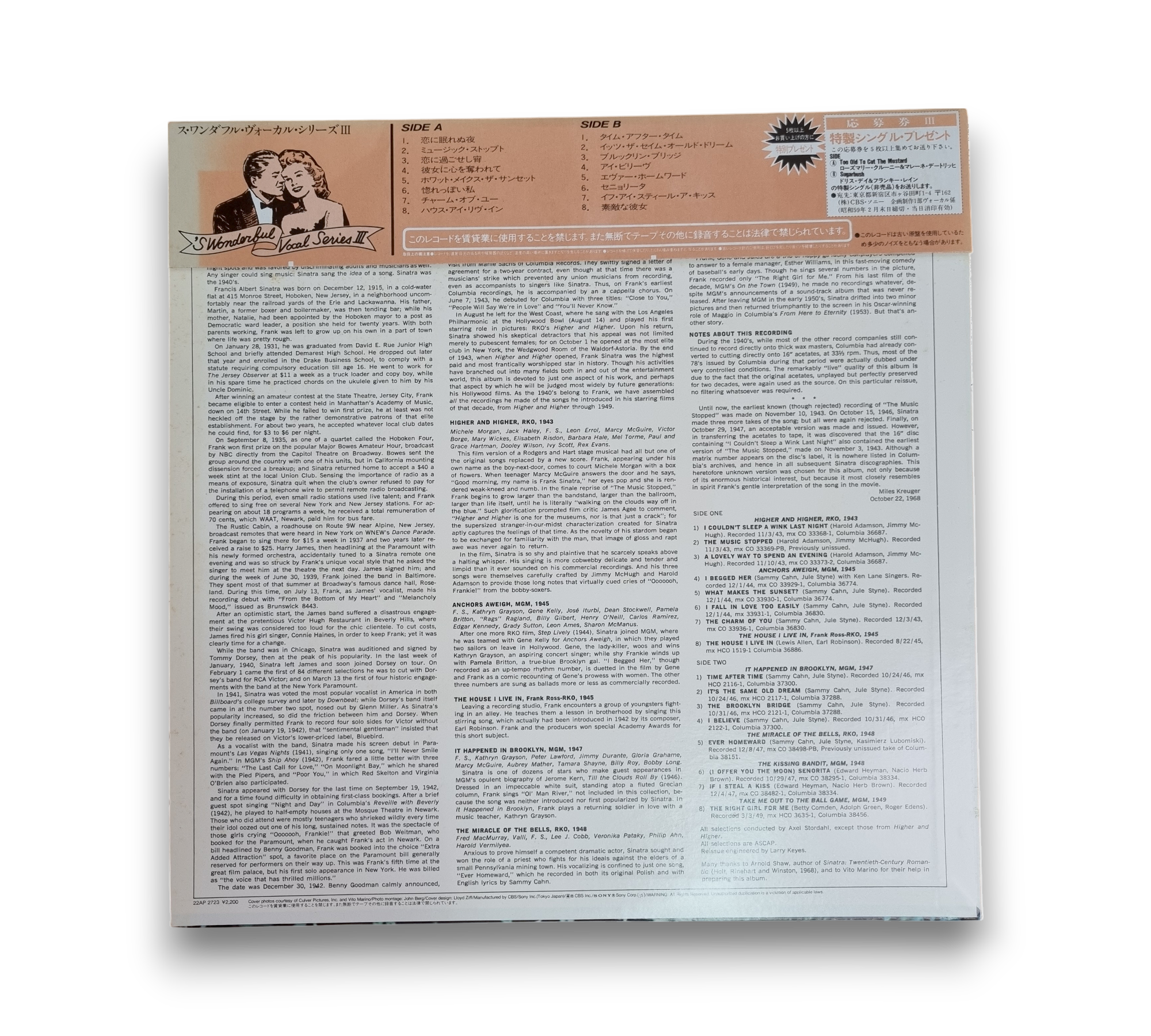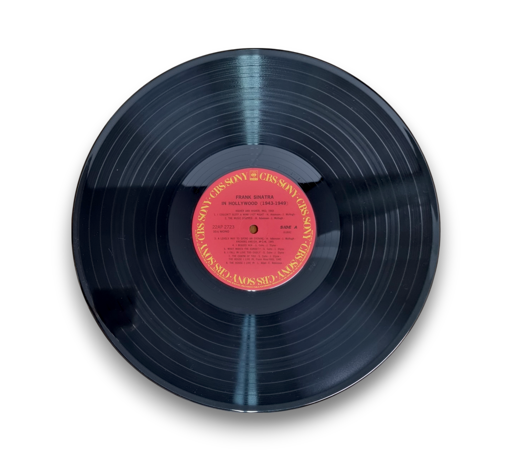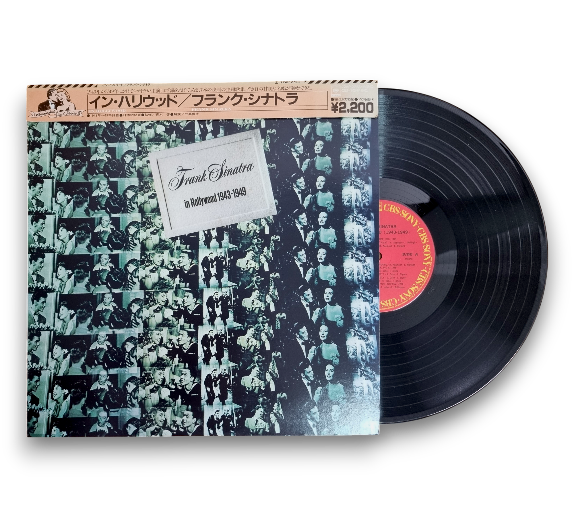 Made in Japan, this record features Frank Sinatra's performances from 1943 to 1949. The album showcases a collection of his iconic songs, capturing the essence of his artistry during this vibrant period. The cover art presents a collage of images, reflecting the glamour of Hollywood. For specific details regarding packaging and inserts, please refer to the accompanying photos.