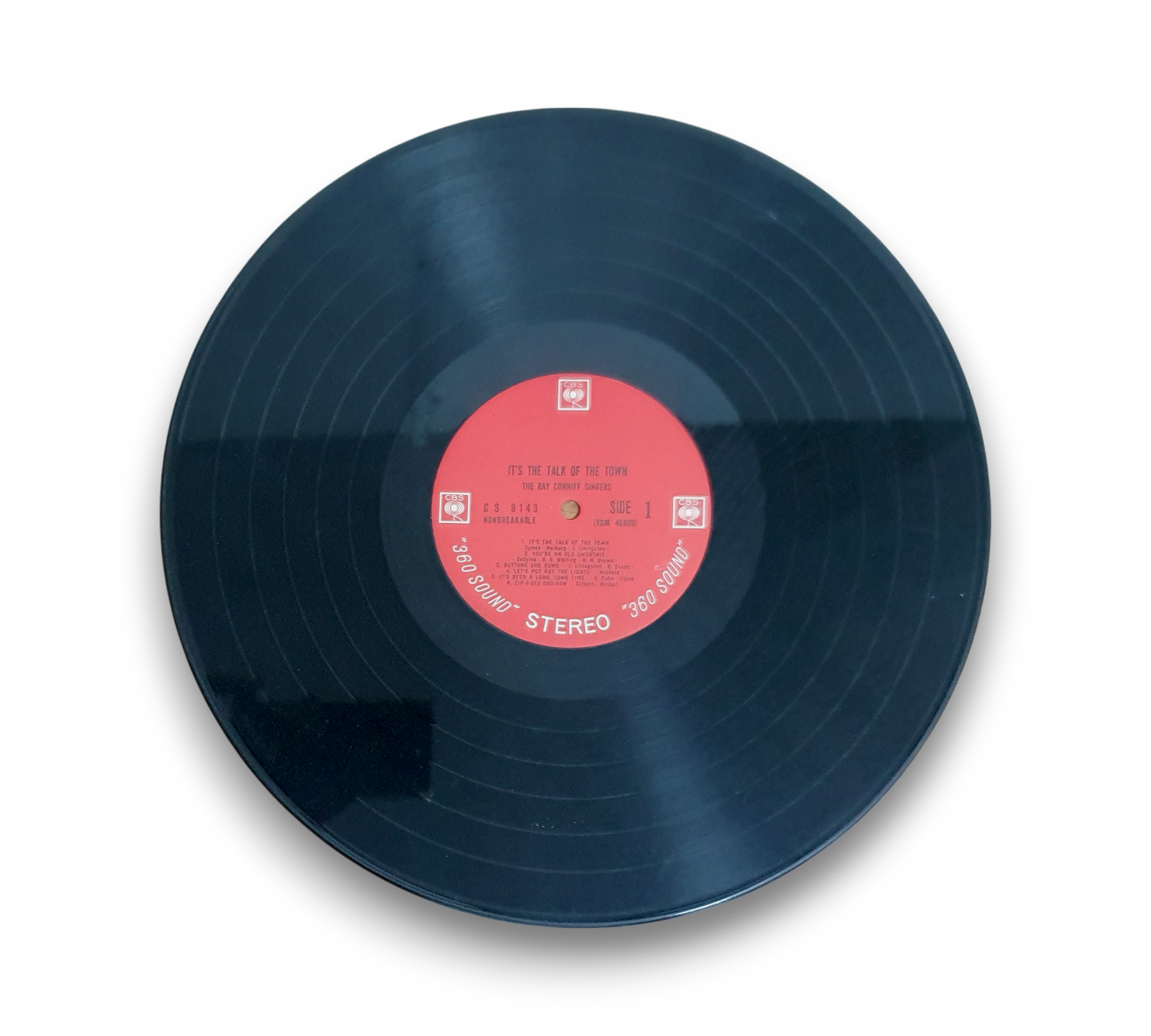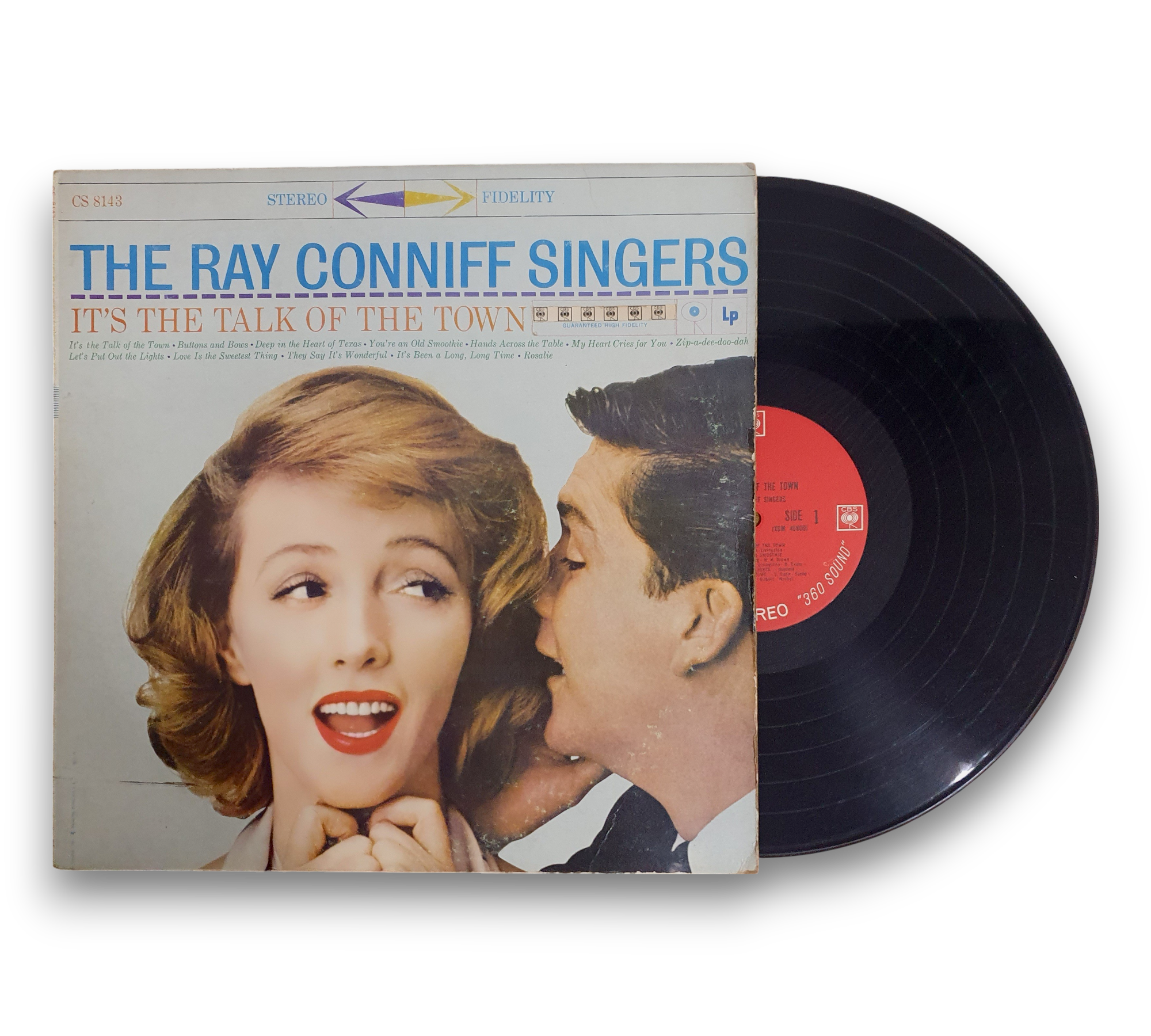 This listing features a red two-eye pressing of "It's the Talk of the Town" by The Ray Conniff Singers, showcasing the iconic black 360 sound label. The record is presented in a visually appealing cover, which complements the classic sound of the album. For further details regarding the condition and specifics of the packaging, please refer to the accompanying photos.