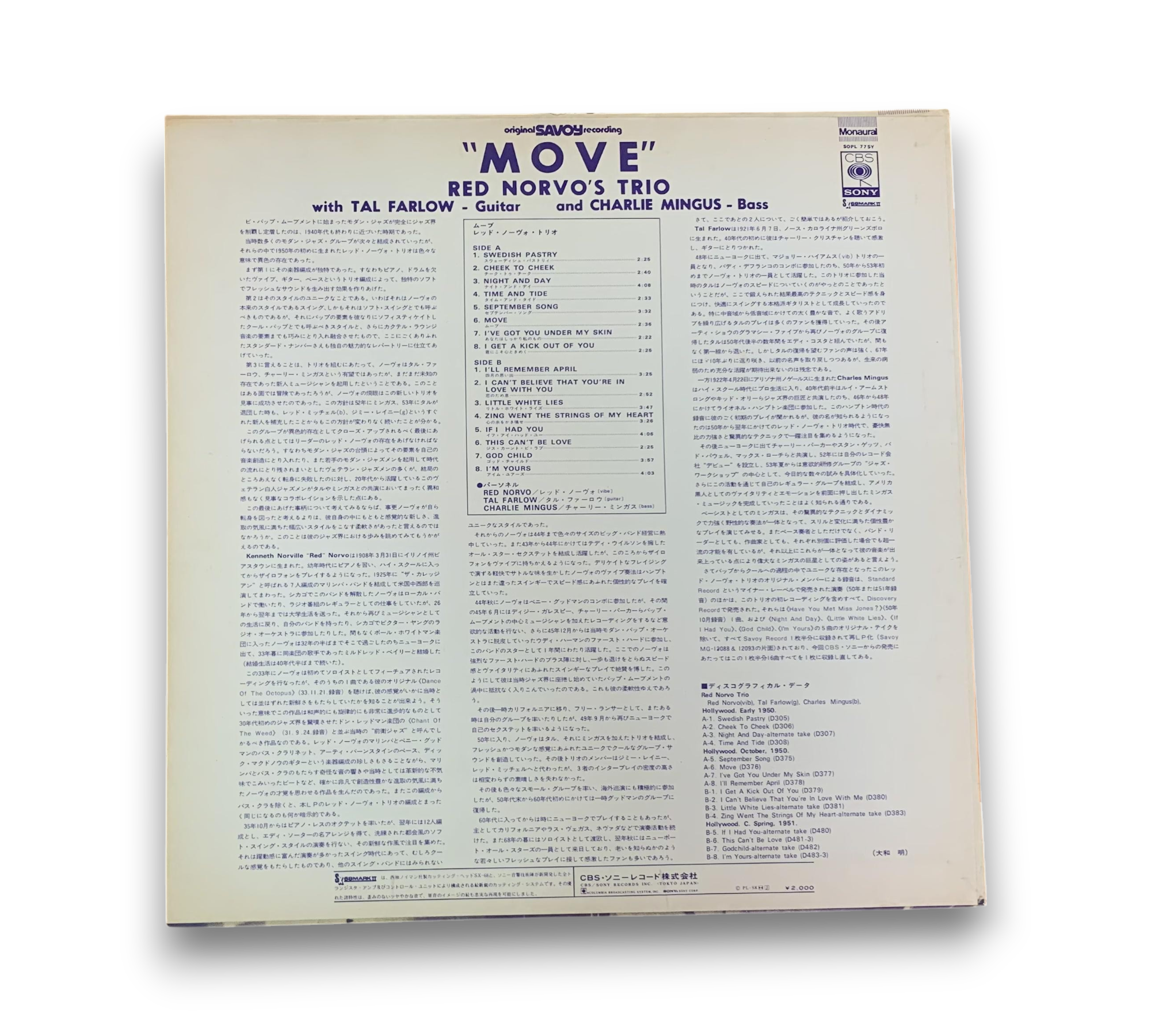 This listing features the extended Japanese version of "Move" by the Red Norvo Trio. The album includes tracks recorded in Hollywood during the early 1950s, with specific sessions noted from A1-A4 in the early 1950s, A5-B4 in October 1950, and B5-B8 in spring 1951. For further details regarding the packaging and inserts, please refer to the accompanying photos.