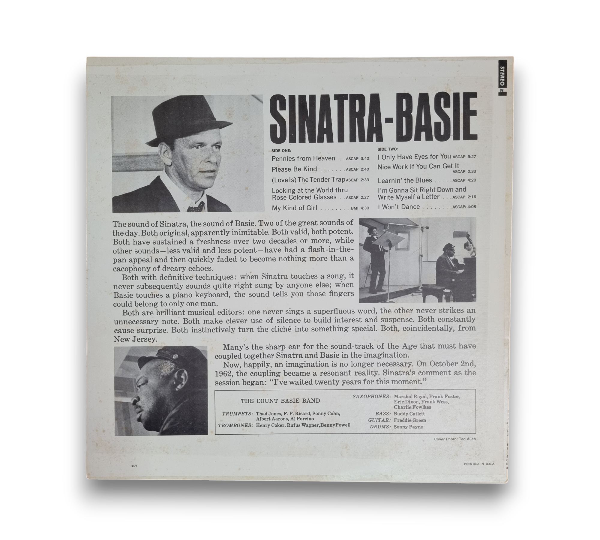 This listing features the album "Sinatra-Basie," a collaboration between Frank Sinatra and Count Basie, originally released in 1962 and reissued in 1981. The front cover and spine indicate the catalog number R9-1008, while the back cover and record labels show FS-1009. The record comes with a plastic sleeve that advertises other Sinatra releases, and the copyright mark on the sleeve is dated 1981. For further details regarding the condition and specifics of the packaging, please refer to the accompanying photos.