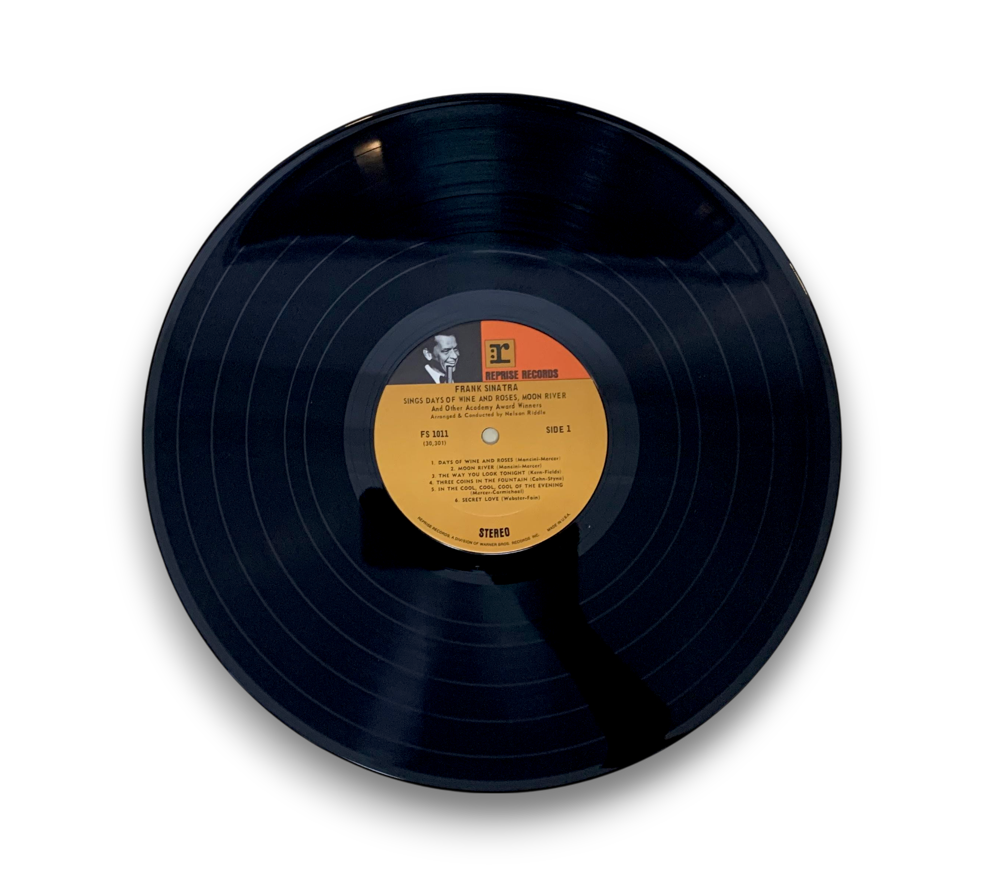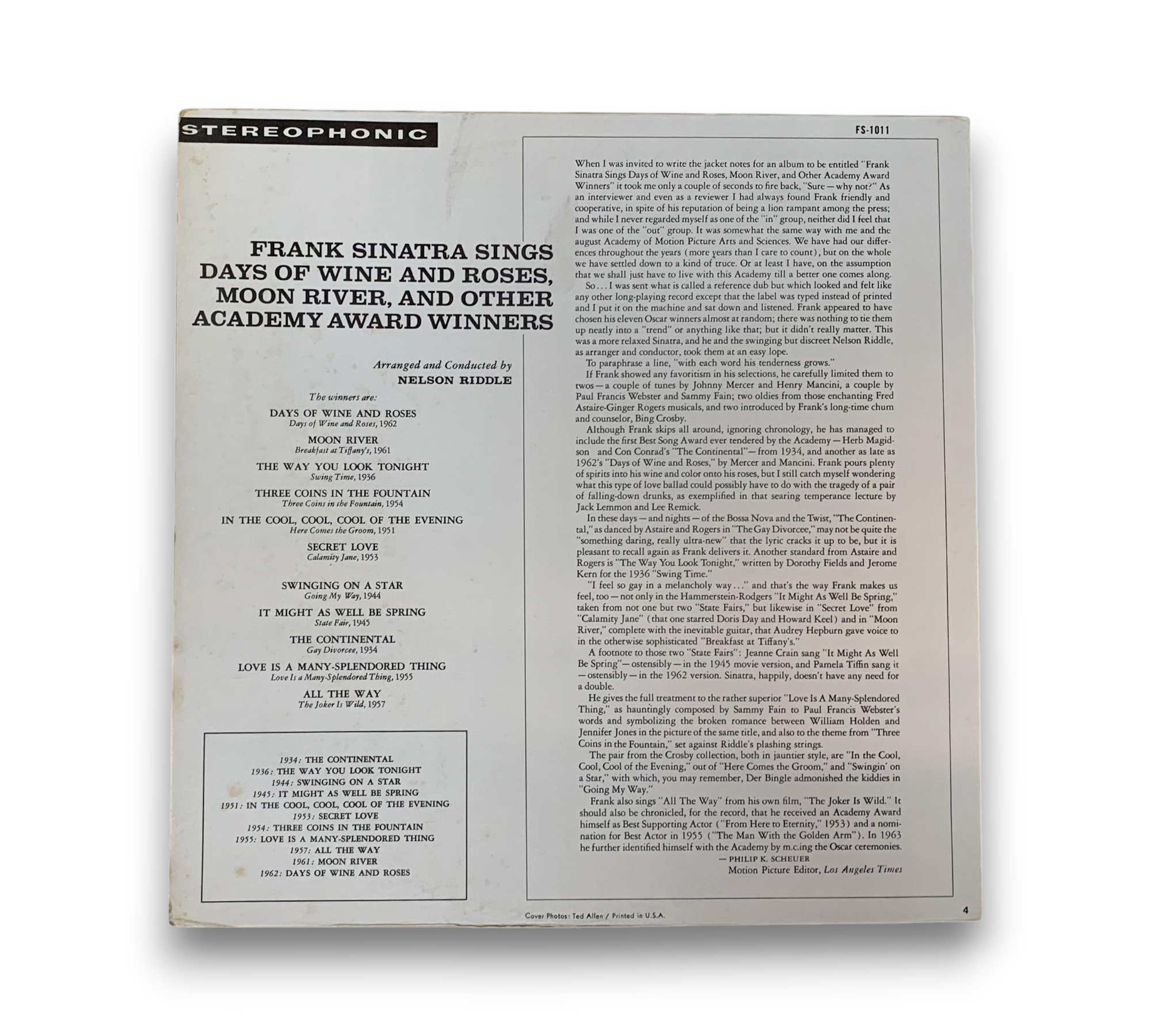 Frank Sinatra's album "Days of Wine and Roses, Moon River and Other Academy Award Winners" features a collection of timeless classics that have won prestigious Academy Awards. The record includes iconic tracks such as "Days of Wine and Roses," "Moon River," and "The Way You Look Tonight," showcasing Sinatra's exceptional vocal talent. Arranged and conducted by Nelson Riddle, this album captures the essence of Hollywood's golden age. For detailed visuals of the packaging and inserts, please refer to the accompanying photos.