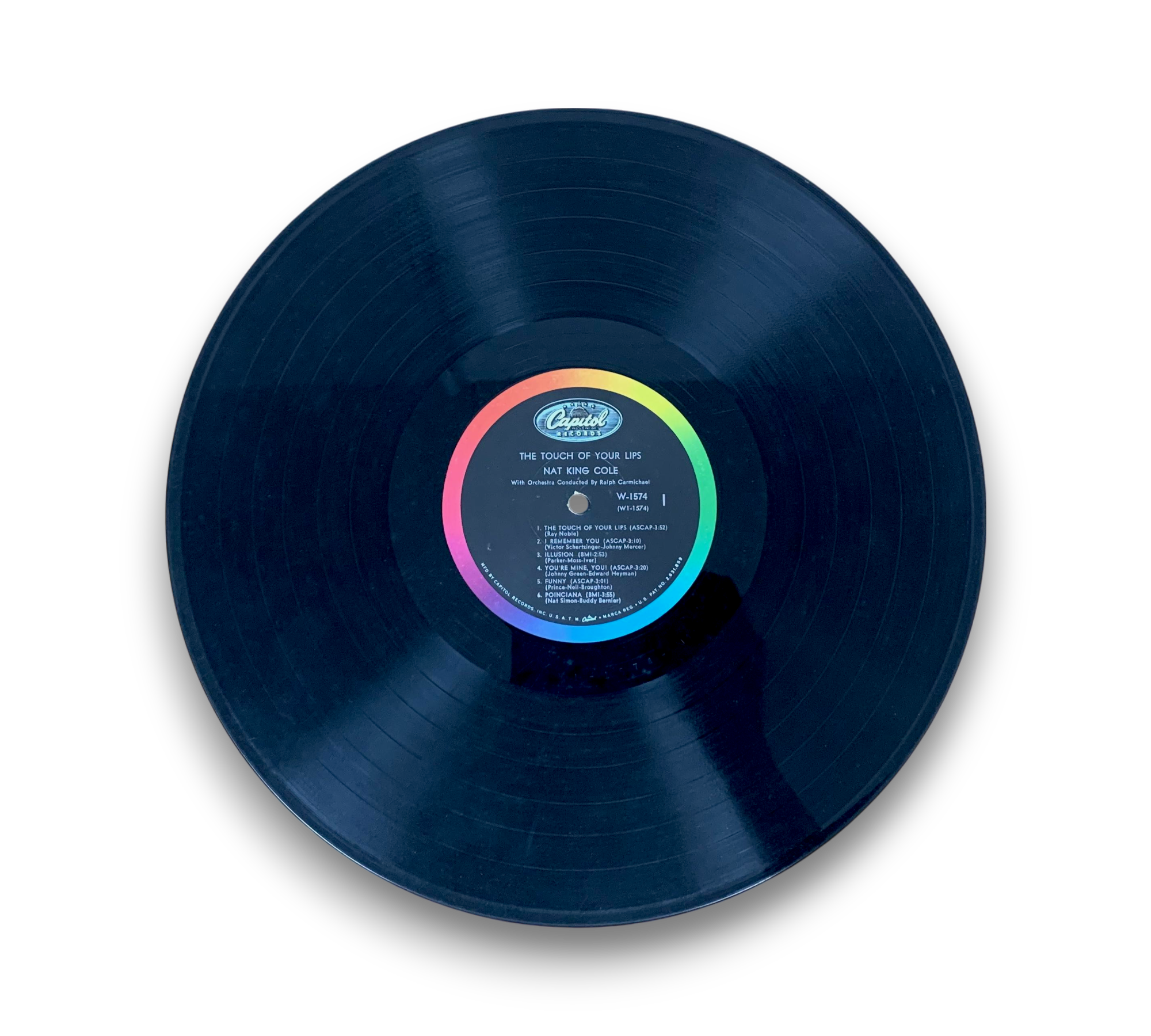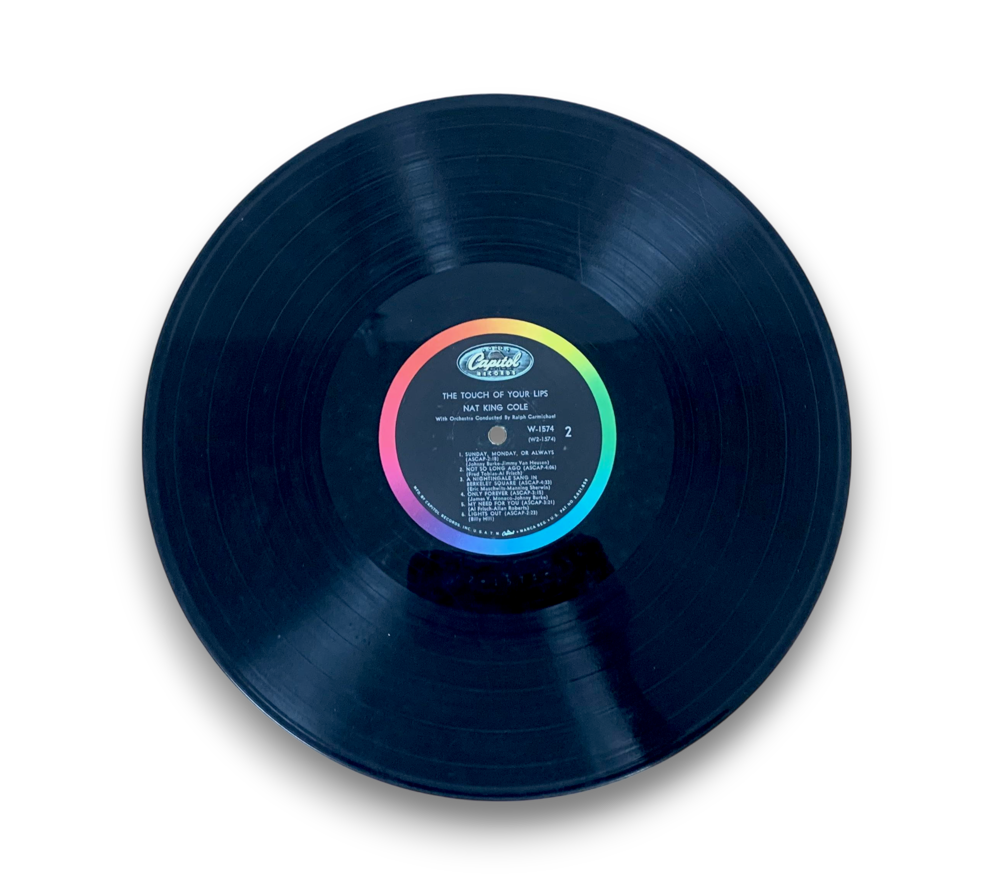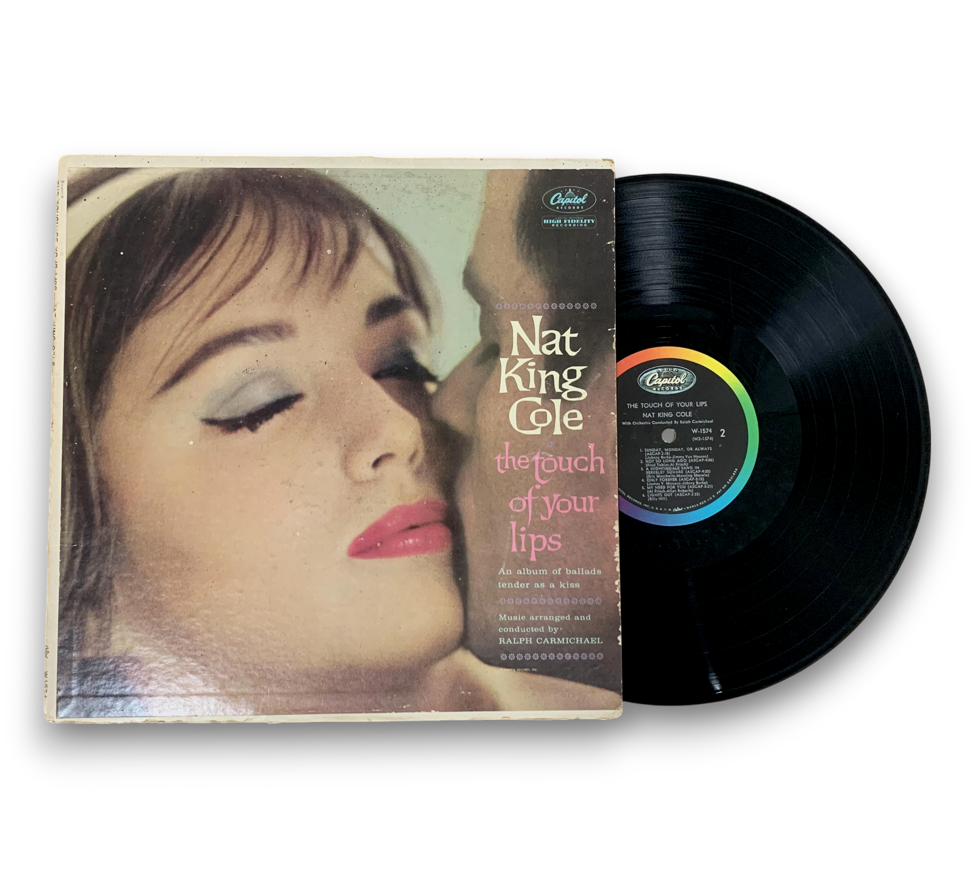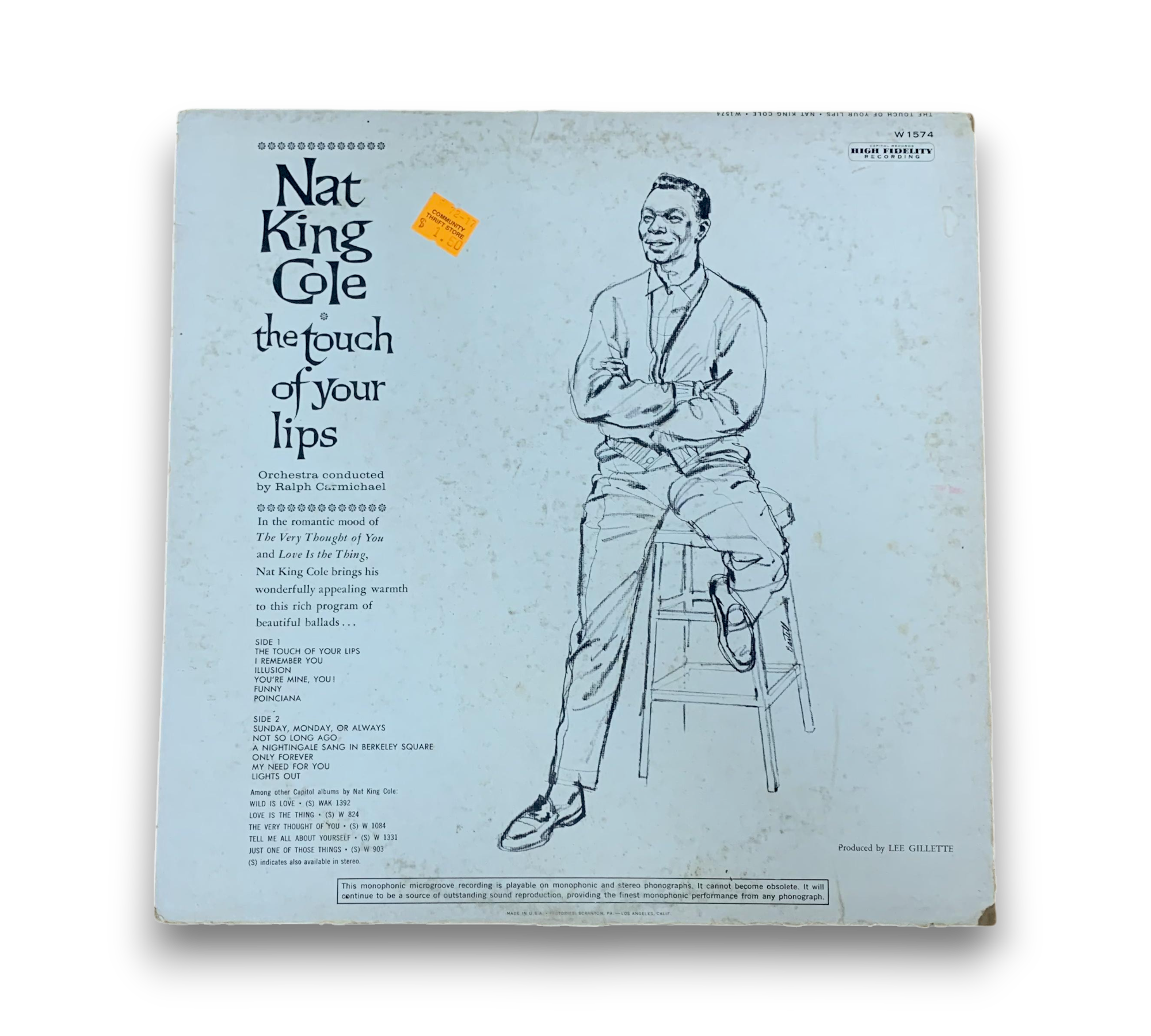 This listing features a Capitol Records Scranton pressing of Nat King Cole's album "The Touch of Your Lips," catalog number W1574, as indicated by the deadwax stamping on both sides. The back cover notes that this monophonic microgroove recording is playable on both monophonic and stereo phonographs. For further details regarding the condition and any included packaging, please refer to the accompanying photos.