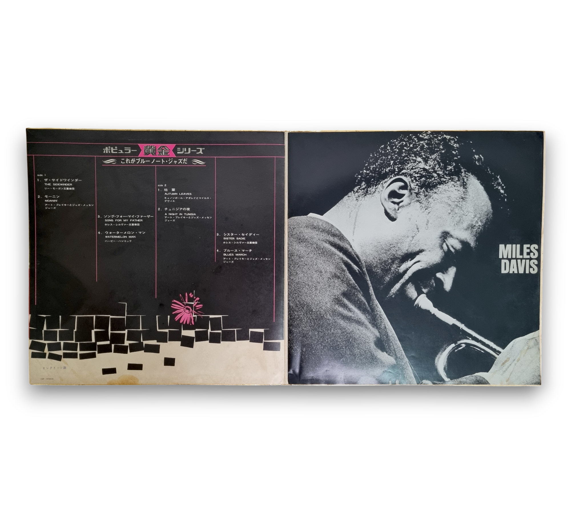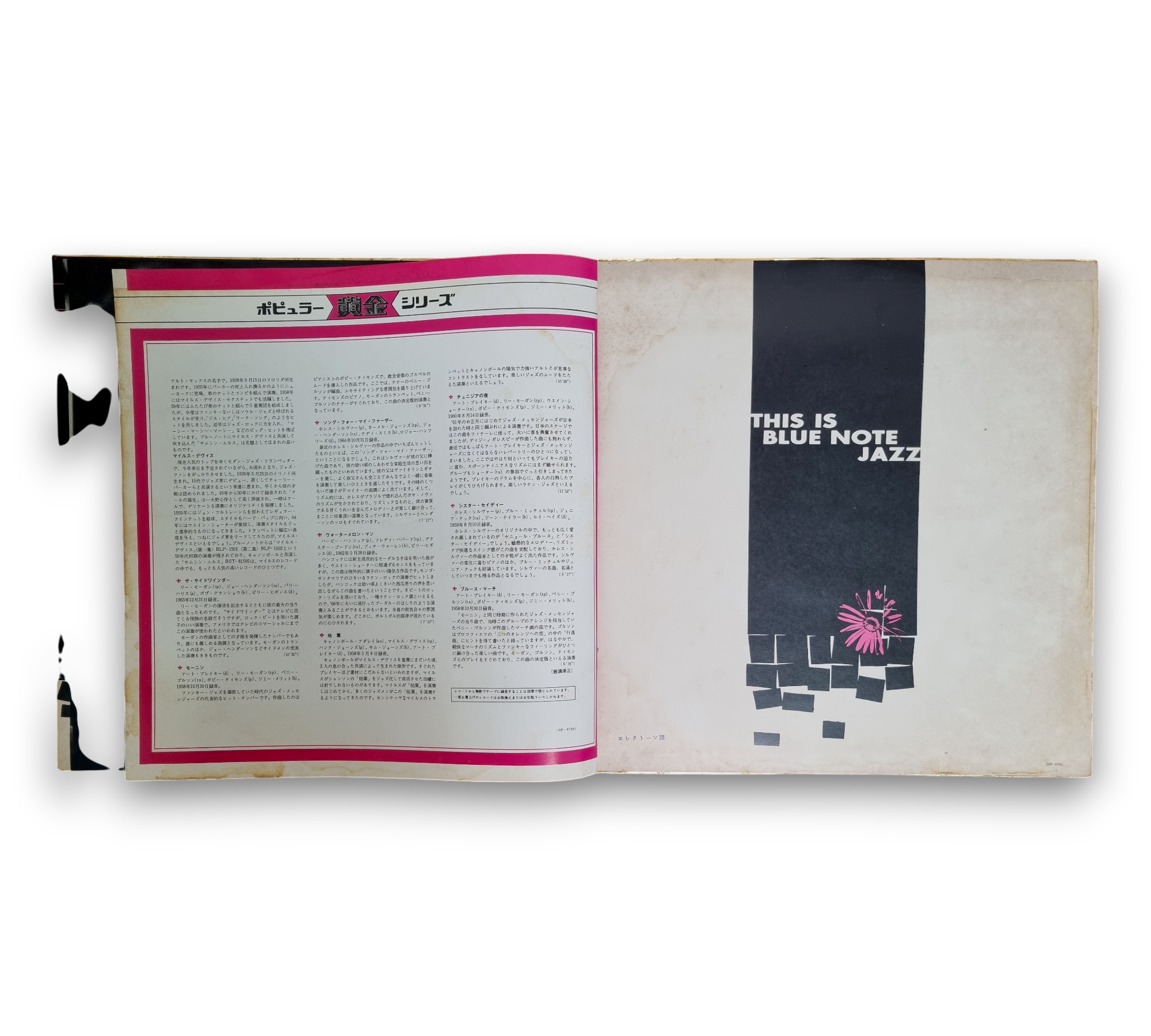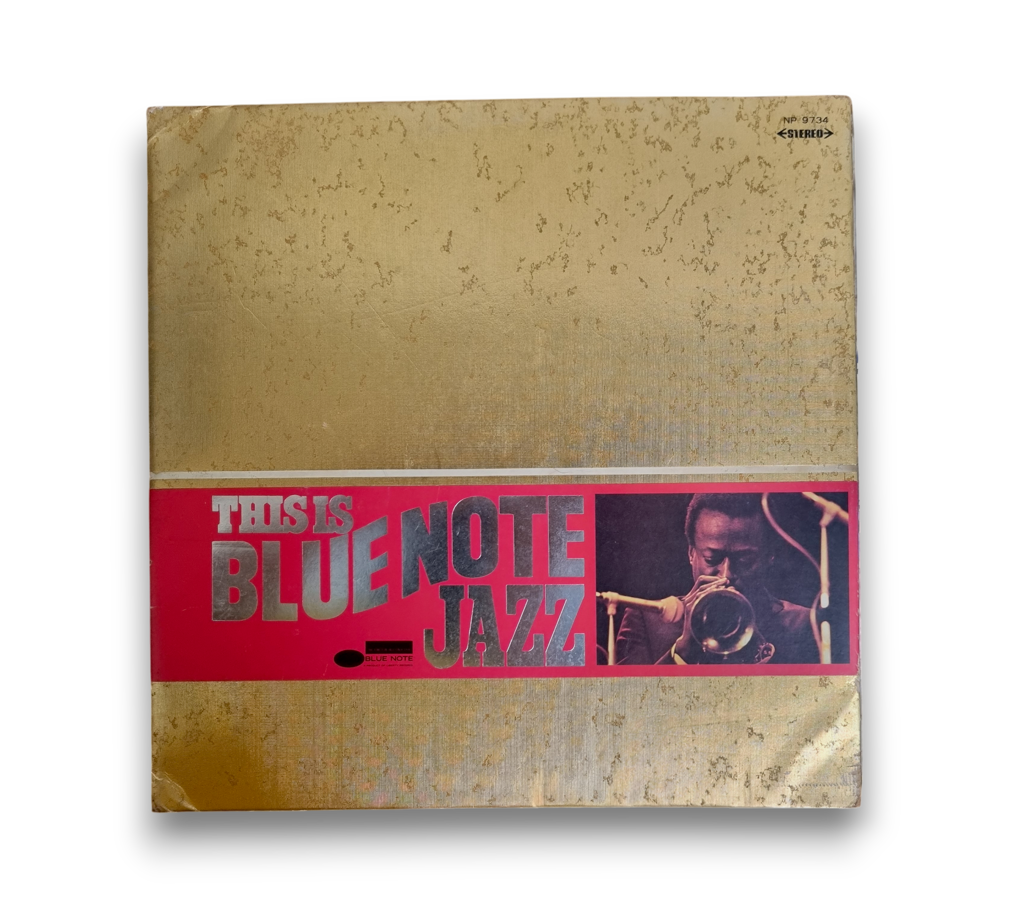 This record is presented in a textured gold gatefold sleeve, featuring the title "This Is Blue Note Jazz." Inside, it includes an 8-page booklet that contains black and white photographs of notable jazz musicians, along with Japanese liner notes. The release is part of the Popular Golden Series, catalog number NP-9734. For further details regarding the condition and contents, please refer to the accompanying photos.