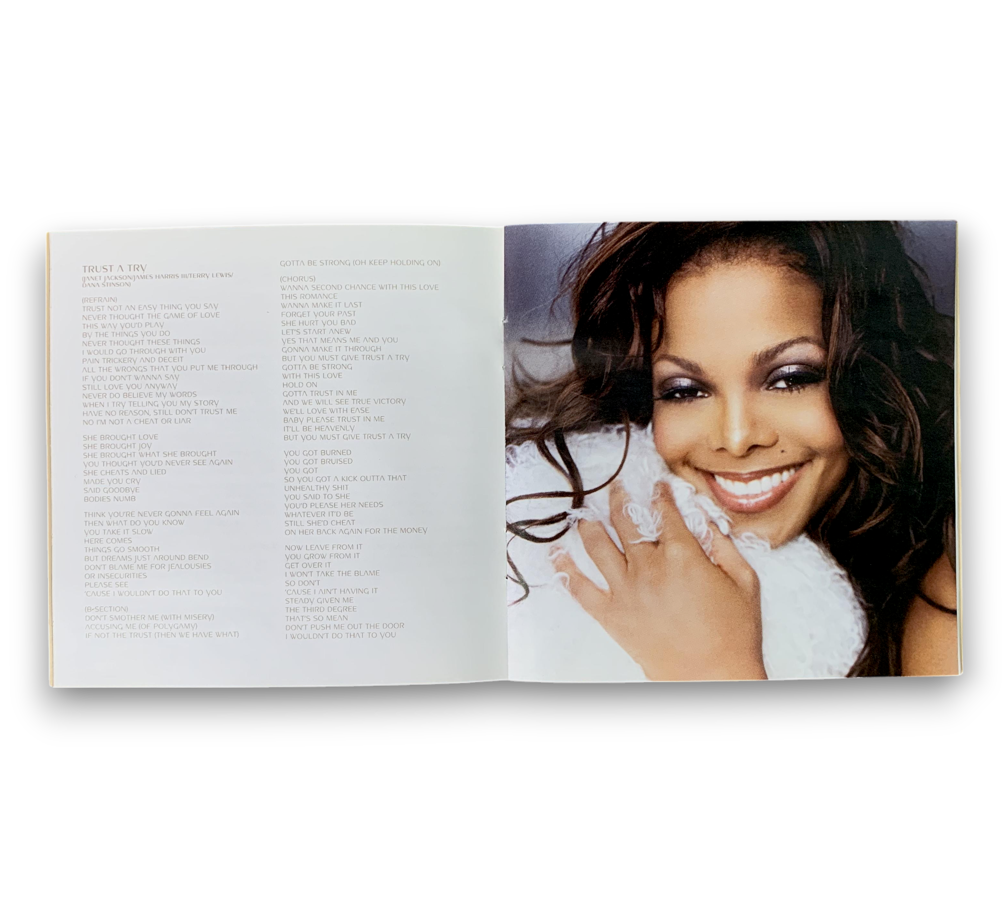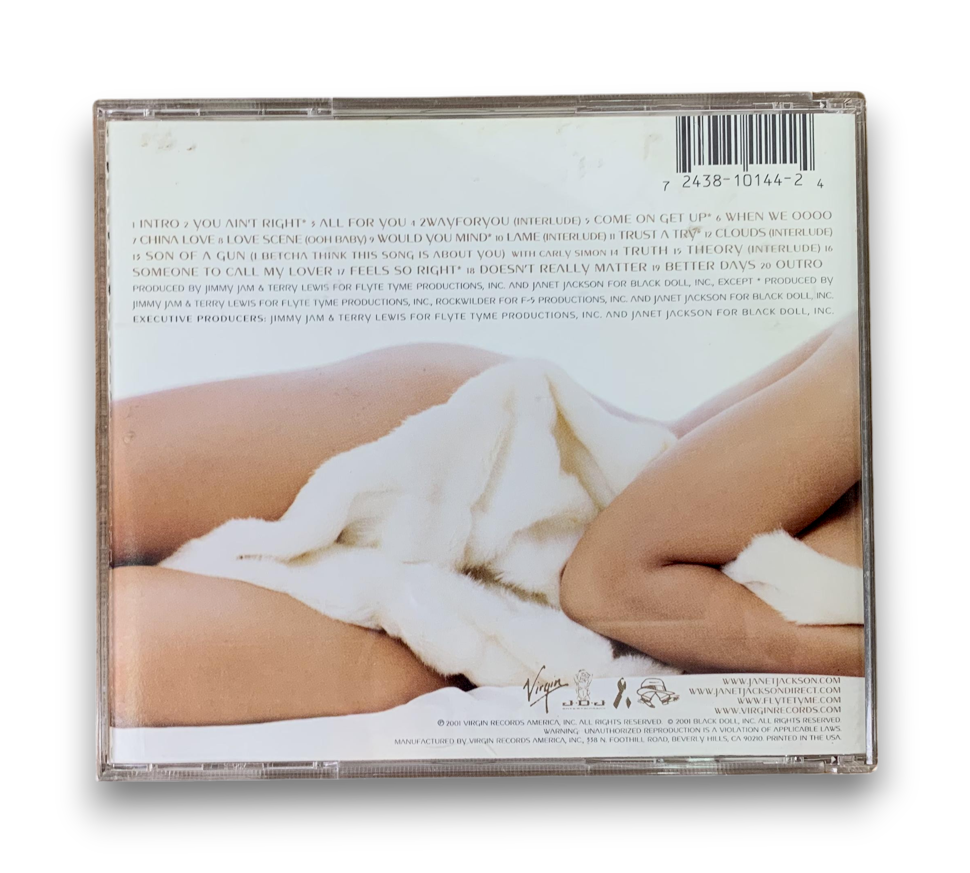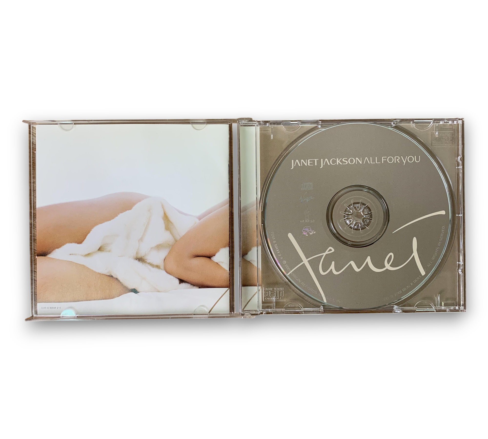 This listing features Janet Jackson's album "All for You," released in 2001 by Virgin Records America, Inc. The album showcases a blend of R&B and pop, with production primarily by Flyte Tyme Productions, Inc. and Black Doll, Inc. The tracks were recorded at various studios, including Westlake Audio and Flyte Tyme Studios, and the album was mastered at Bernie Grundman Mastering. The included images depict the album cover, back cover, and an inner booklet featuring lyrics, along with the disc itself. For further details regarding the packaging and inserts, please refer to the accompanying photos.