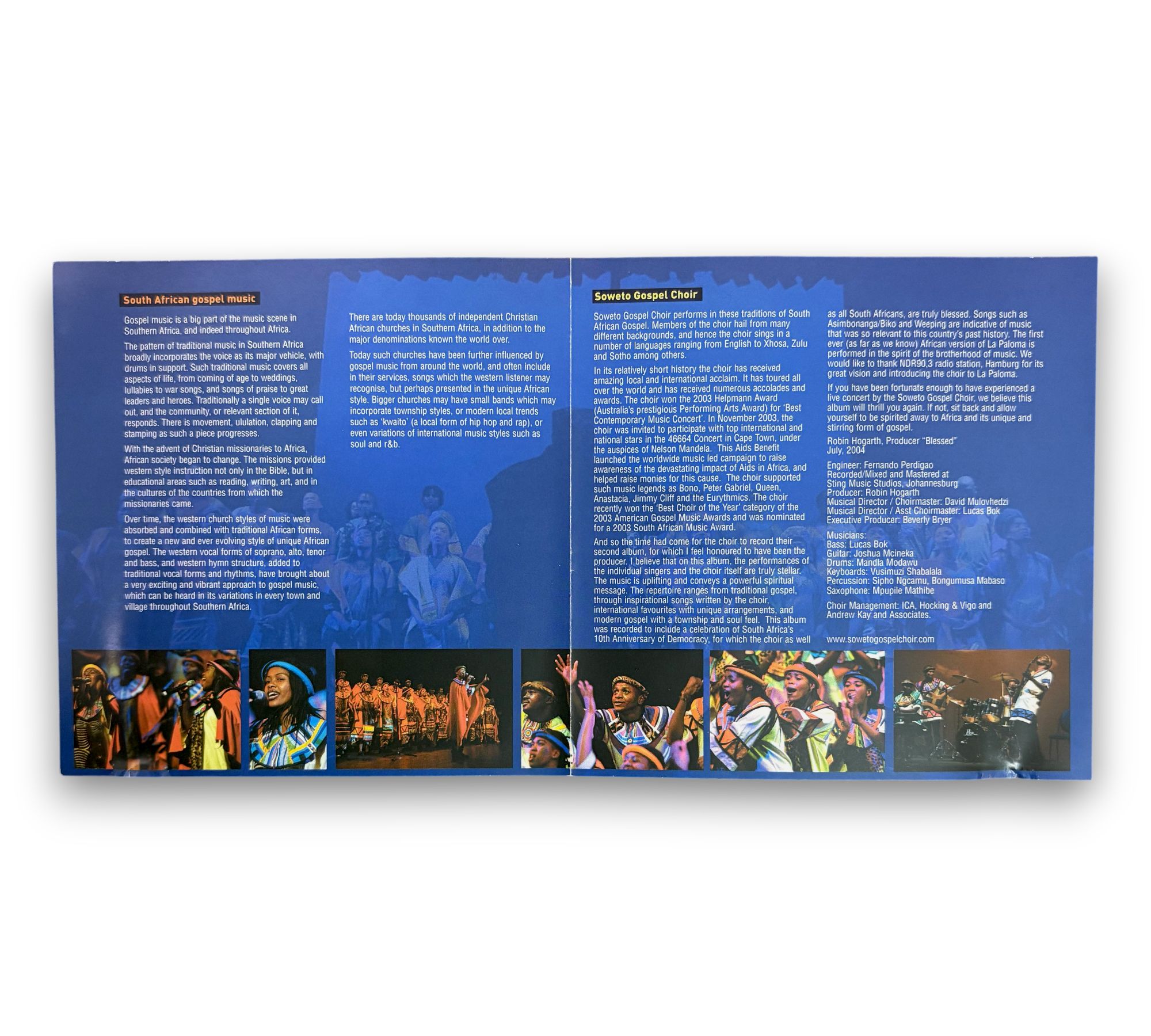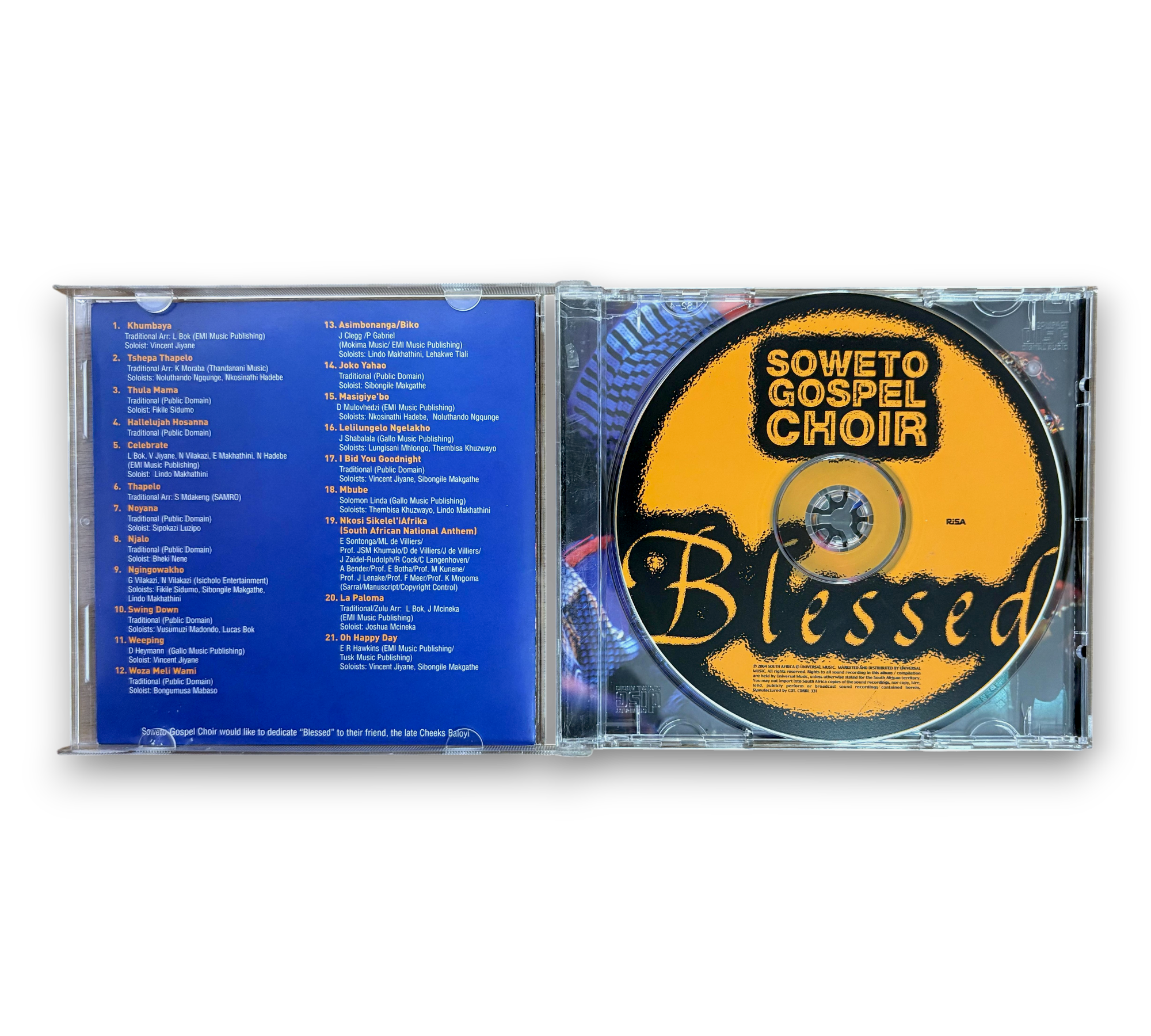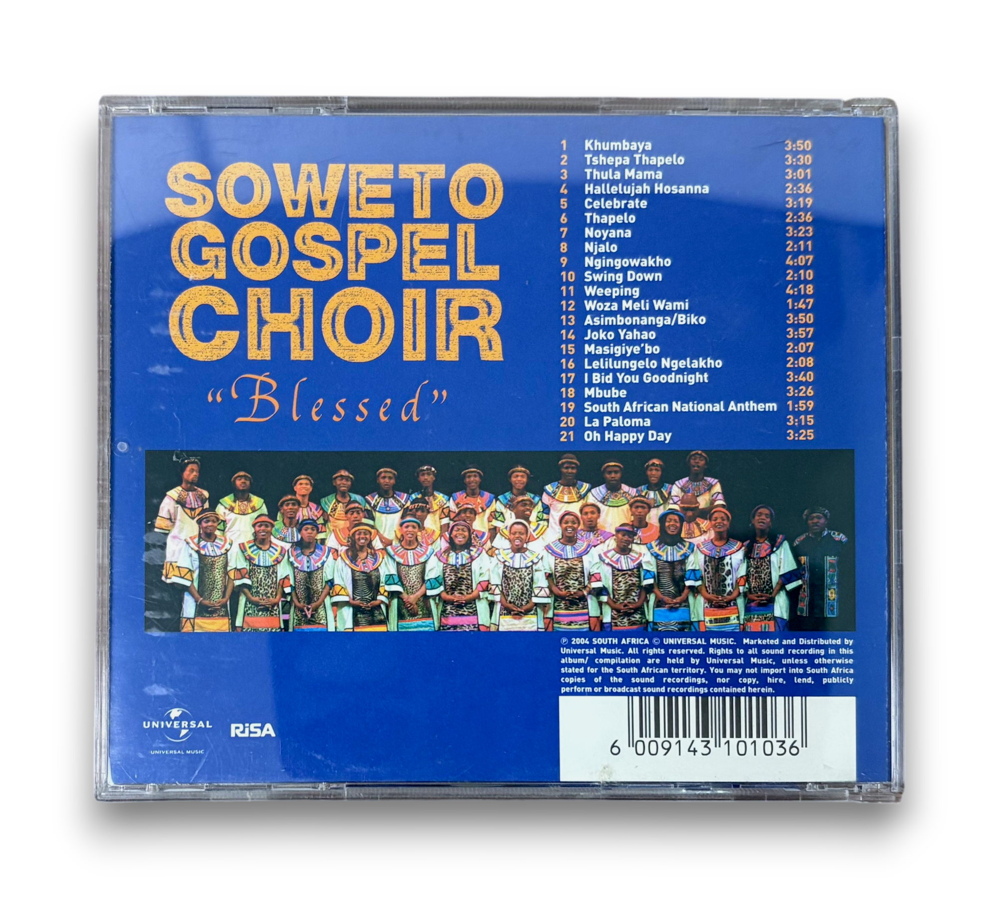 Experience the uplifting harmonies of the Soweto Gospel Choir with their vibrant album "Blessed," released in 2005. This CD features a diverse collection of tracks, including "Khumbaya," "Hallelujah Hosanna," and "Oh Happy Day," showcasing the choir's rich gospel sound. The album comes with an insert, and for more details on packaging, please refer to the accompanying photos. A must-have for fans of world music and gospel!