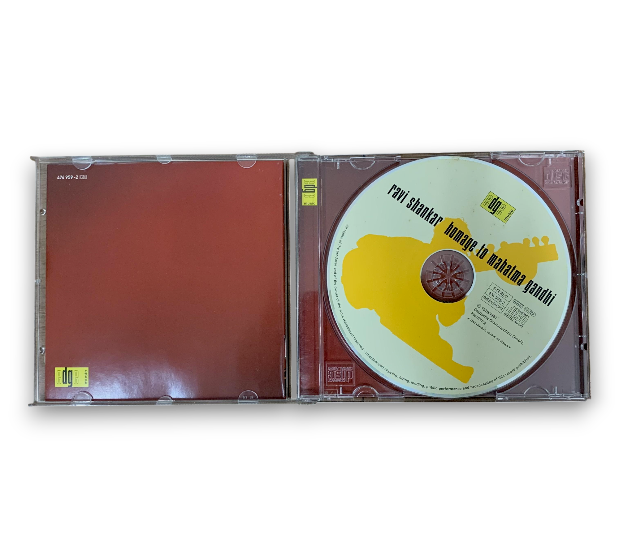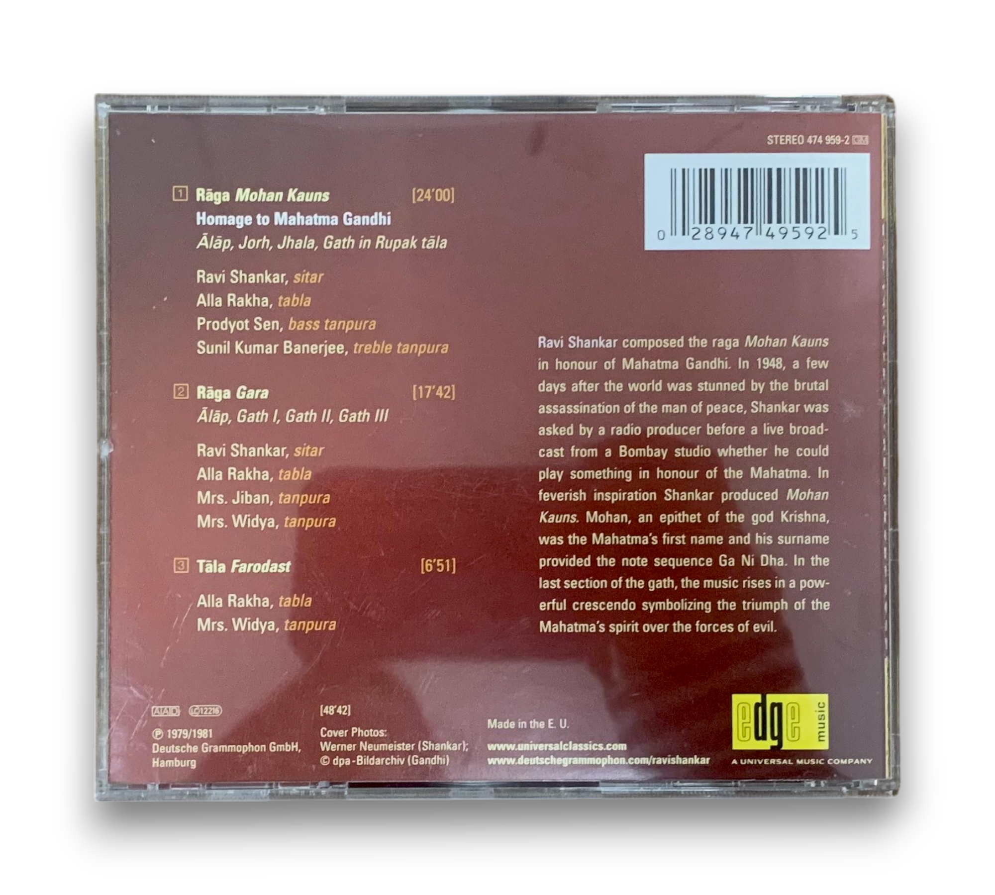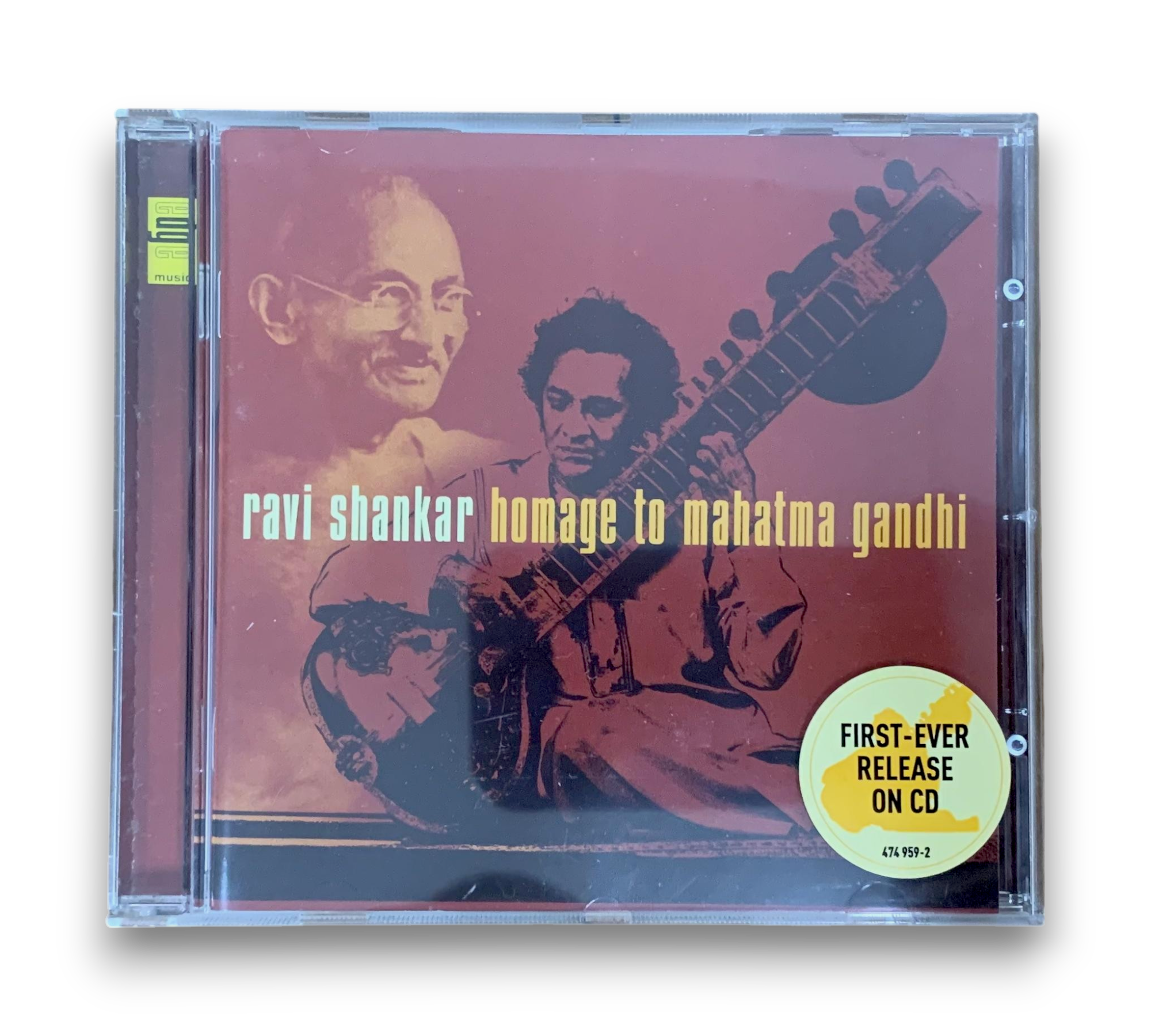 Ravi Shankar's "Homage to Mahatma Gandhi," released by Deutsche Grammophon GmbH in 1979/1981, features a collection of evocative ragas that pay tribute to the iconic leader. The CD includes three tracks: "Raga Mohan Kauns," "Raga Gara," and "Tala Farodast," showcasing Shankar's mastery of the sitar alongside talented musicians. The album is noted for its rich cultural significance and musical depth, reflecting Shankar's inspiration drawn from Gandhi's legacy. For further details regarding the packaging and inserts, please refer to the accompanying photos.