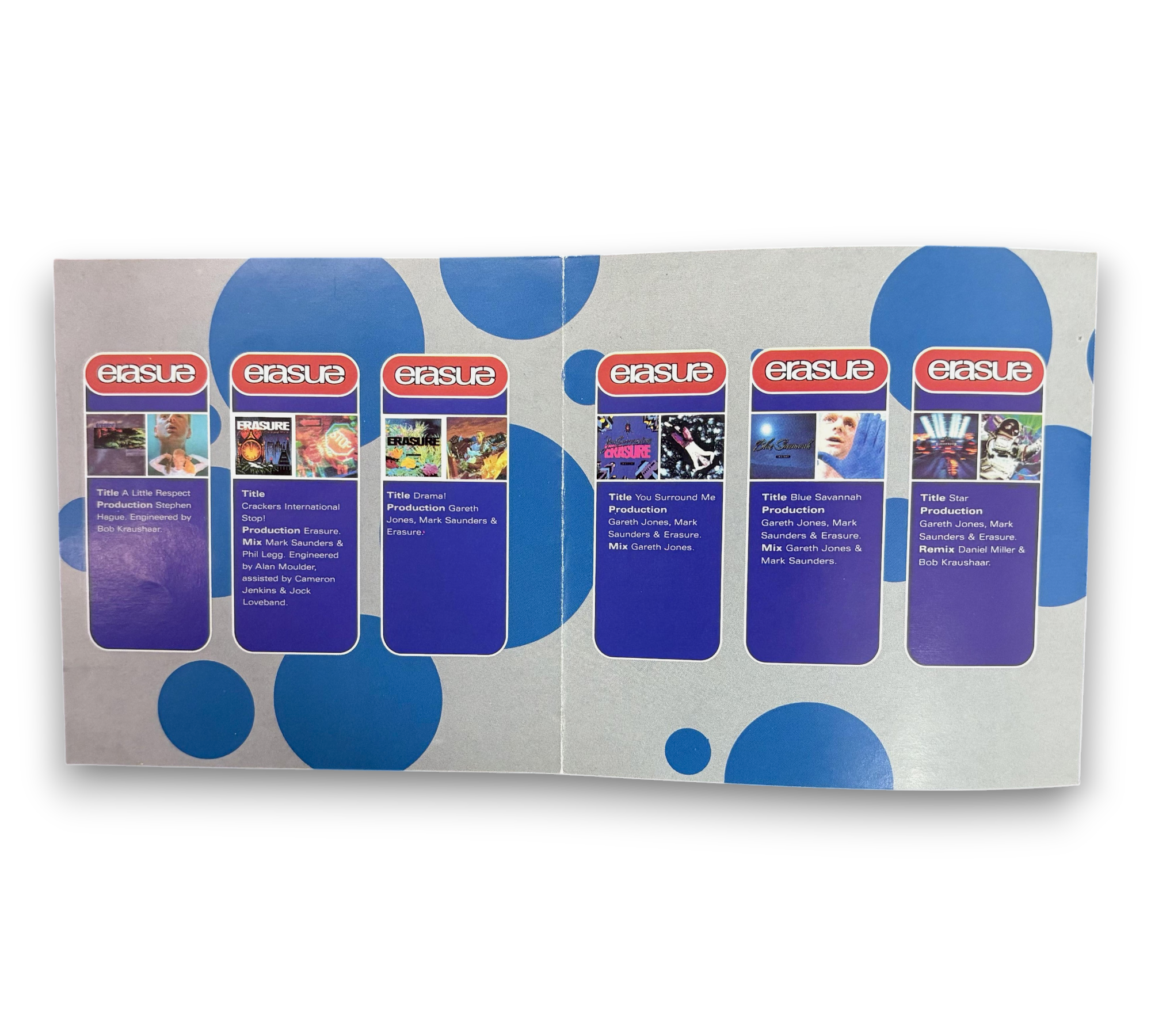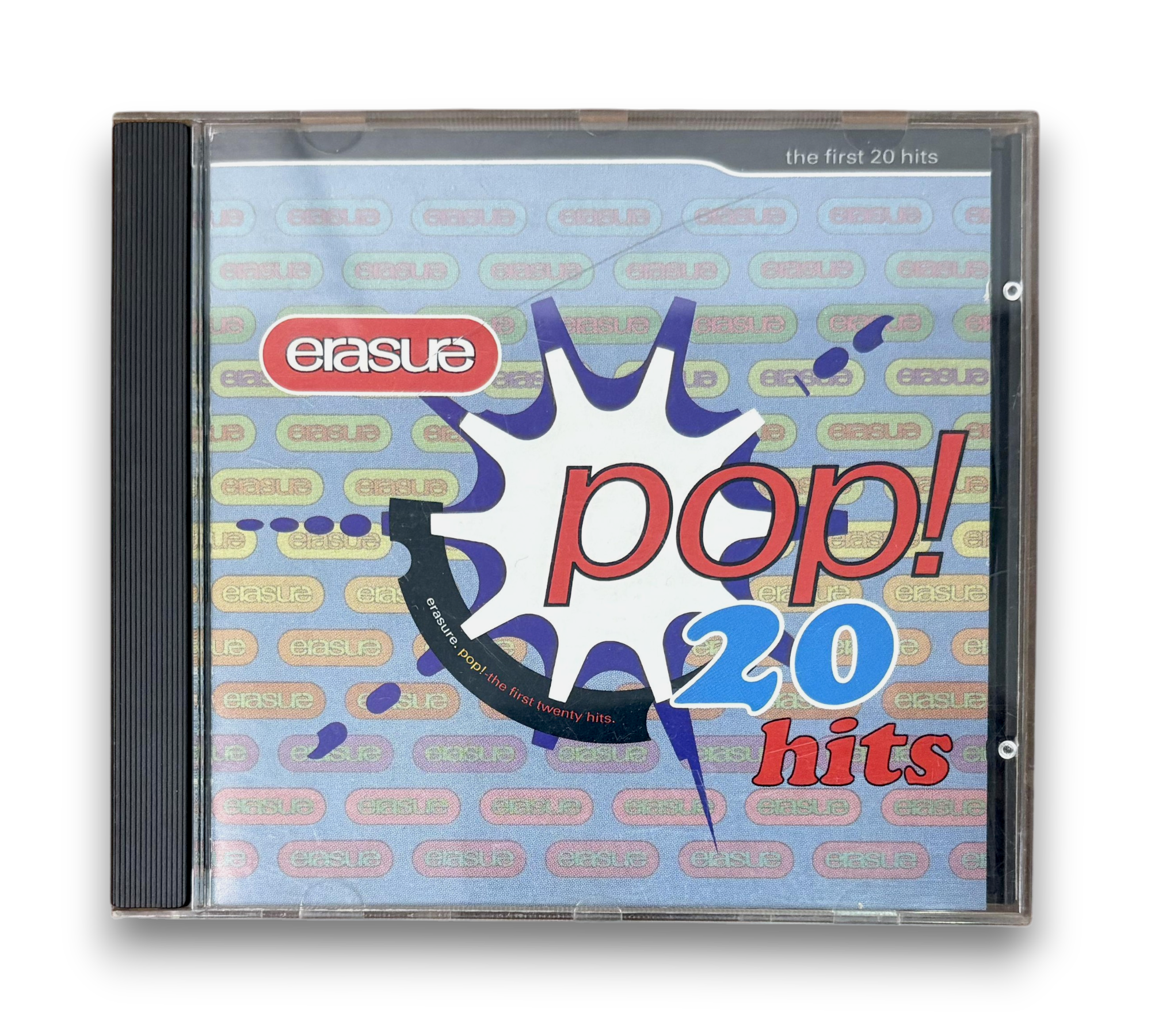This listing features the album "Pop! The First 20 Hits" by Erasure, released by Sire Records in 1992. The CD is a repress, identifiable by its light blue spines and the repositioned barcode on the rear cover. The packaging includes a booklet with detailed production credits for each track, showcasing the band's notable hits. For a closer look at the condition and specific details of the packaging, please refer to the accompanying photos.