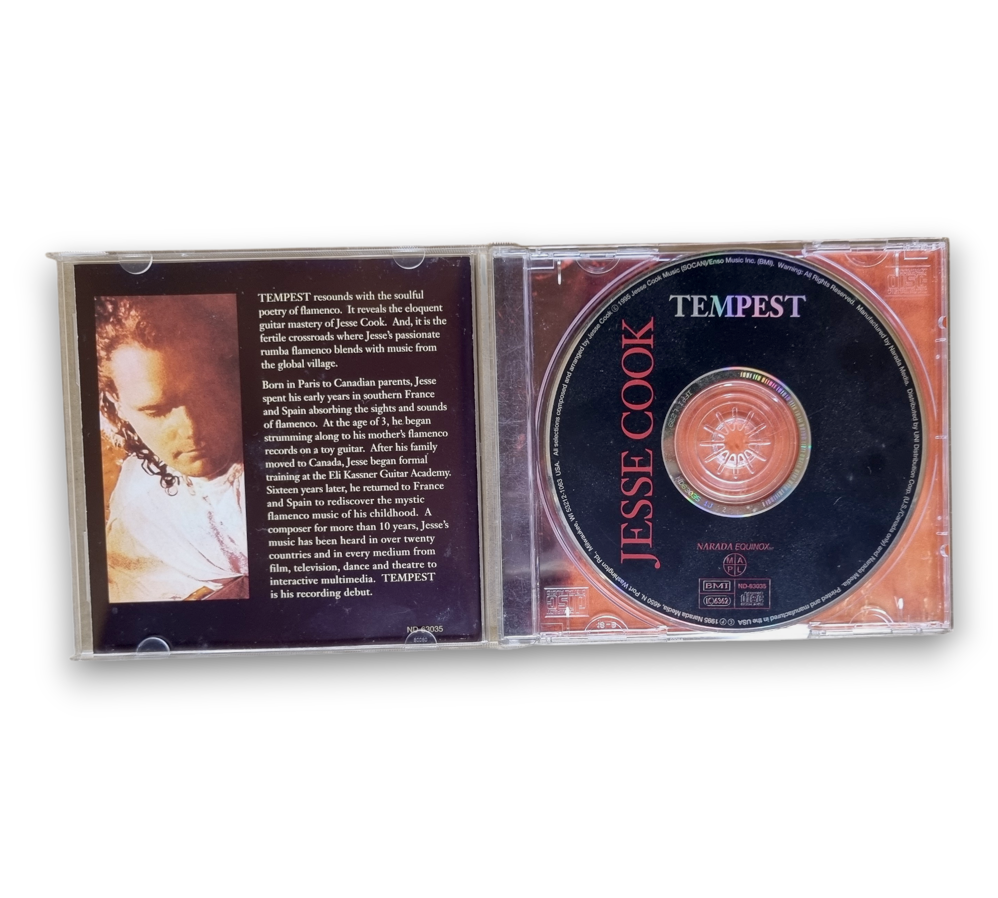 Discover the enchanting sounds of Jesse Cook's "Tempest," released in 1995 under Narada Media. This CD features a captivating blend of rumba flamenco guitar infused with global music influences, showcasing Cook's virtuosity and creativity. The album includes a credits insert and is printed in the USA, making it a delightful addition for fans of folk and world music. Enjoy tracks like "Cascada" and "Dance Of Spring" as you immerse yourself in this musical journey.