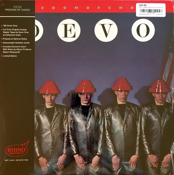 Devo's third studio album Freedom of Choice, originally released in 1980, showcases the band's signature blend of synth pop, new wave, and post-punk, anchored by the enduring hit Whip It. This edition is part of Rhino's Rhino High Fidelity series, pressed on 180-gram vinyl and cut from the original stereo master by Kevin Gray. The release includes an exclusive insert with notes by album producer Robert Margouleff. This version was released October 4, 2024.