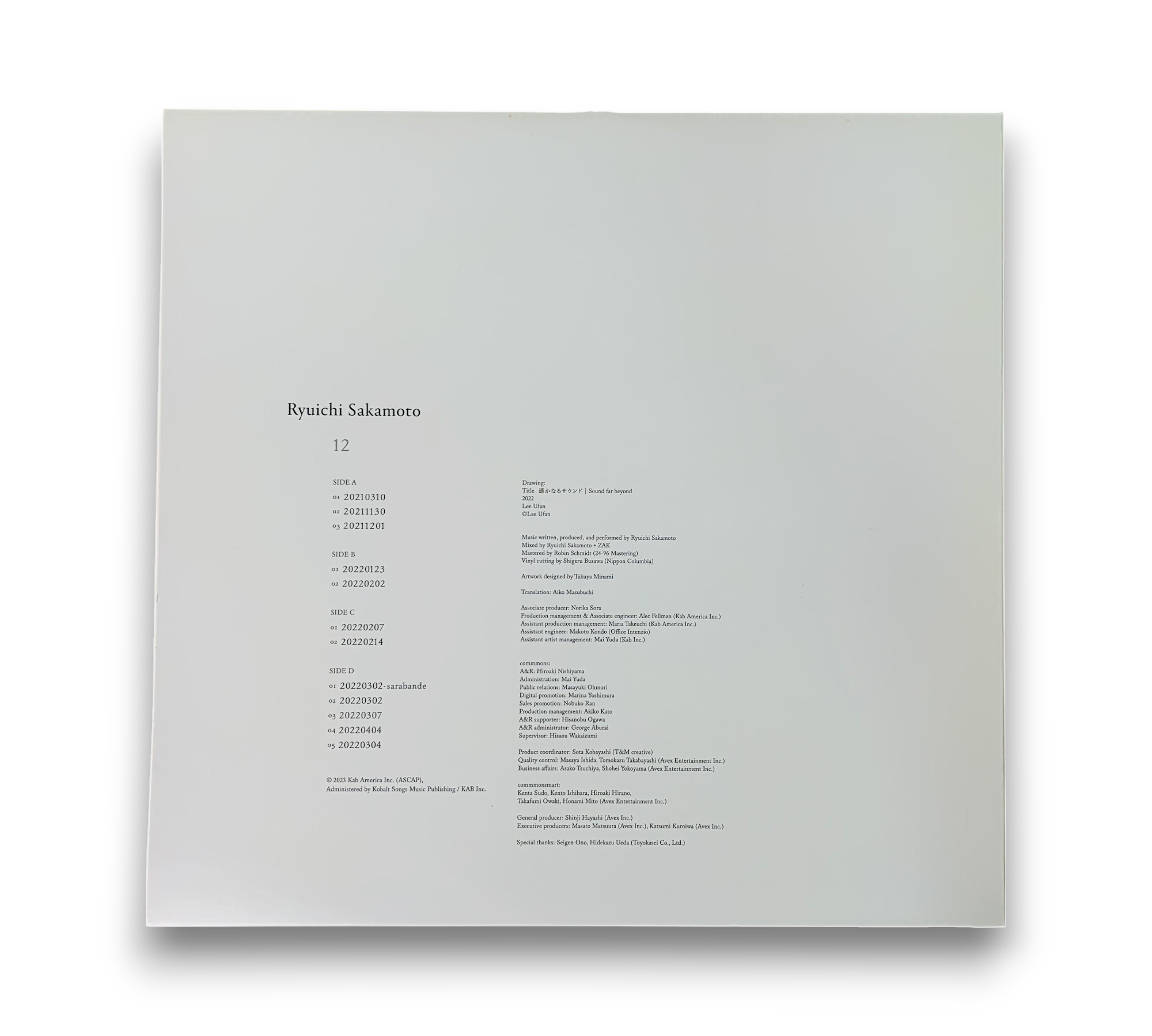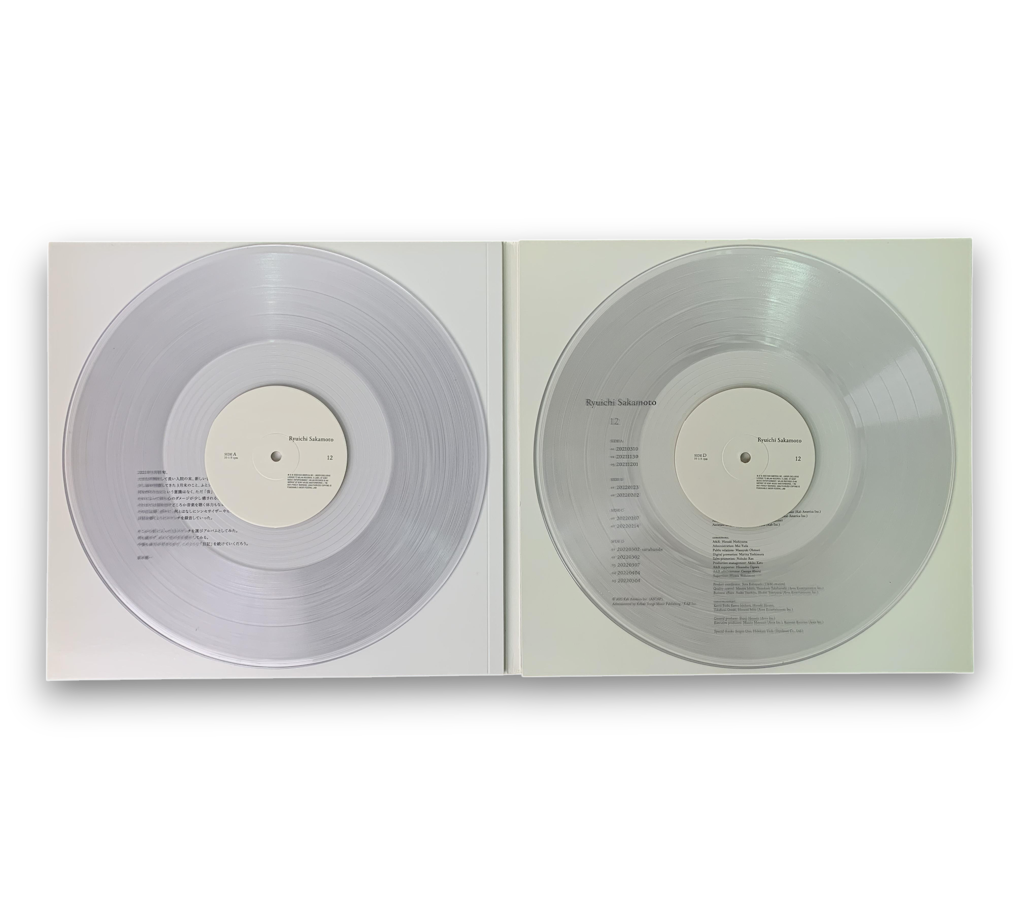 Discover the innovative sounds of Ryuichi Sakamoto with his 2023 release, "12." This vinyl album showcases a unique blend of electronic and classical music, featuring ambient and modern classical styles. The tracklist includes captivating pieces such as "Sarabande" and various dates that reflect Sakamoto's creative journey. A must-have for fans of experimental music, this record is a testament to Sakamoto's artistry and vision.