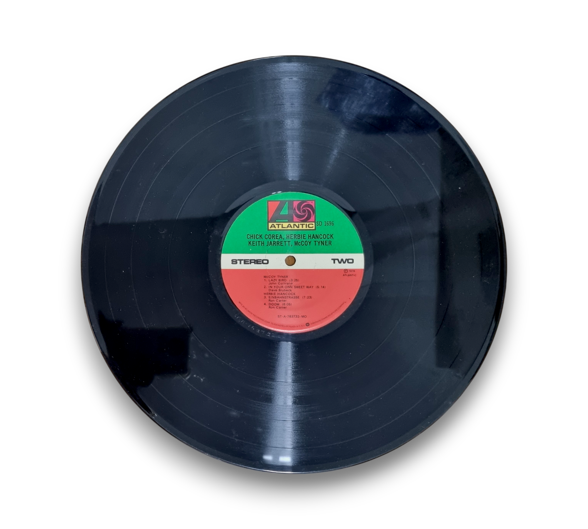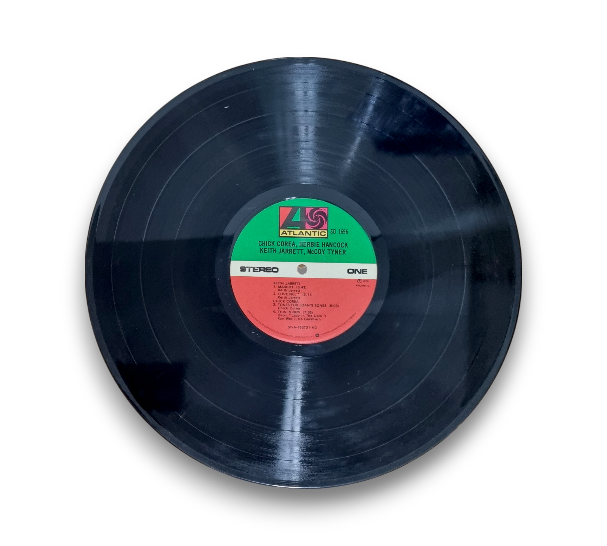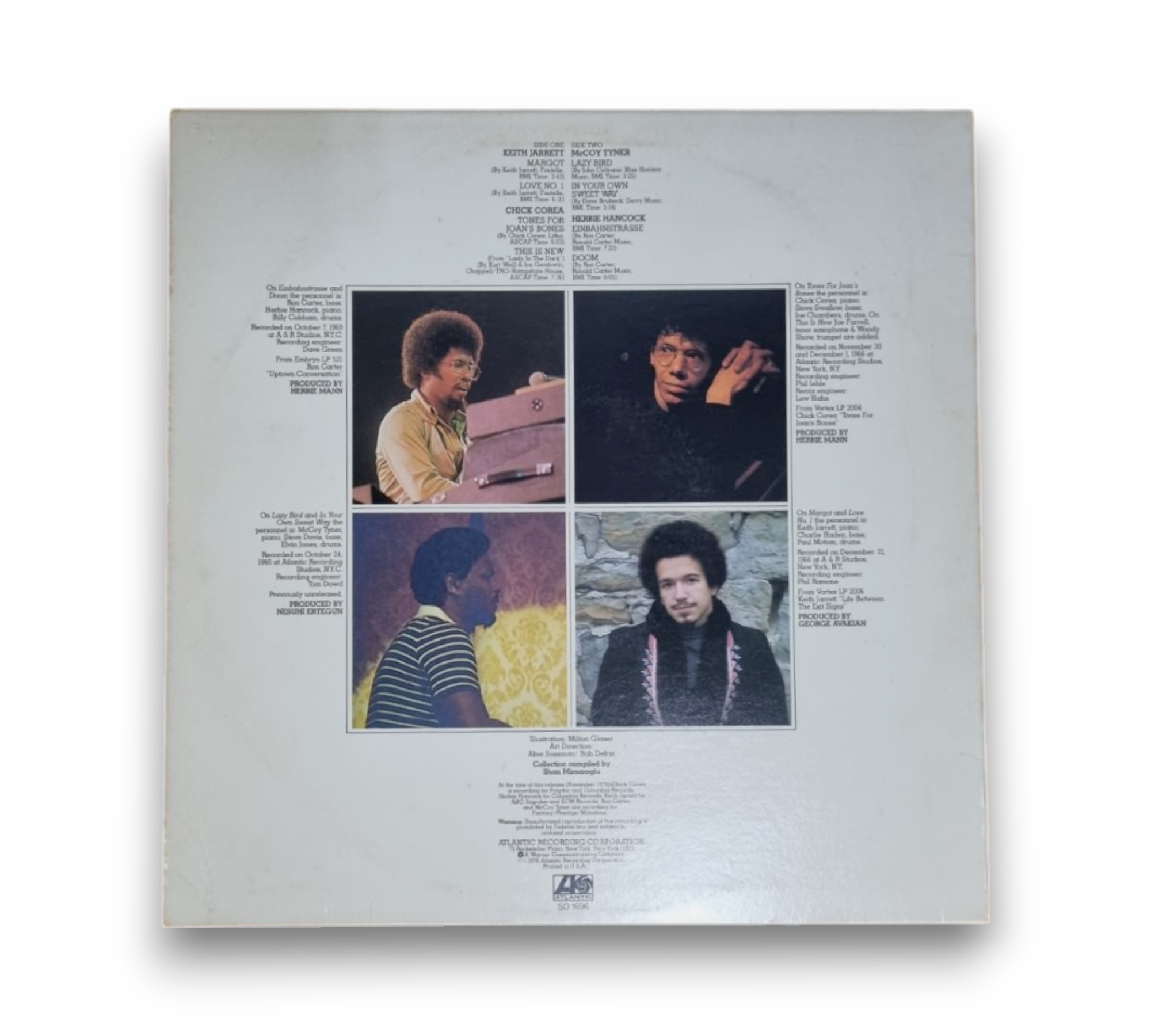 This record features the collaborative works of Chick Corea, Herbie Hancock, Keith Jarrett, and McCoy Tyner. The back cover showcases a collection of images of the artists, while the vinyl itself is in good condition, displaying the Atlantic label. Notably, there is a UPC sticker on the back cover, affixed to the shrink wrap rather than the actual cover. For further details regarding the condition and specifics of the packaging, please refer to the accompanying photos.
