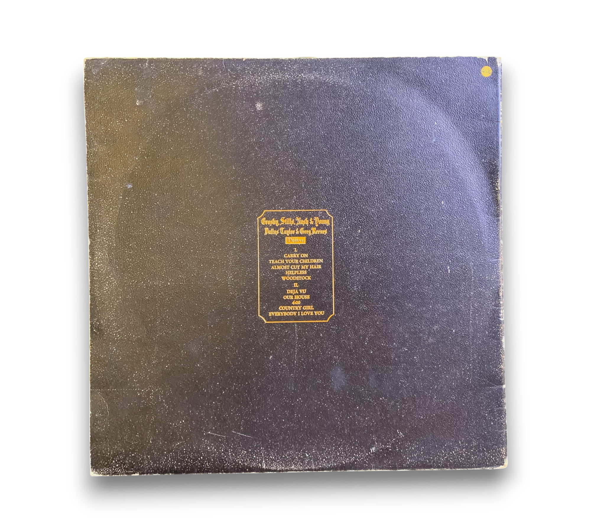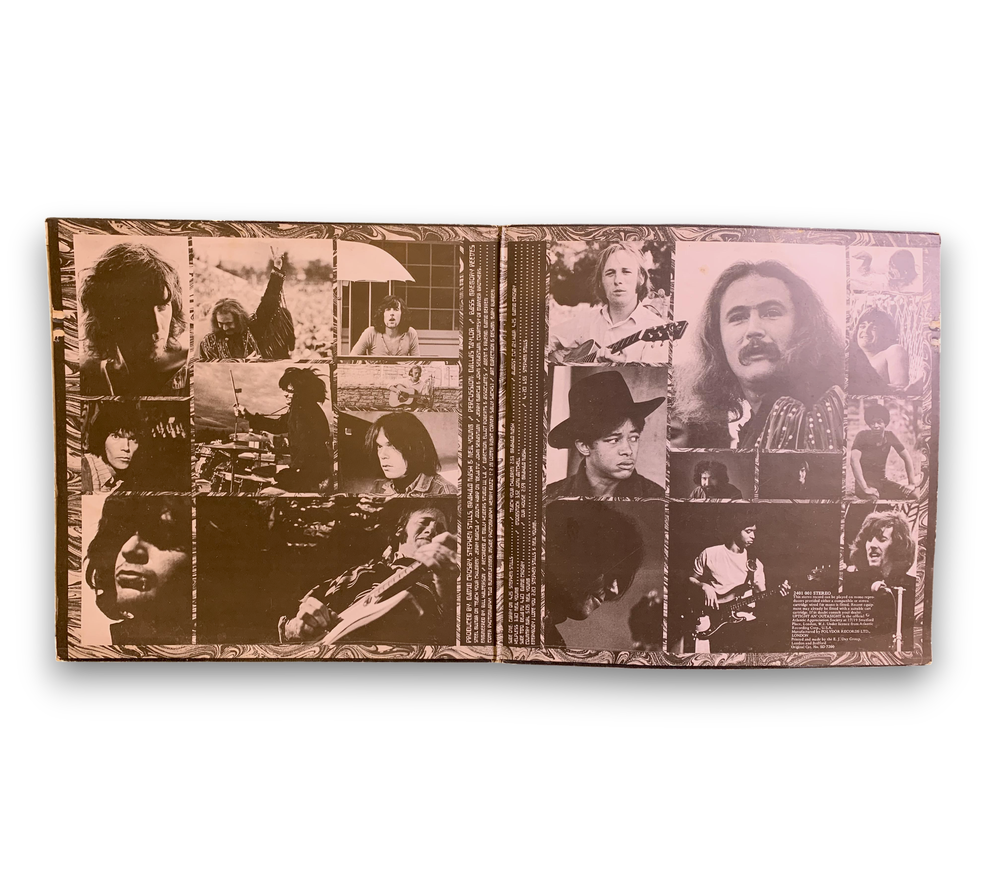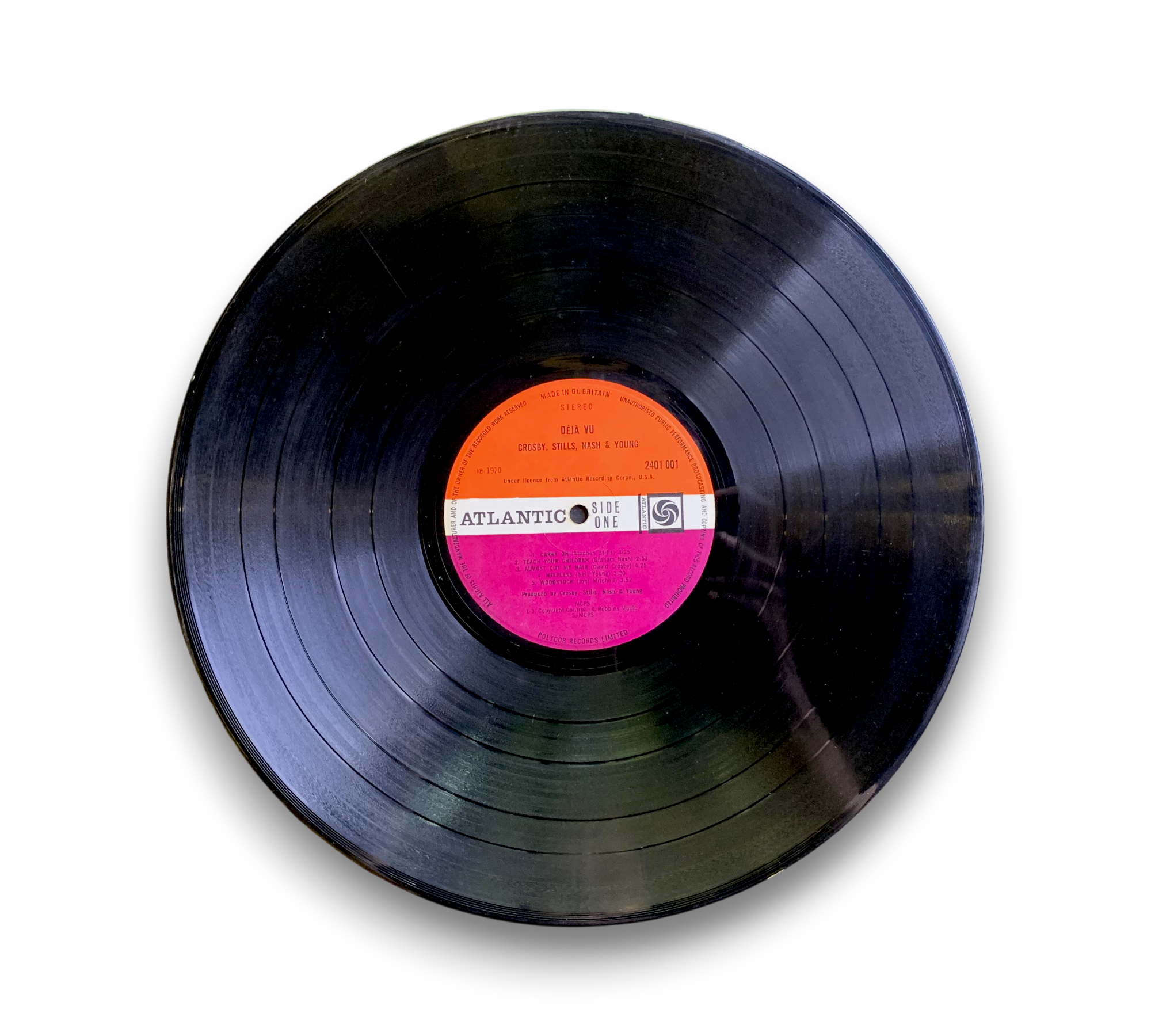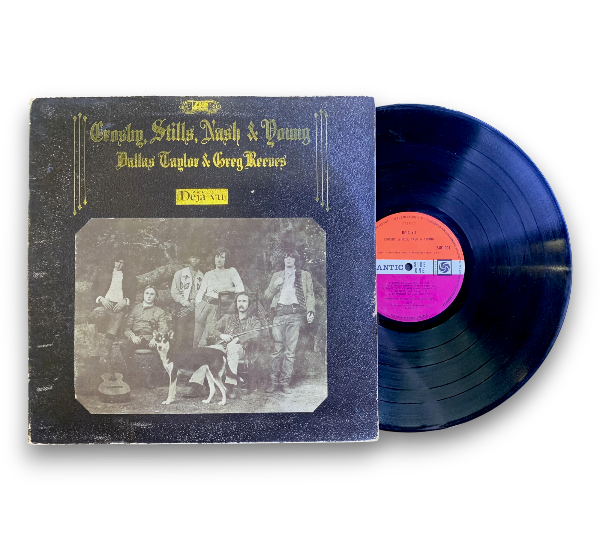 This listing features the UK release of "Déjà Vu" by Crosby, Stills, Nash & Young, catalog number 2401 001. The record is presented in a gatefold sleeve made of textured thick card, showcasing gold embossed lettering and a black and white photo on the front. The back cover includes the track titles, while the inside features additional black and white photos of the band along with personnel credits and track details. The vinyl itself is pressed on the "Red / Plum" Atlantic labels, indicating it was manufactured in Great Britain. For further details regarding the condition and specific features of the packaging, please refer to the accompanying photos.