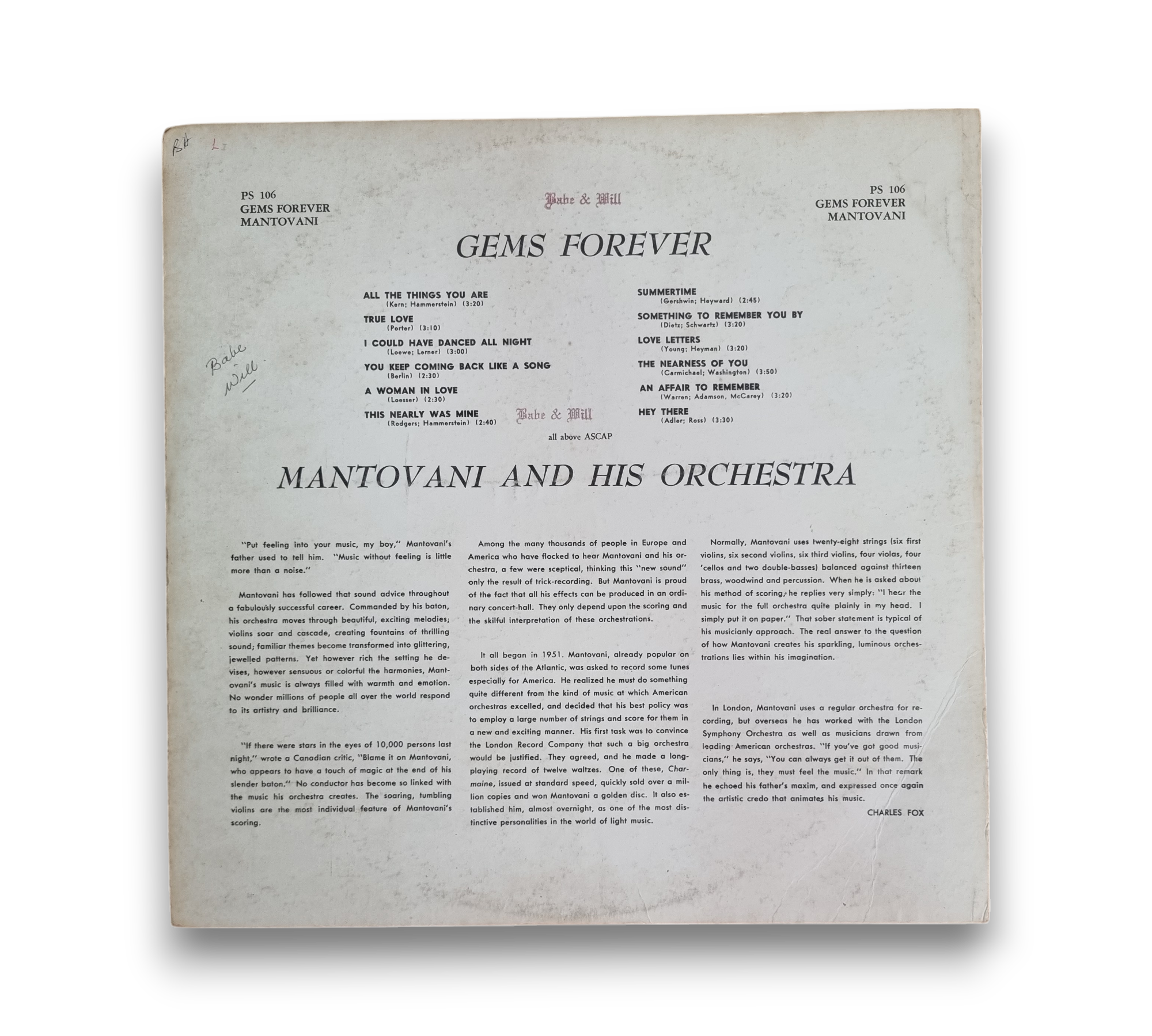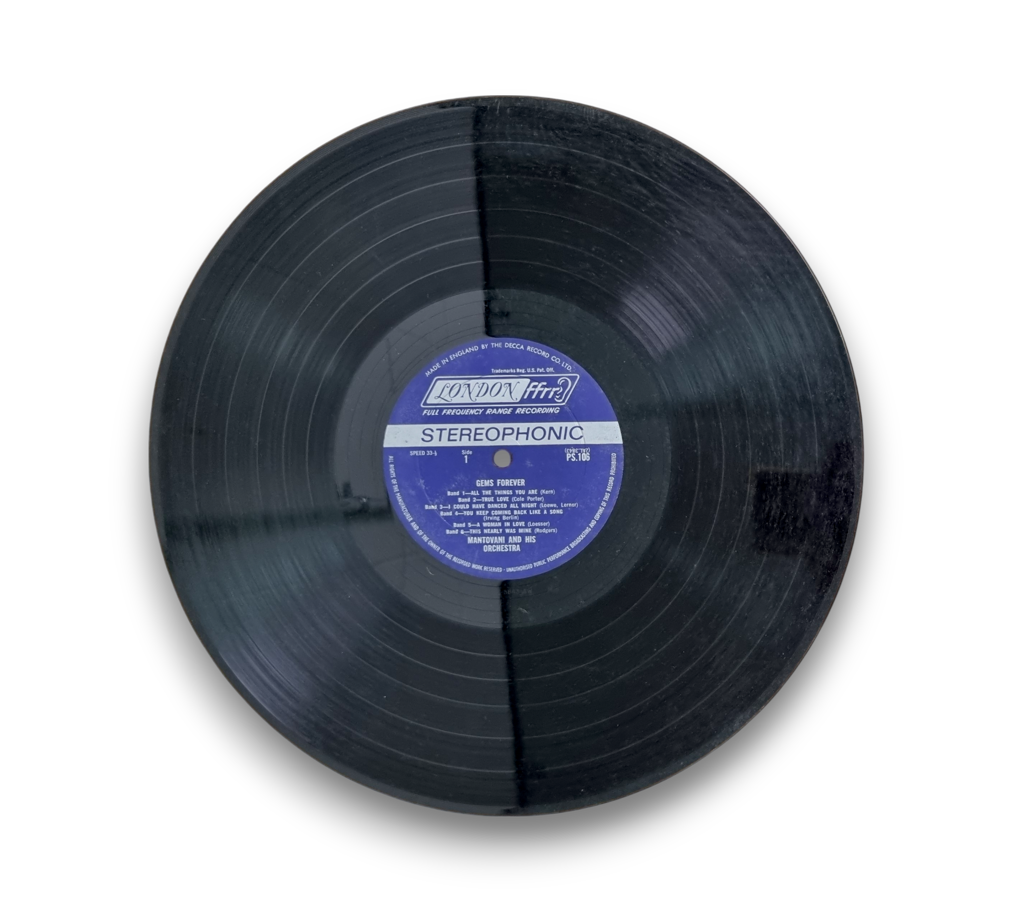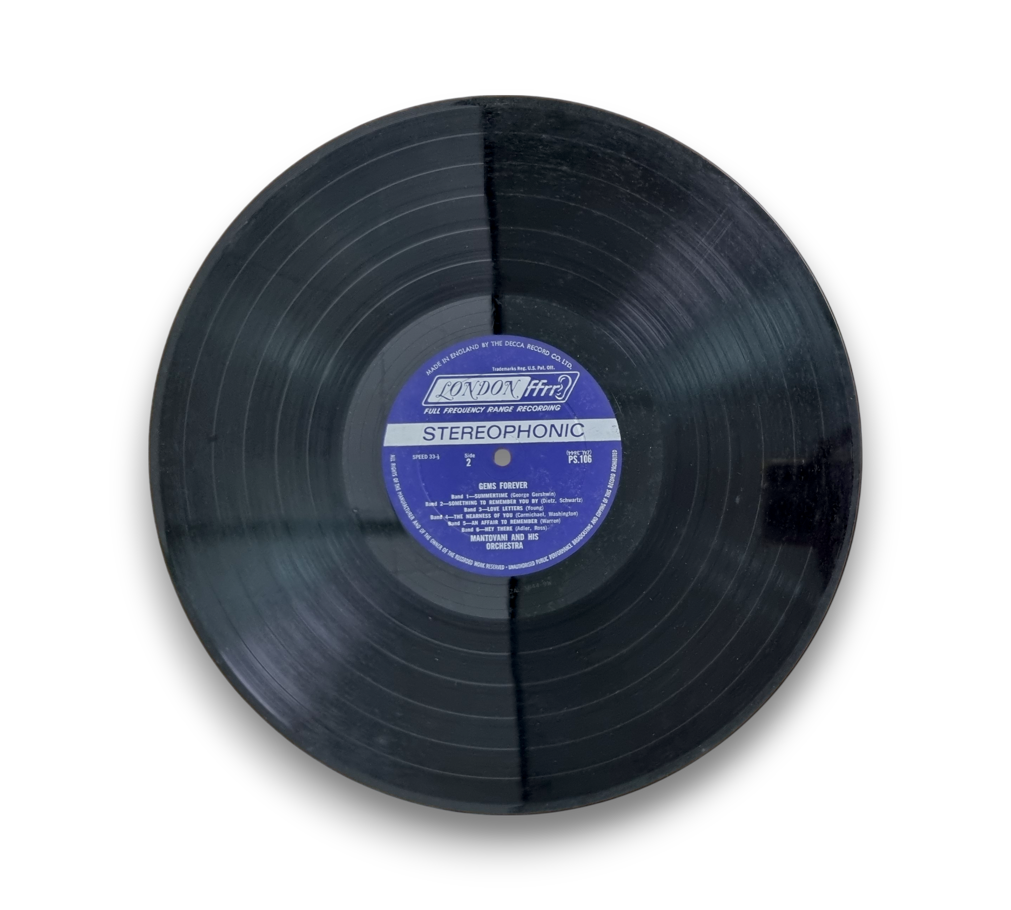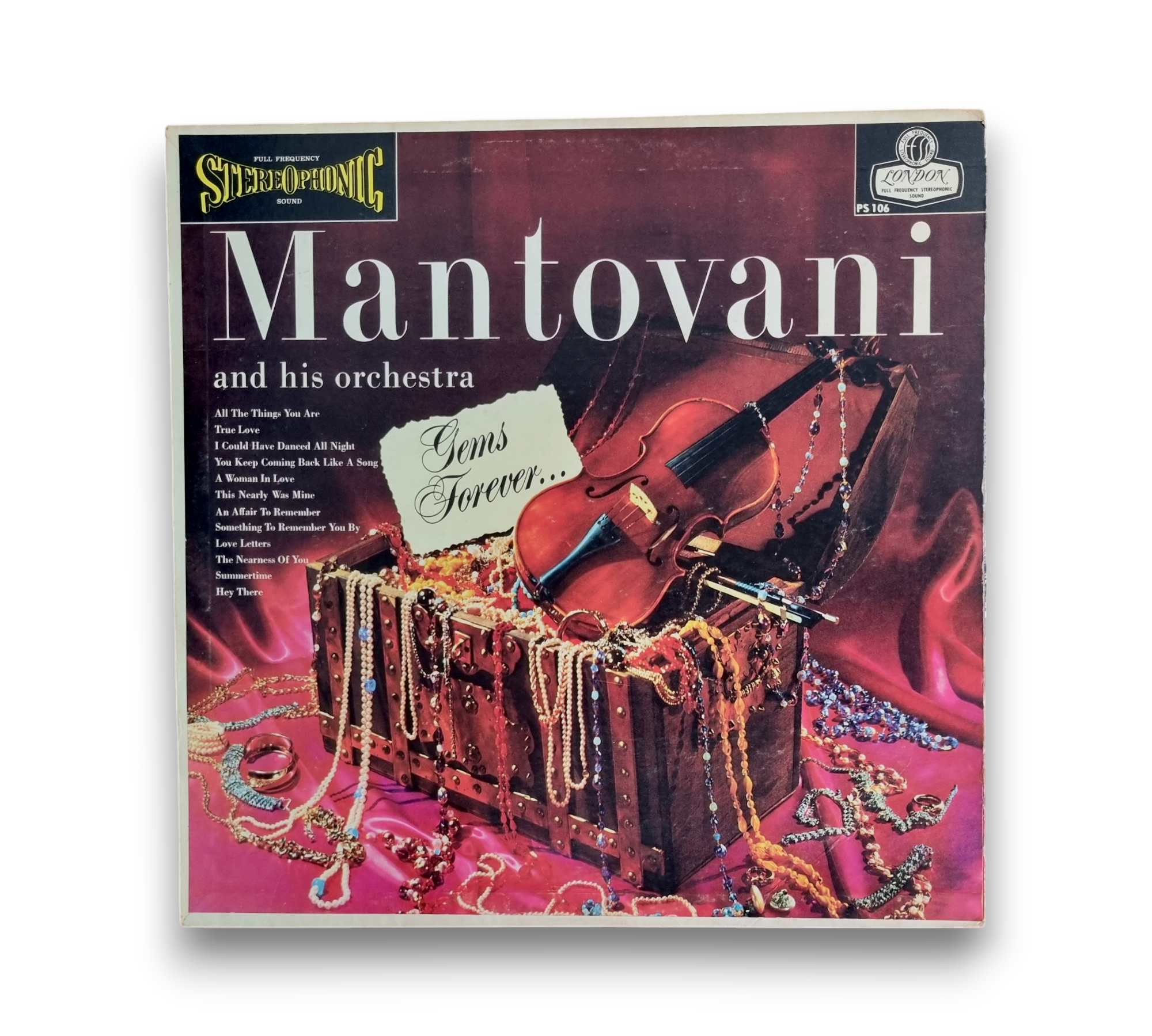 This release of "Gems Forever" by Mantovani and His Orchestra features a cover variation with a white background on the back and a distinctive label design, where "Stereophonic" is presented in blue letters on a silver band above the spindle hole. The catalog number PS 106 is displayed on the front, back, and spine of the cover, as well as on the labels. The record includes a collection of classic show tunes and popular songs, showcasing a blend of orchestral arrangements. For specific details regarding packaging and inserts, please refer to the accompanying photos.