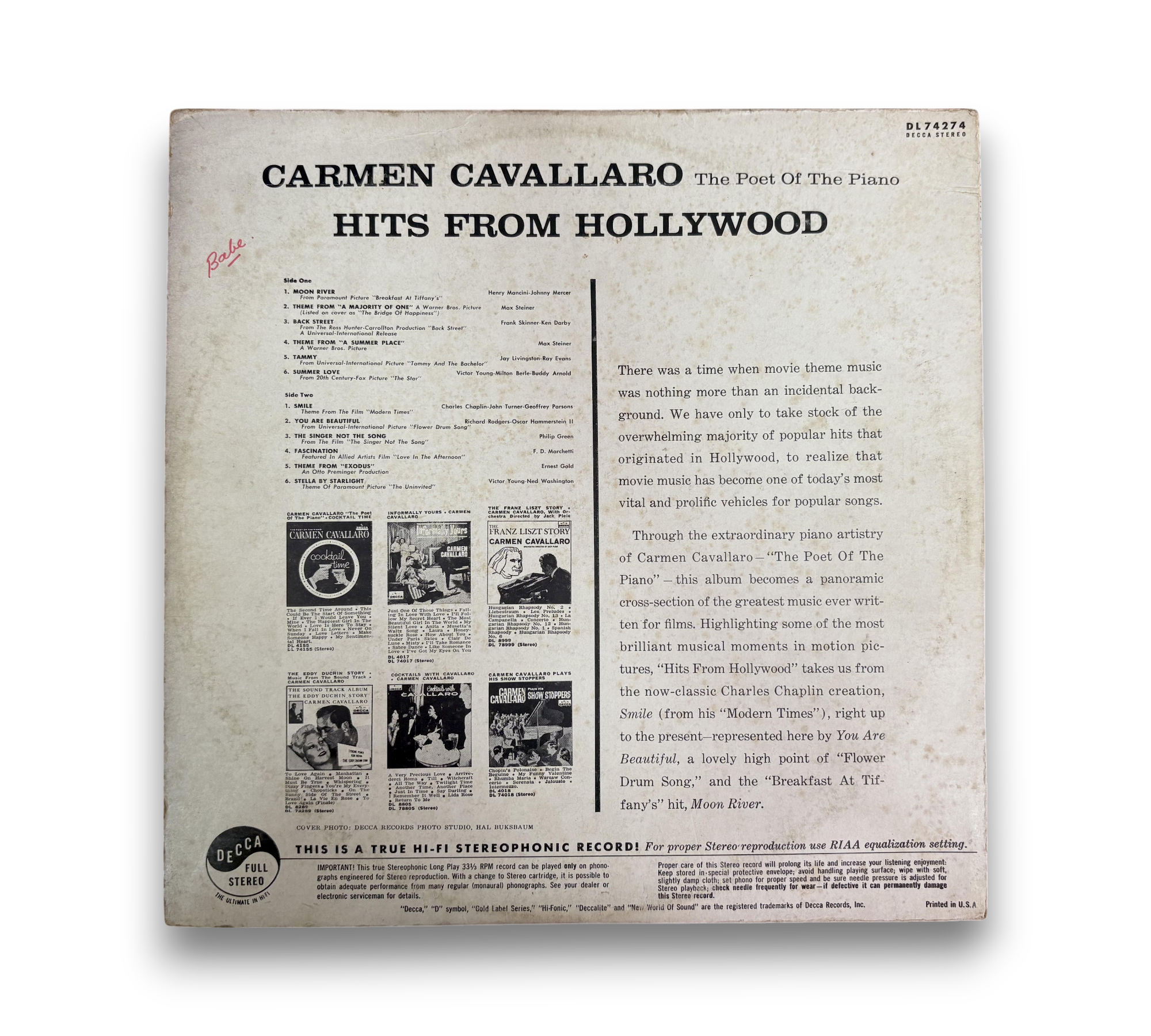 Discover the enchanting melodies of Carmen Cavallaro with "Hits From Hollywood," a delightful vinyl collection that showcases the best of jazz and pop. This album features timeless tracks such as "Moon River," "Theme From 'A Summer Place'," and "Stella By Starlight," perfect for easy listening enthusiasts. Immerse yourself in the cinematic charm of these classic tunes, making it a wonderful addition to any vinyl collection.