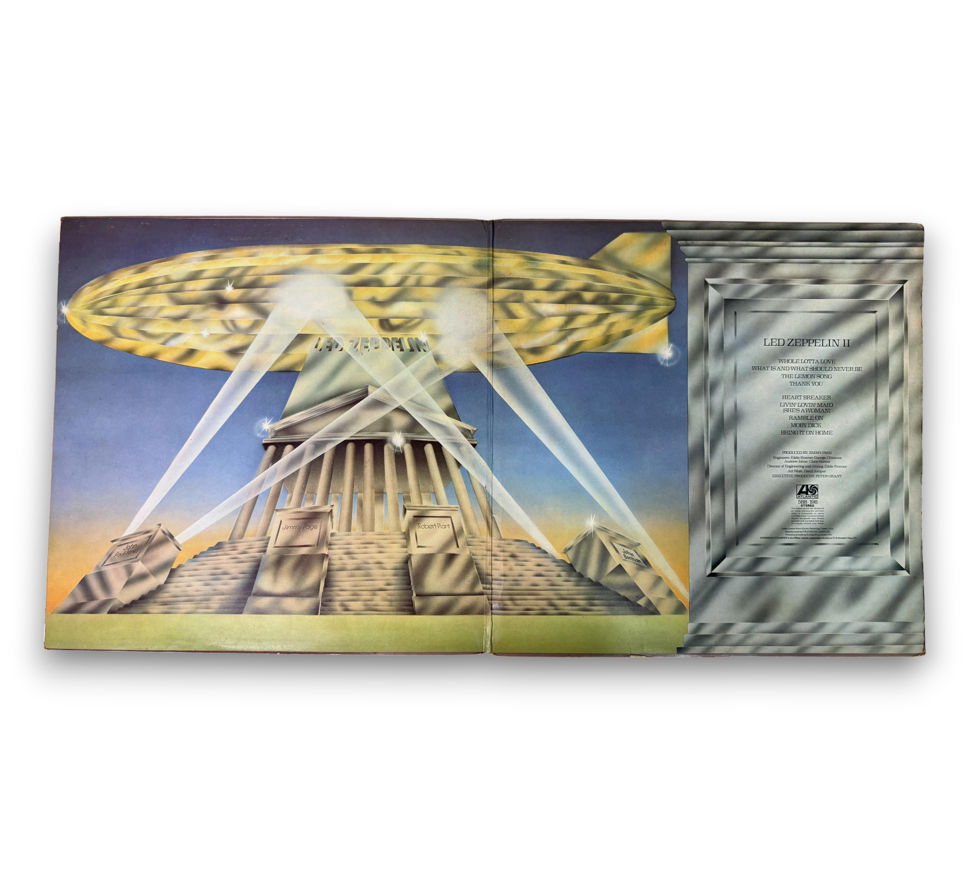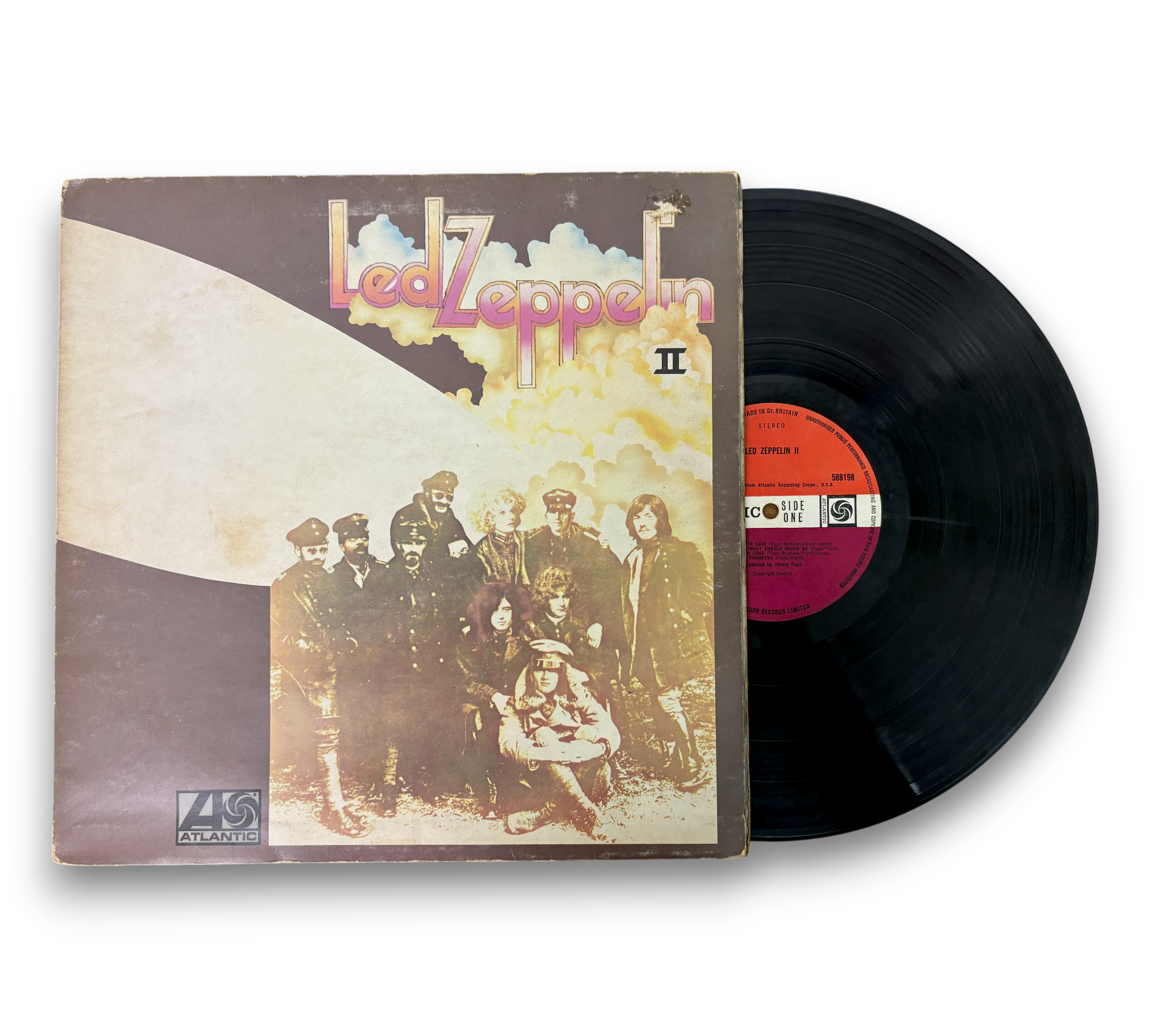 This listing features a first pressing of Led Zeppelin's iconic album "II," characterized by the label B2 track "Livin Lovin' Wreck," which was later updated to "Maid." The inside cover reflects this change, showcasing "Maid" on label B2. Notably, the phrase "She's A Woman" appears on this pressing, while subsequent releases modified it to "She's Just A Woman." The album is presented in an early gatefold unlaminated cover with a light brown hue, and the vinyl is housed in a white die-cut poly-lined inner bag. Please refer to the accompanying photos for further details on the packaging and condition.