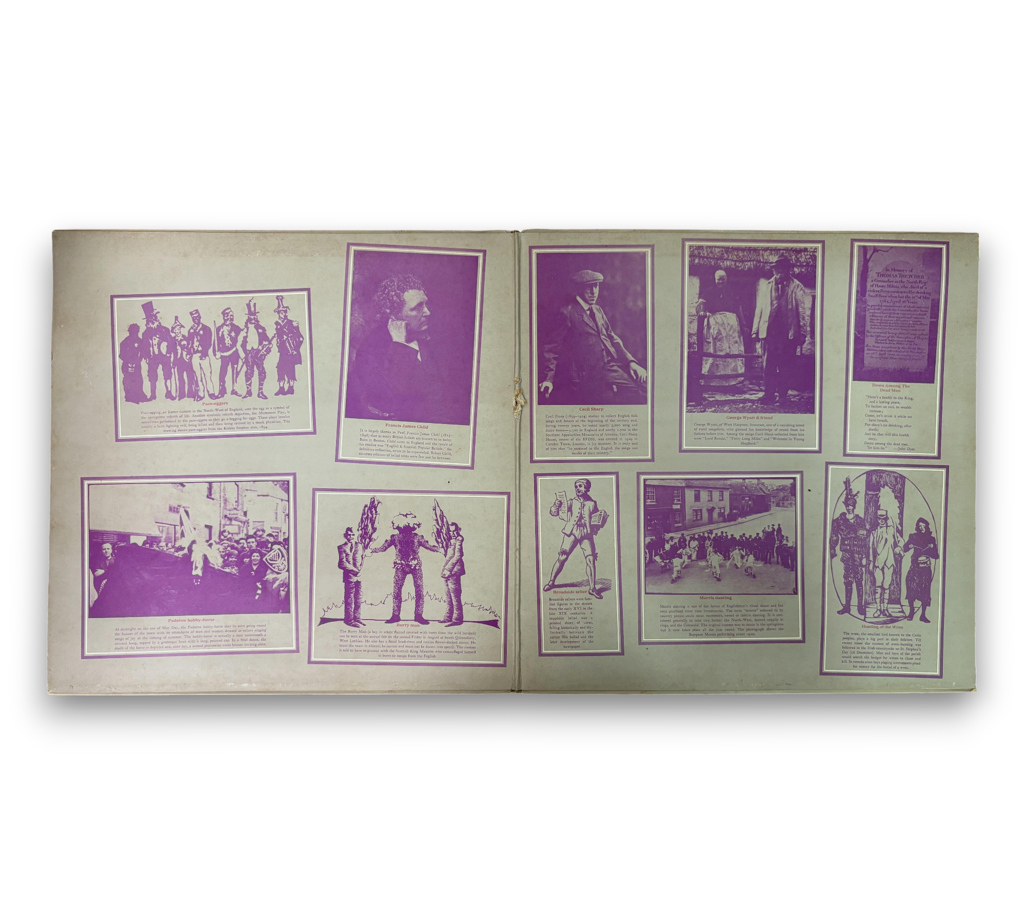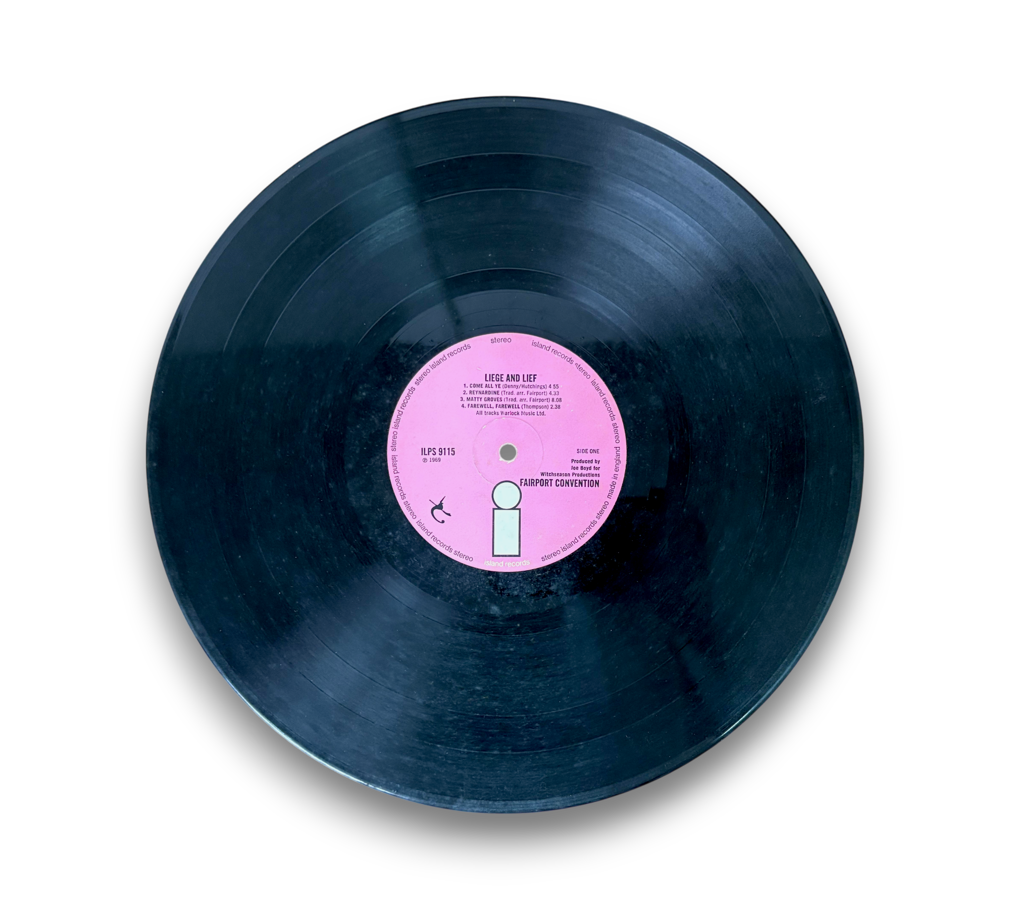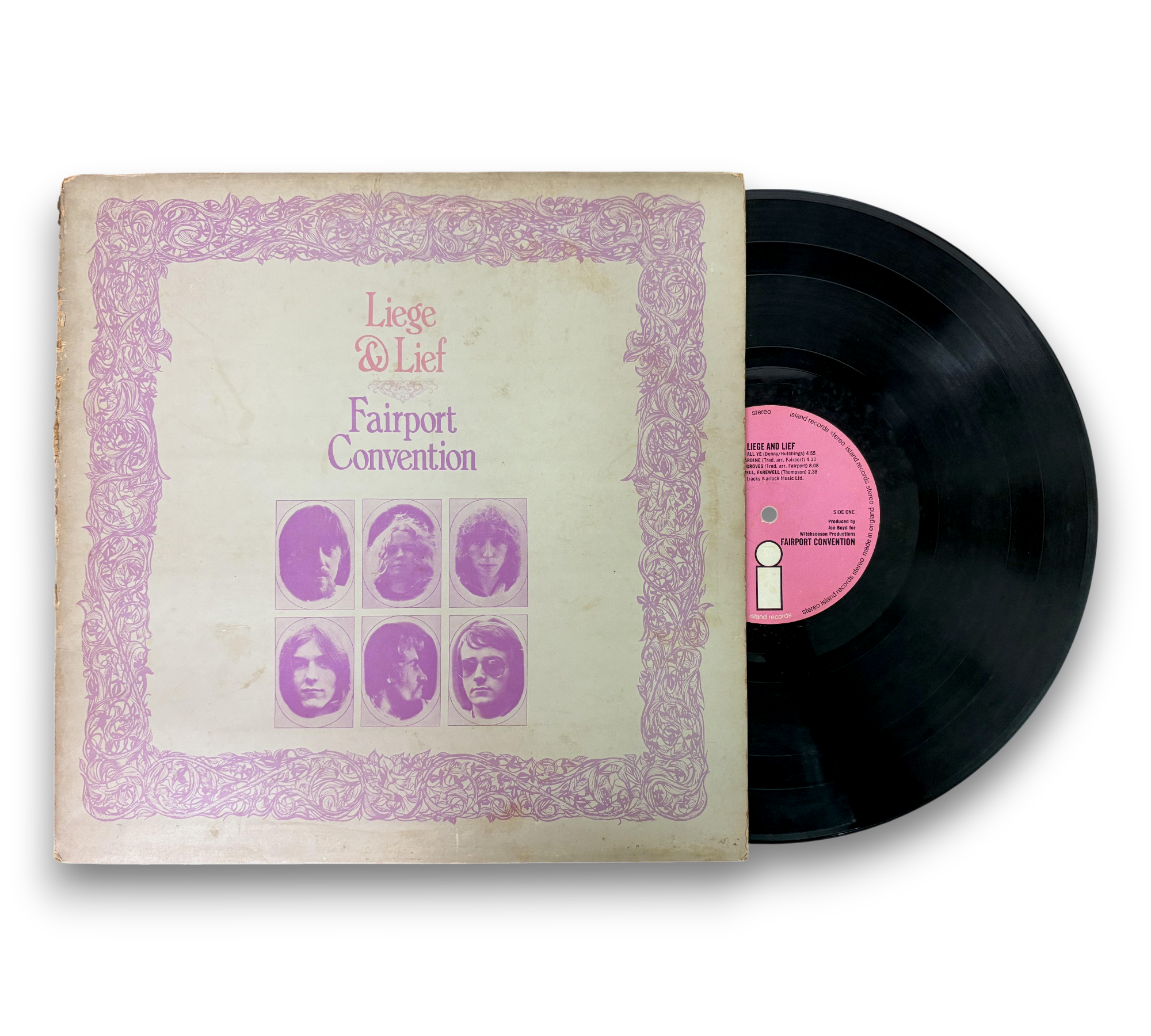 This listing features the first pressing of "Liege & Lief" by Fairport Convention, presented on the distinctive white 'i' on a pink 'Island' label. The album comes in a gatefold un-laminated cover, showcasing an inner spread filled with folklore text and images. The liner is made of white paper with punch-holes on both sides and is poly-lined. This edition was produced for Witchseason Productions Ltd. and engineered at Sound Techniques Ltd. Please refer to the accompanying photos for a closer look at the packaging and condition of the record.