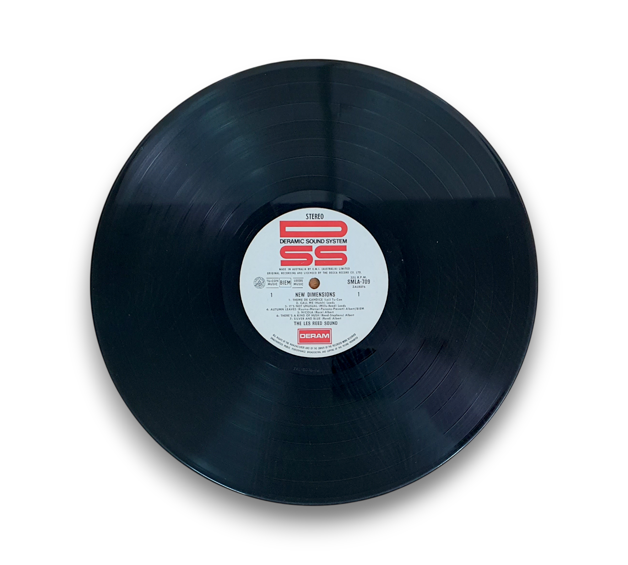 This listing features "New Dimensions" by The Les Reed Sound, released under the Decca Record Company in 1968. The cover is laminated on the front only, showcasing a vibrant design with a mix of images and colors. The record itself is pressed on white labels adorned with a red 'DSS' logo. The catalog number appears as SMLA 709 on the cover and as SML 709 on the label. For further details regarding the condition and specifics of the packaging, please refer to the accompanying photos.