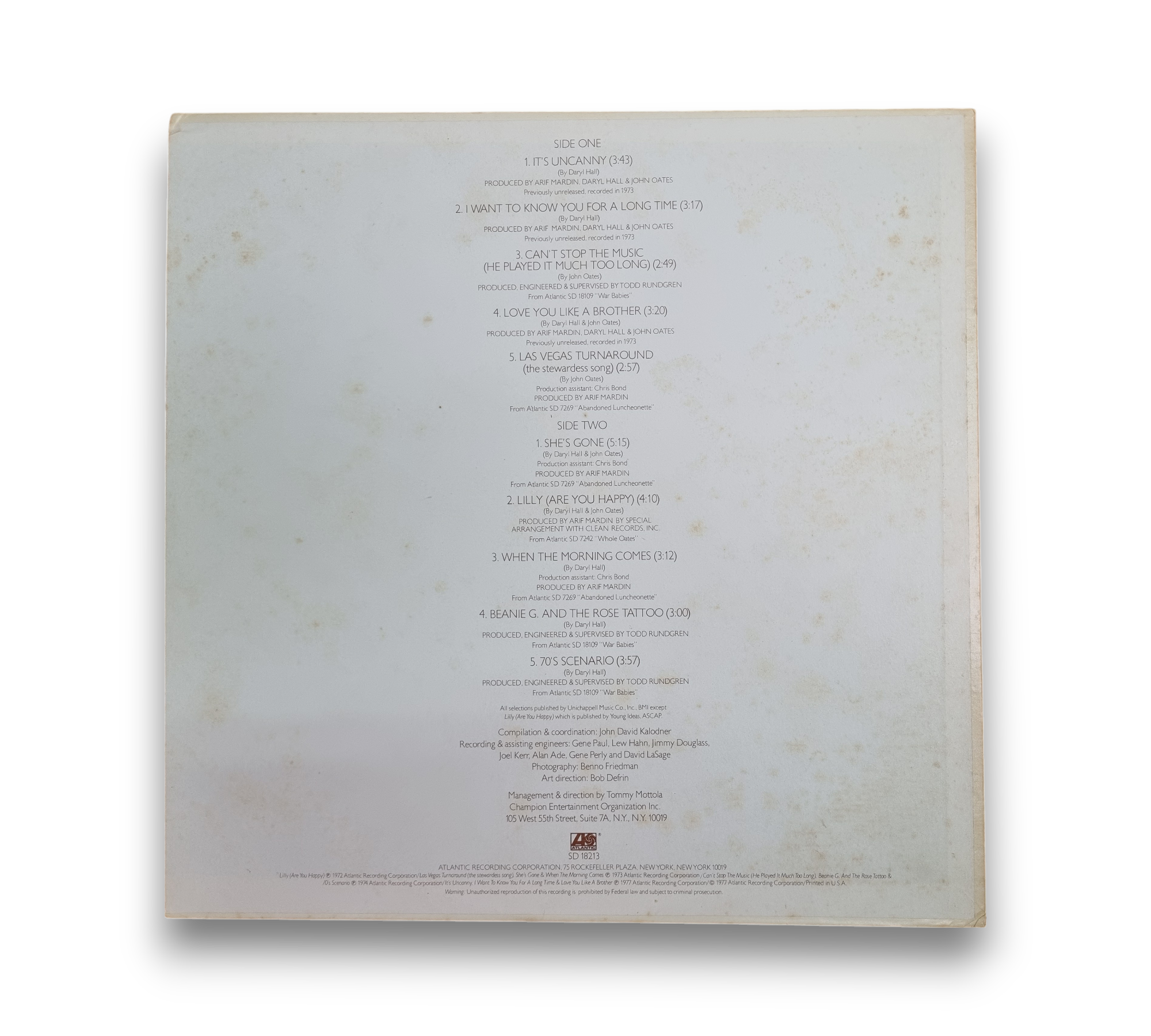 Discover the soulful sounds of Daryl Hall and John Oates with their 1977 album "No Goodbyes." This vinyl record features a mix of previously unreleased tracks from 1973 and selections from their earlier works, including standout songs like "It's Uncanny," "I Want To Know You For A Long Time," and the classic "She's Gone." Produced by Atlantic Recording Corporation, this album showcases the duo's signature blend of rock, funk, and pop, making it a must-have for fans and collectors alike.