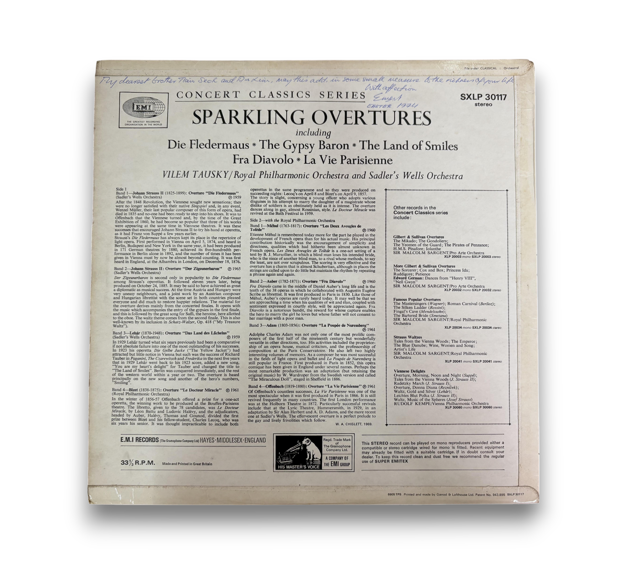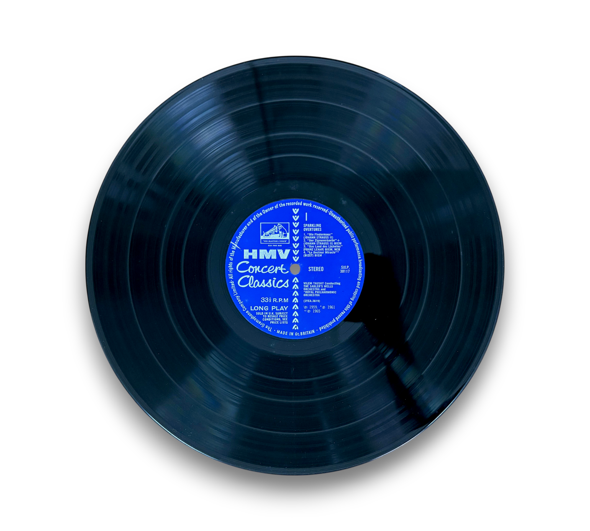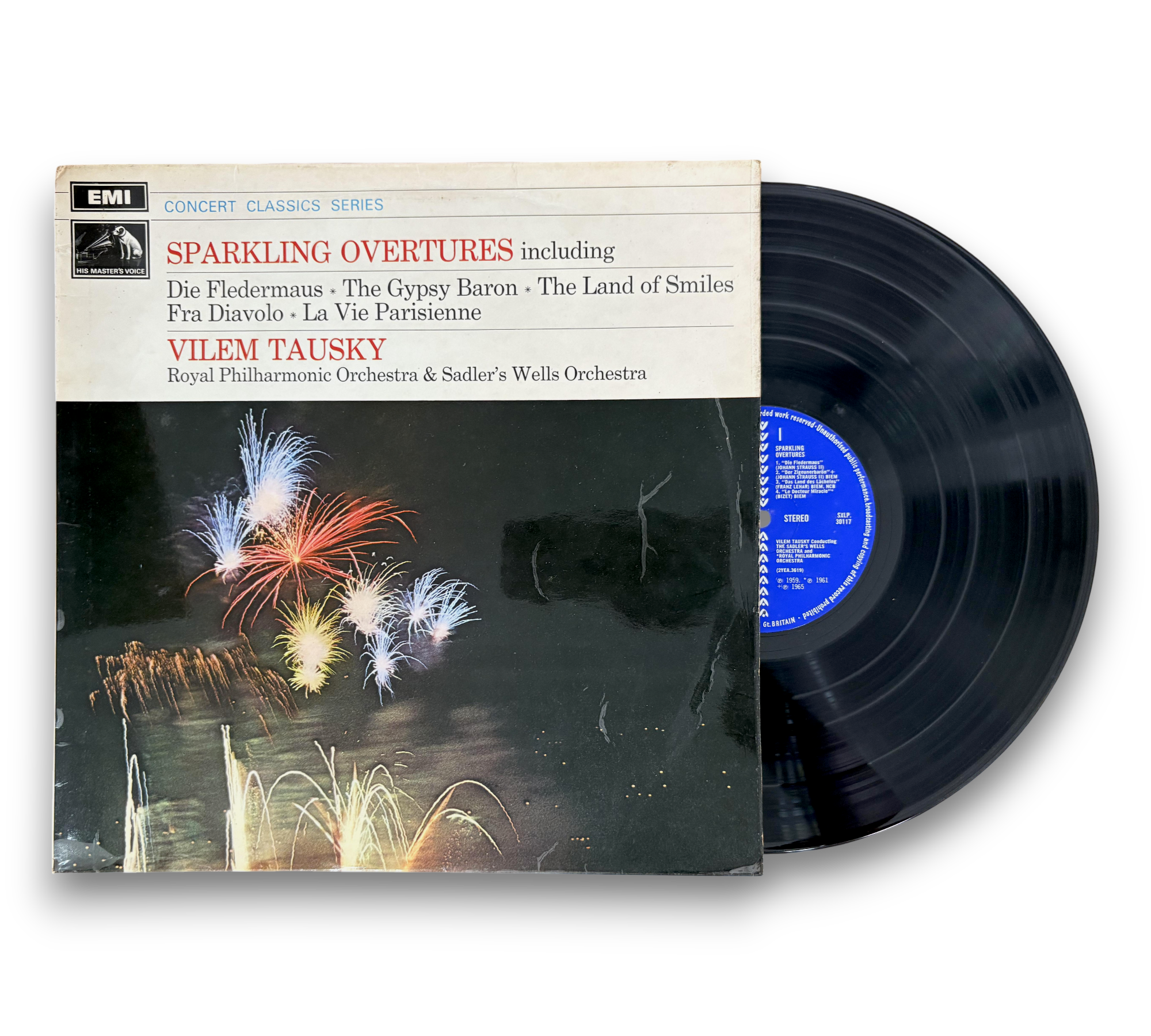 This listing features "Sparkling Overtures," conducted by Vilem Tausky and performed by the Royal Philharmonic Orchestra and Sadler's Wells Orchestra. The record includes notable pieces such as "Die Fledermaus," "The Gypsy Baron," and "The Land of Smiles." The release date is suggested to be around May 1969, based on the printer's date stamp. Please refer to the accompanying photos for details regarding the condition and any included packaging, as this information may vary.