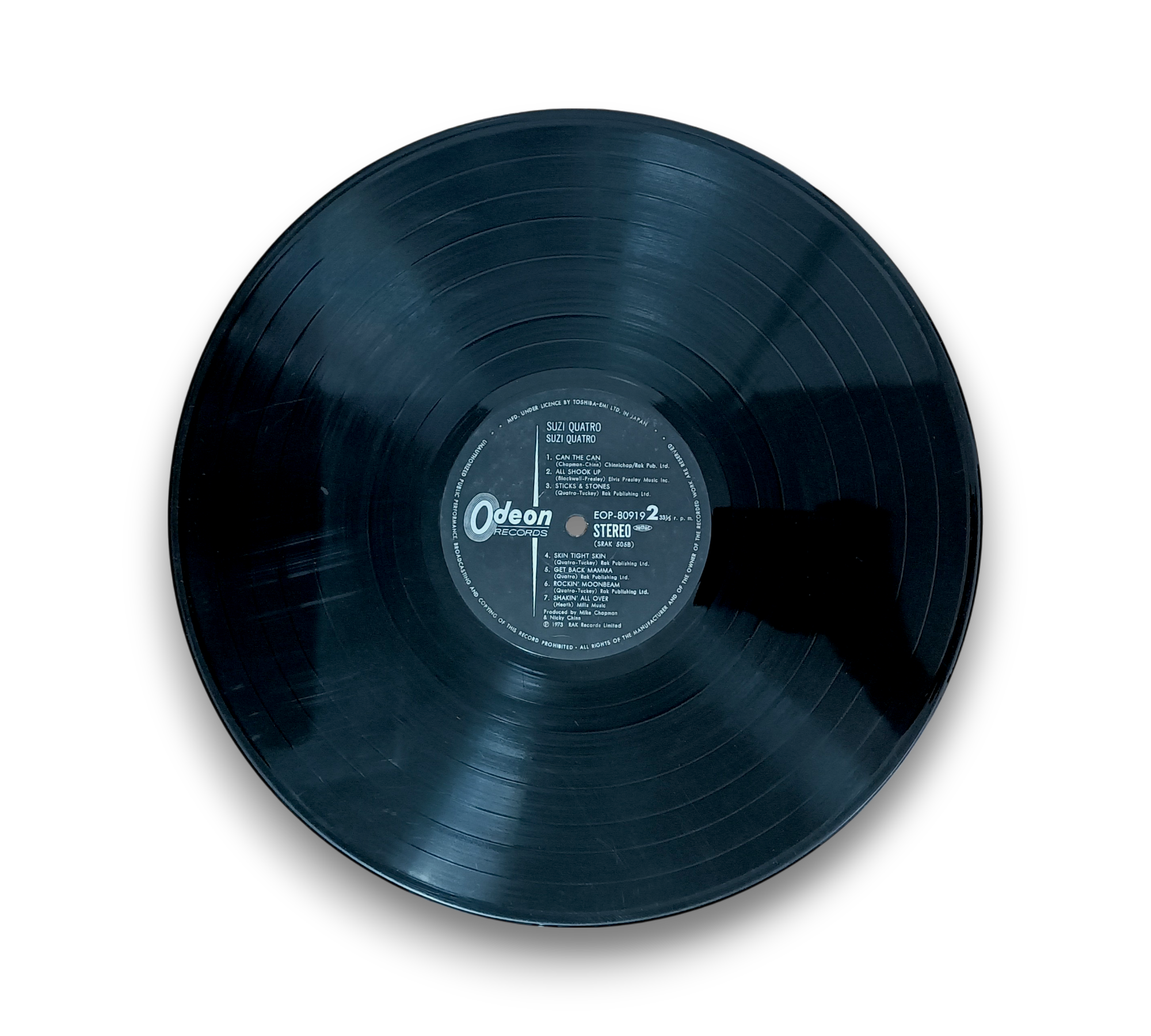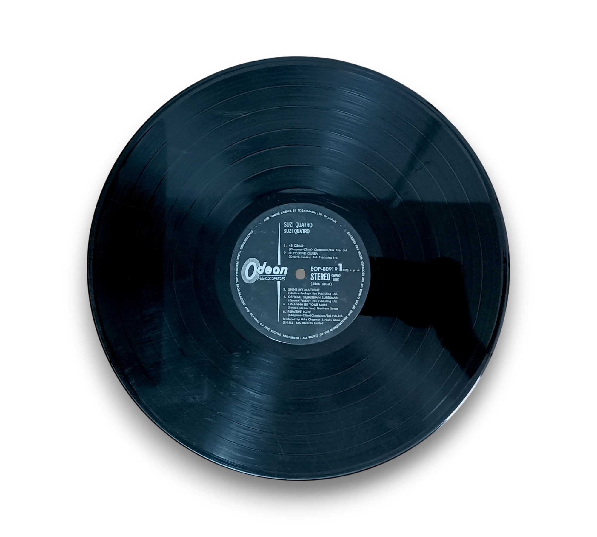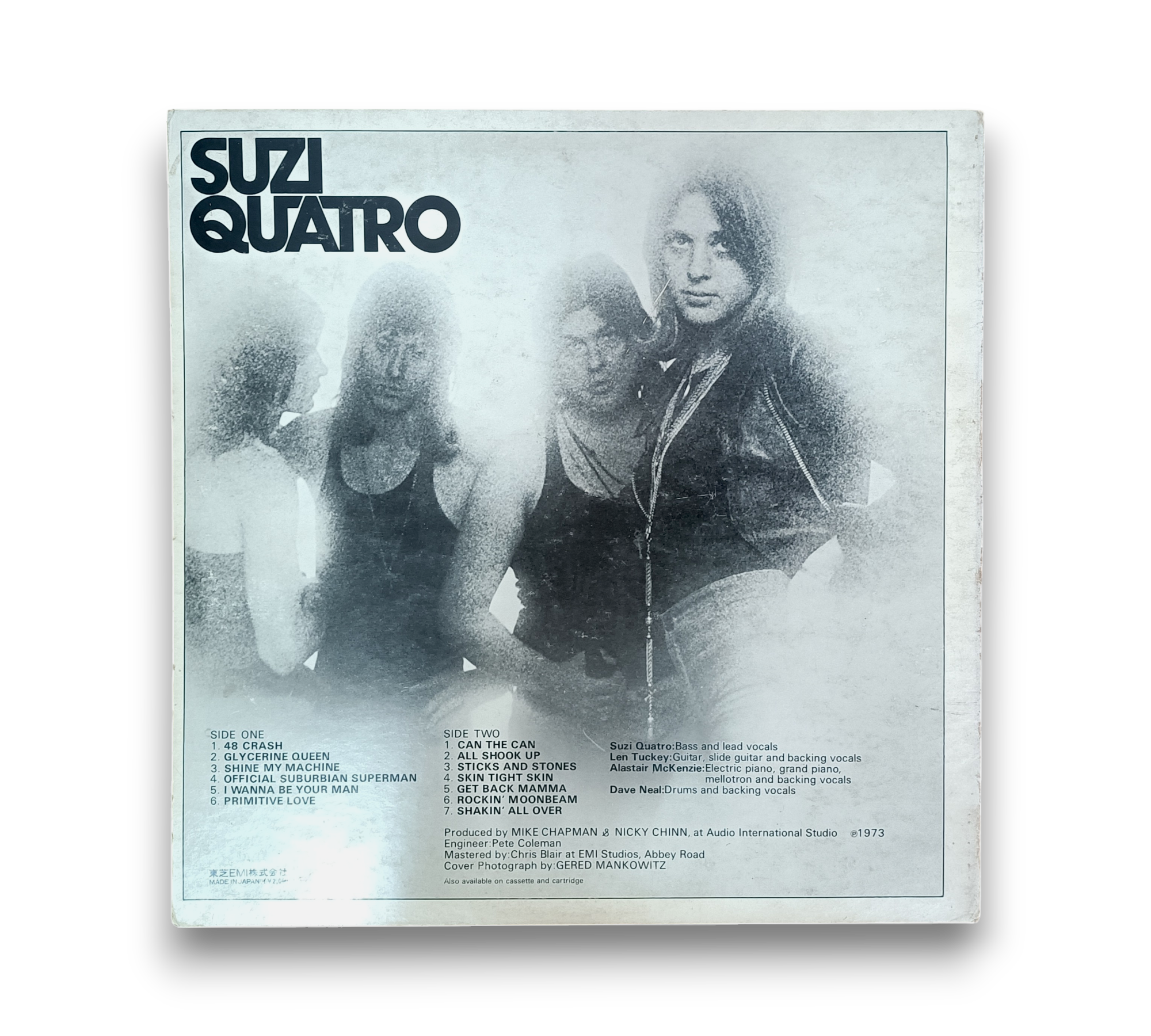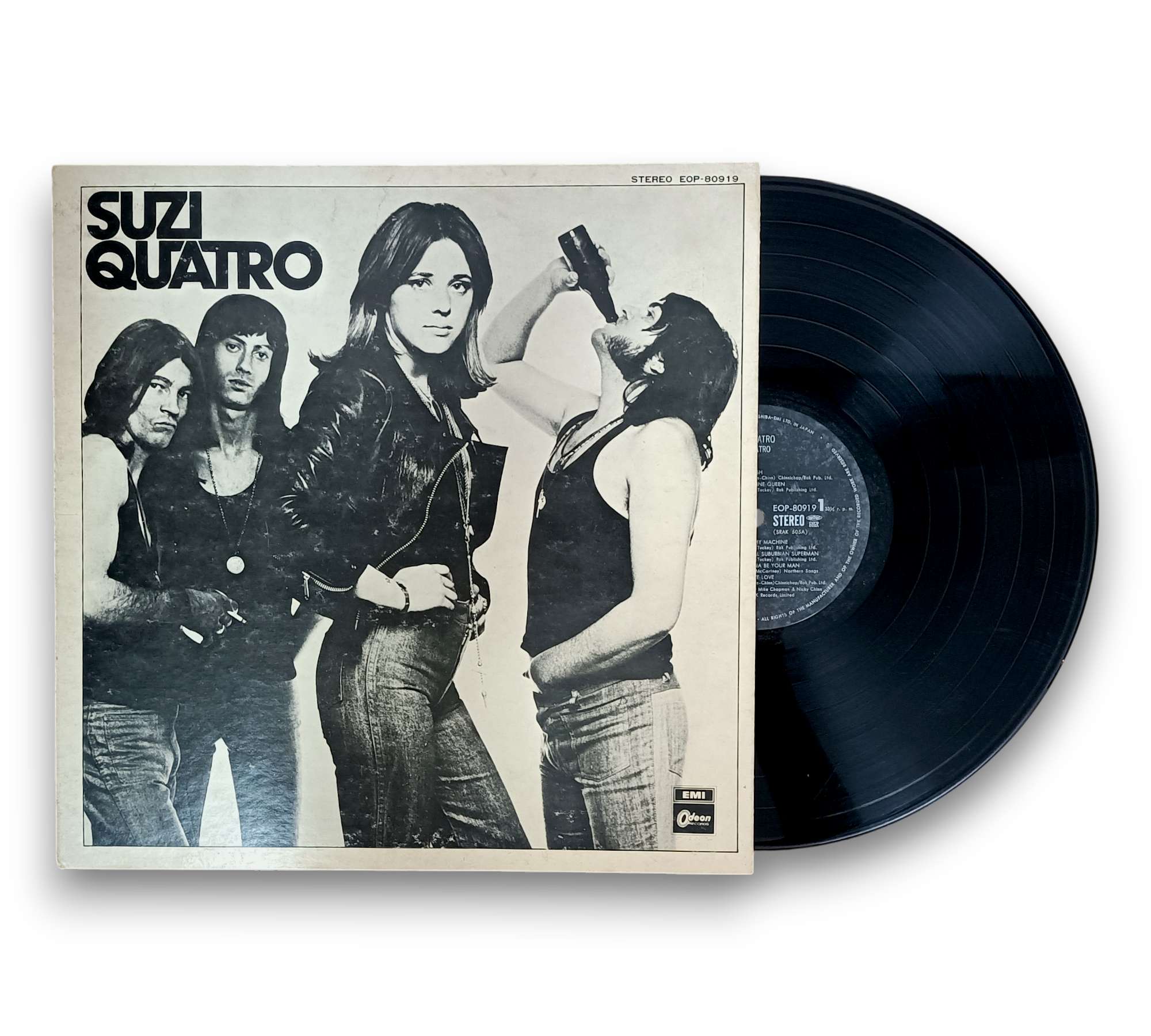 This listing features the album "Suzi Quatro," originally released in 1973 under RAK Records Limited. The record was manufactured by Toshiba EMI, Ltd. in Japan and recorded at Audio International Studio in London, with mastering completed at EMI Studios Abbey Road. The album is presented in a gatefold sleeve, showcasing a striking color "live" photo of Suzi Quatro on the inner pages. An OBI strip is also included. For further details regarding the condition and specifics of the packaging, please refer to the accompanying photos.