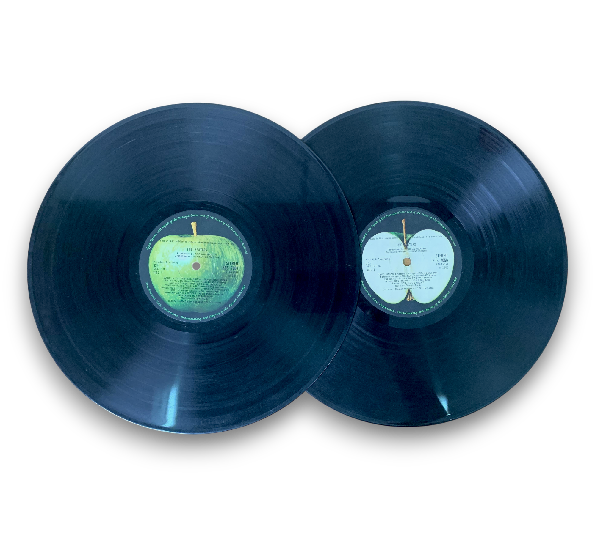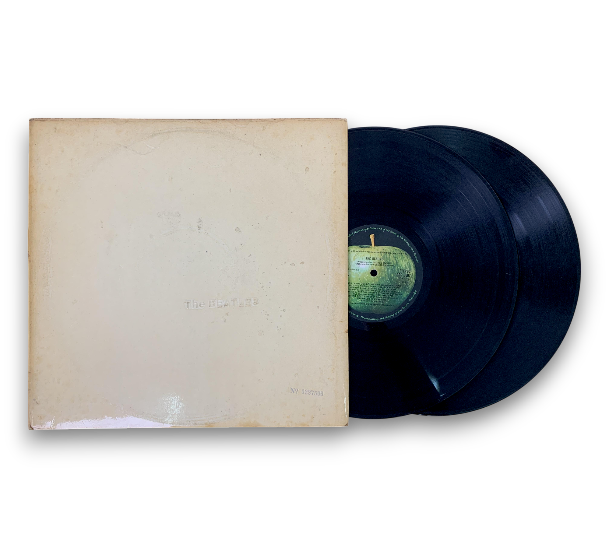 Commonly referred to as "The White Album," this edition features embossed lettering of "The Beatles" on the cover. It is a first pressing with a gate-fold jacket that opens from the top. The label indicates it was sold in the UK, subject to resale price conditions, and each copy is individually numbered on the front. The rear jacket sleeve is marked with "Stereo," and the inside cover notes that it was printed and made in Great Britain by Garrod & Lofthouse International Ltd. For further details regarding the condition and included elements, please refer to the accompanying photos.