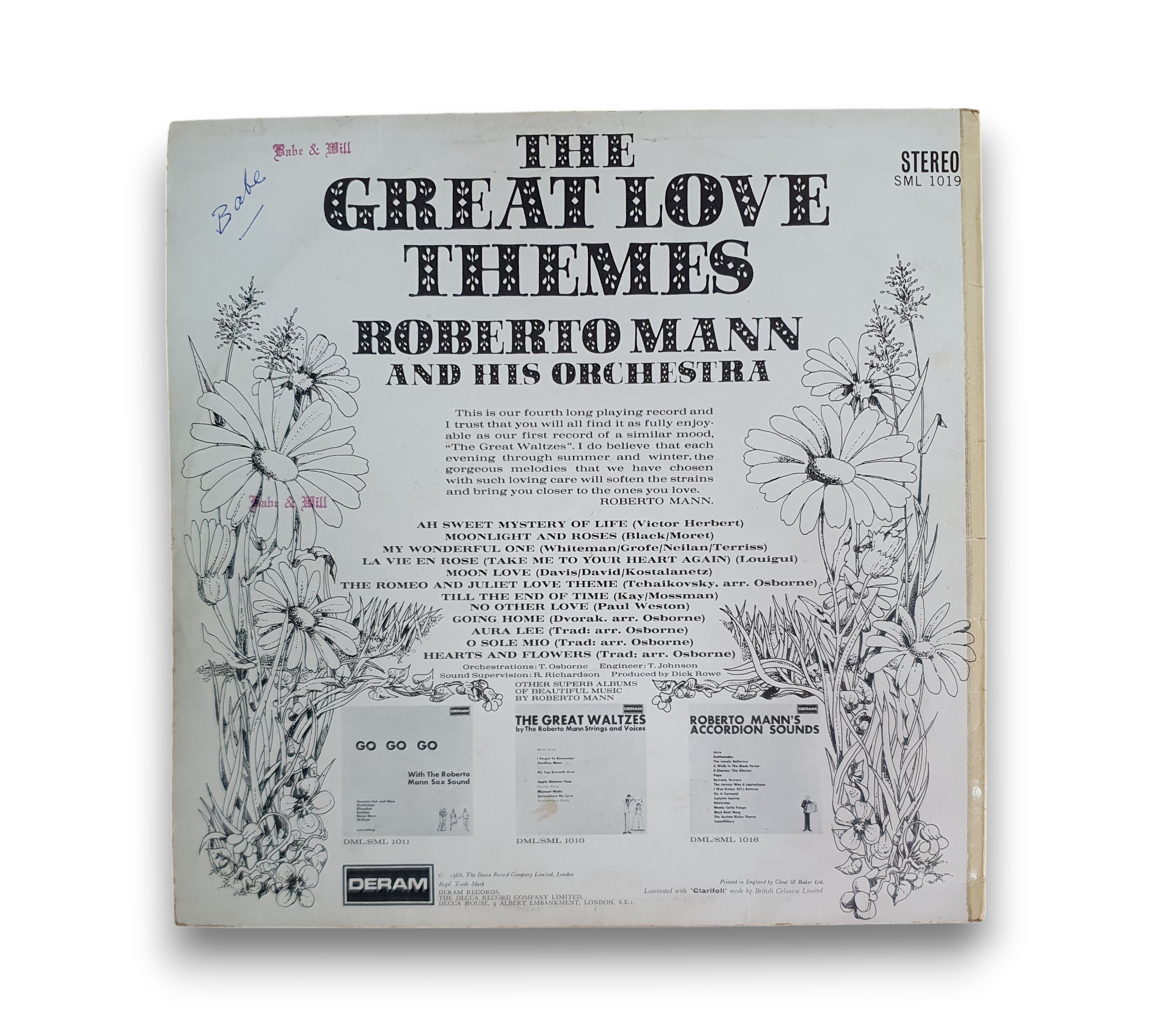 Discover the enchanting melodies of "The Great Love Themes," a 1968 vinyl release by Roberto Mann And His Orchestra. This collection features timeless romantic tracks such as "Moonlight And Roses," "O Sole Mio," and "La Vie En Rose," showcasing the soothing charm of light music. Perfect for setting a romantic atmosphere, this UK pressing is a delightful addition to any pop music lover's collection.