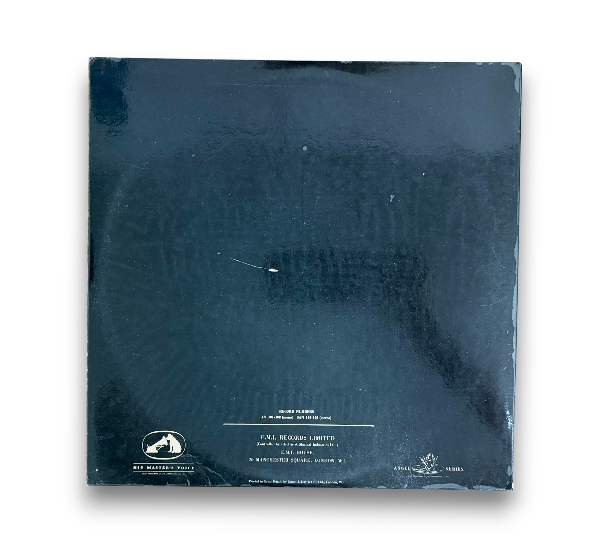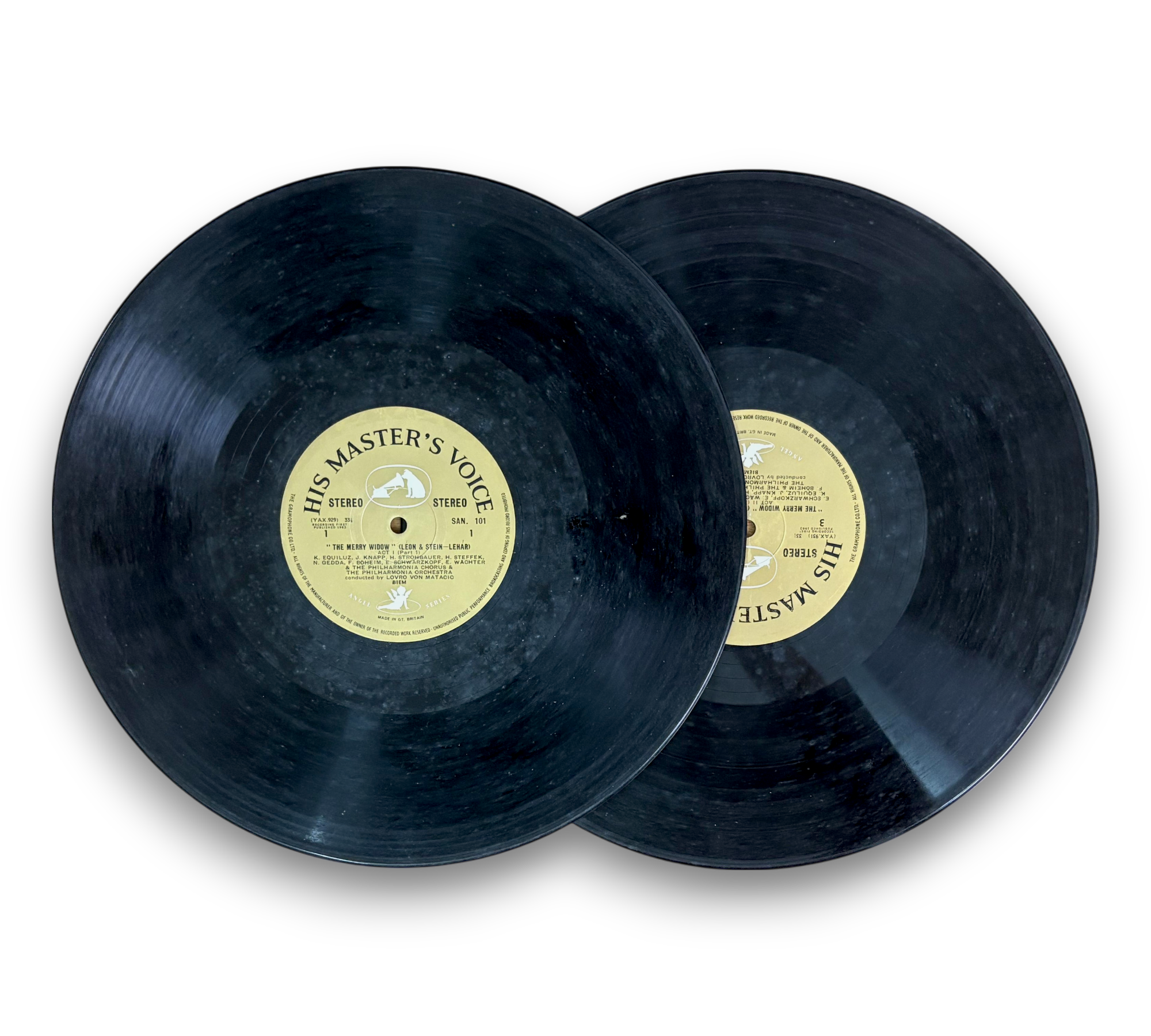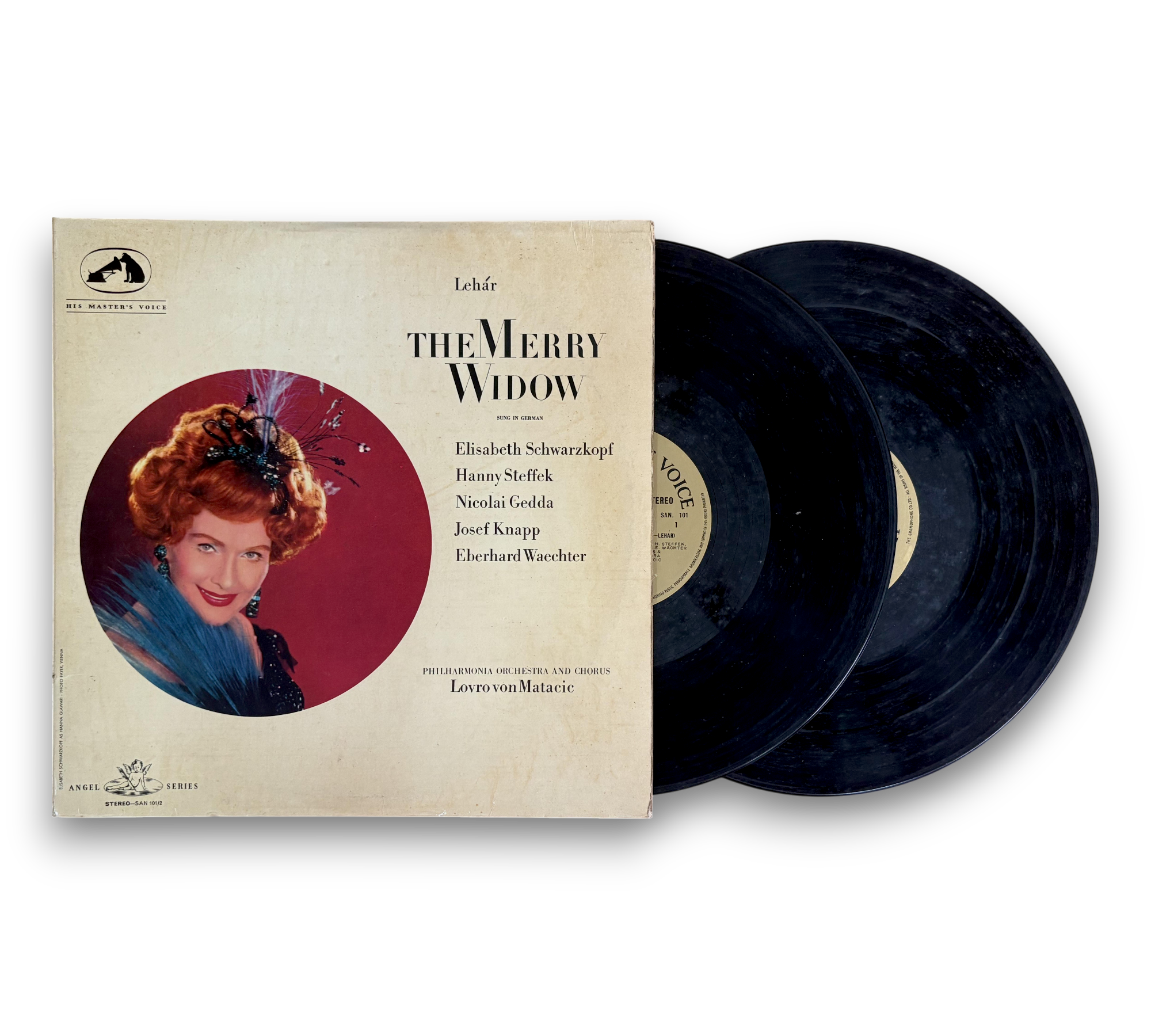 E. M. I. Records Limited presents "The Merry Widow," featuring performances by Elisabeth Schwarzkopf, Hanny Steffek, Nicolai Gedda, Josef Knapp, and Eberhard Waechter, conducted by Lovro von Matacic. This release is part of the Angel Series and showcases the rich orchestration of Lehár's beloved operetta. The record is printed in Great Britain by Ernest J. Day & Co., Ltd., London, W.1. For further details regarding the packaging and inserts, please refer to the accompanying photos.
