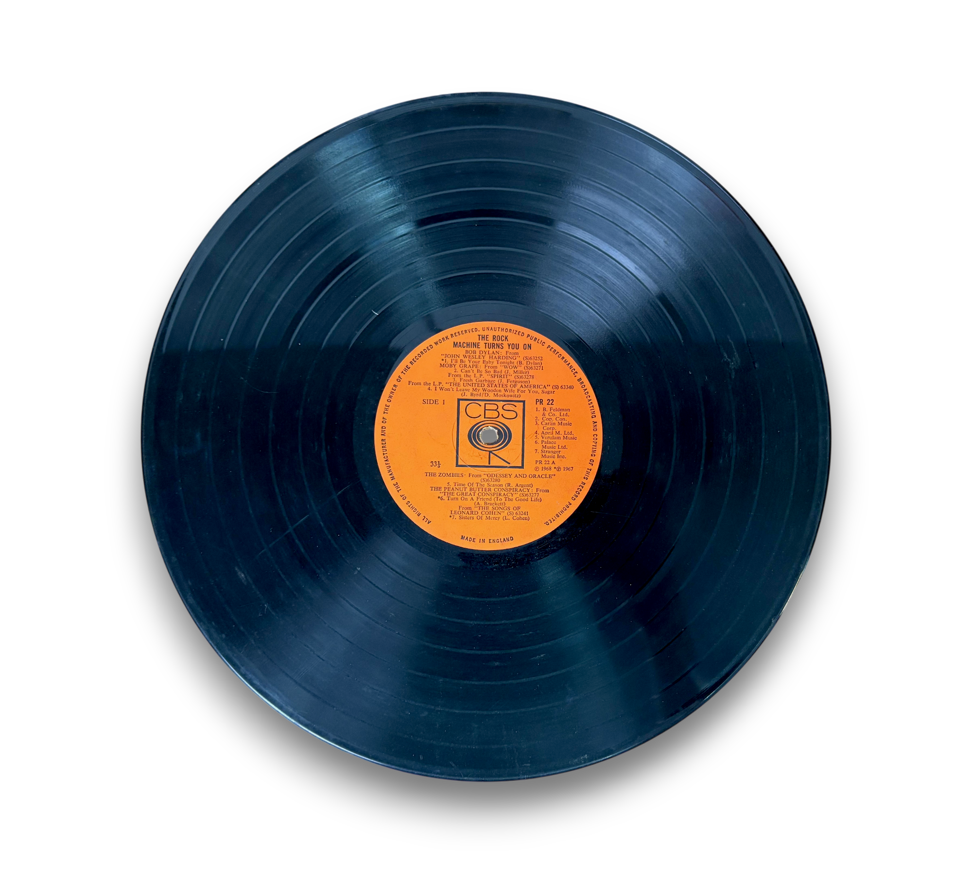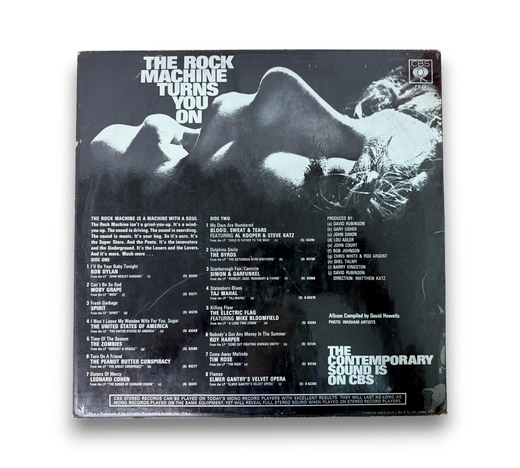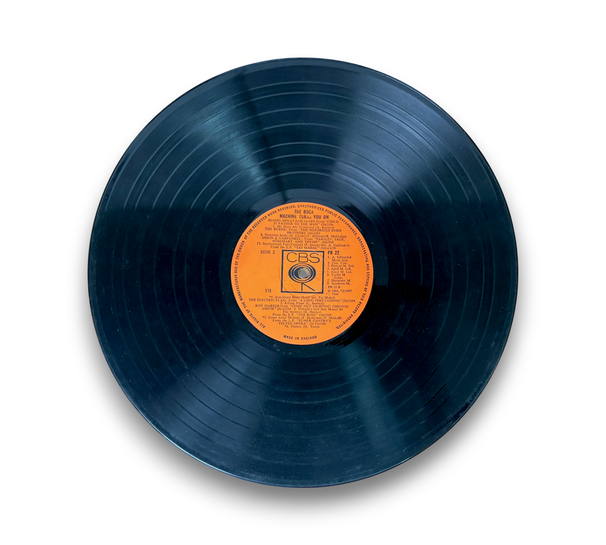 The UK release of "The Rock Machine Turns You On" features "GB" printed in the bottom-right corner of the back cover above the E. J. Day imprint. The label indicates "Made in England," and it is important to note that this version has double-grooved labels. Track B3, which is from the LP "Parsley, Sage, Rosemary & Thyme," does not appear on the reissue CD. For further details regarding the condition and specifics of the packaging, please refer to the accompanying photos.