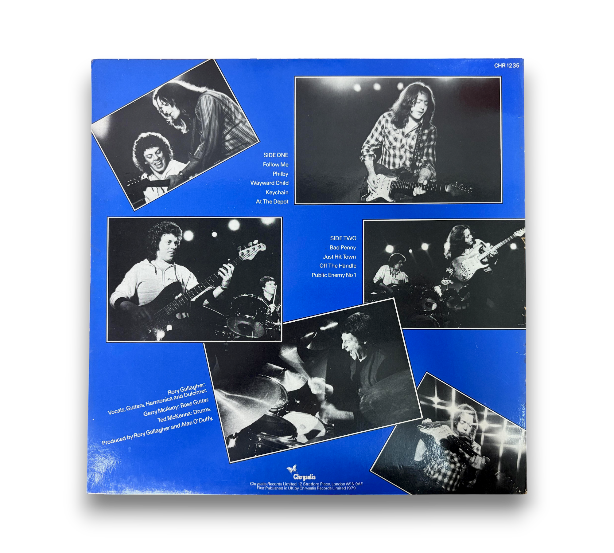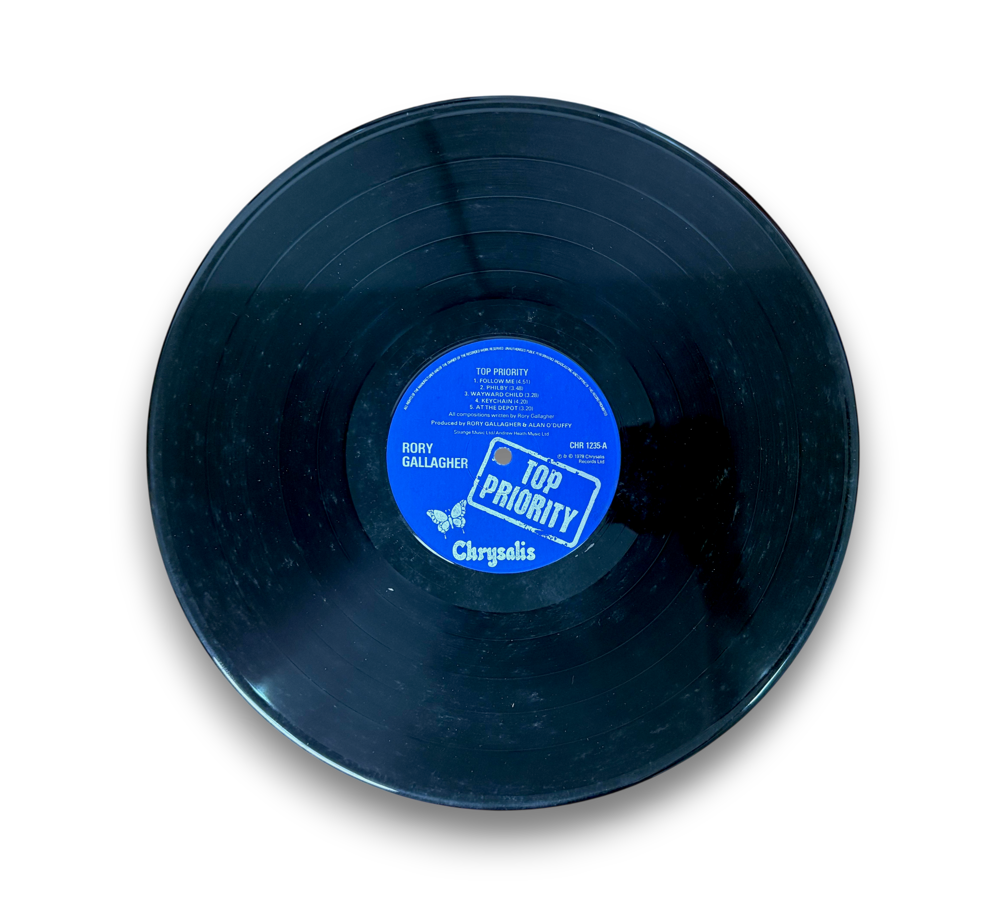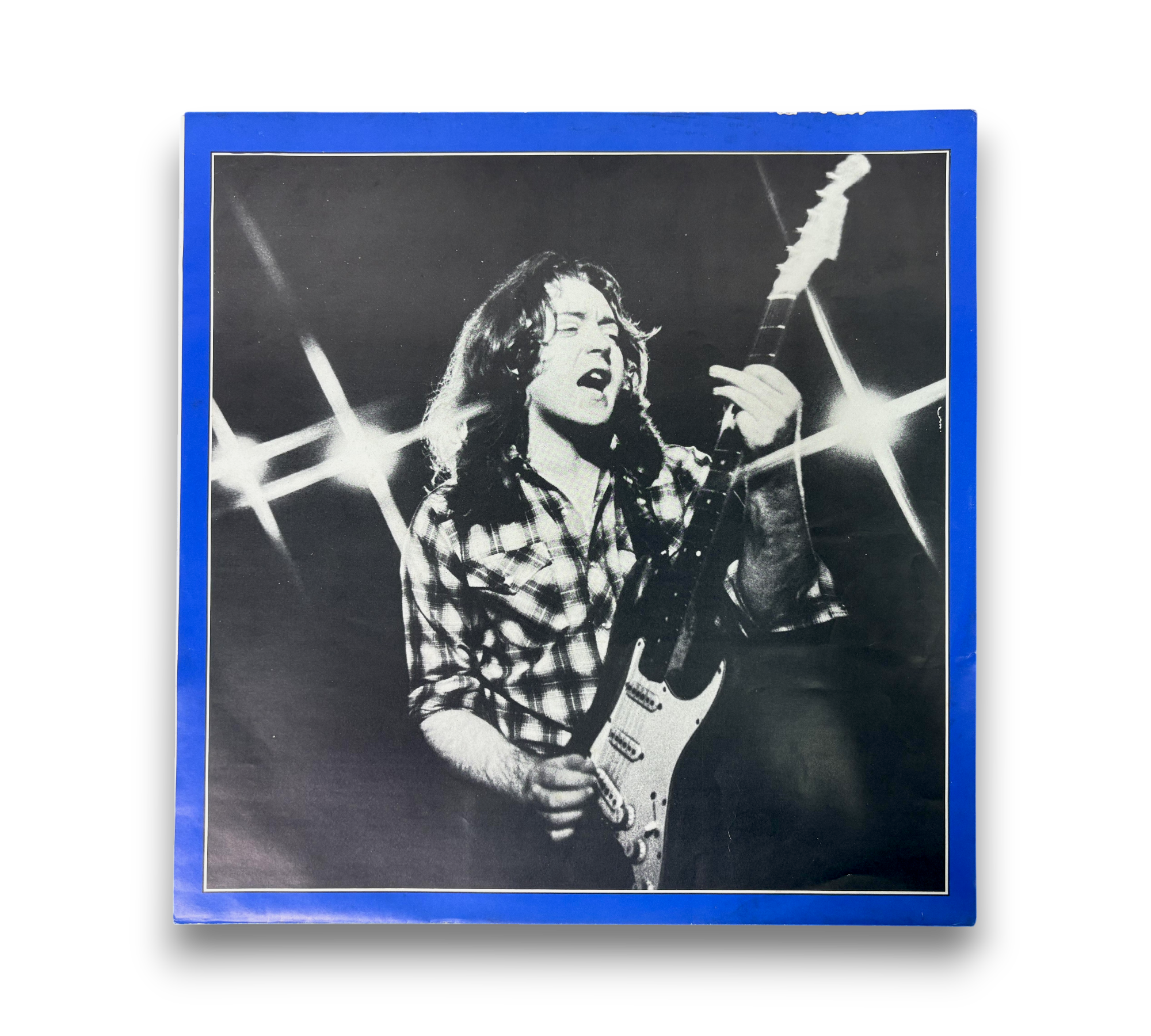 This listing features the album "Top Priority" by Rory Gallagher, presented in a striking blue text sleeve. The front cover showcases a prominent image of Gallagher, while the back features a collection of live performance photographs. The record itself is in excellent condition, with a vibrant blue label. For further details regarding the condition and specifics of the packaging, please refer to the accompanying photos.