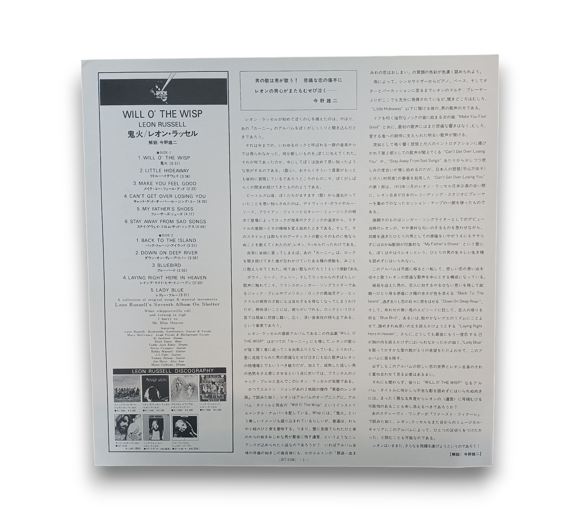 Discover the enchanting sounds of Leon Russell's "Will O' The Wisp," a classic rock gem released in Japan in 1978. This vinyl edition features vibrant artwork and includes a Japanese lyrics insert, enhancing the listening experience. With standout tracks like "Can't Get Over Losing You" and "Back To The Island," this album showcases Russell's unique blend of rock and heartfelt storytelling. A must-have for collectors and fans alike!