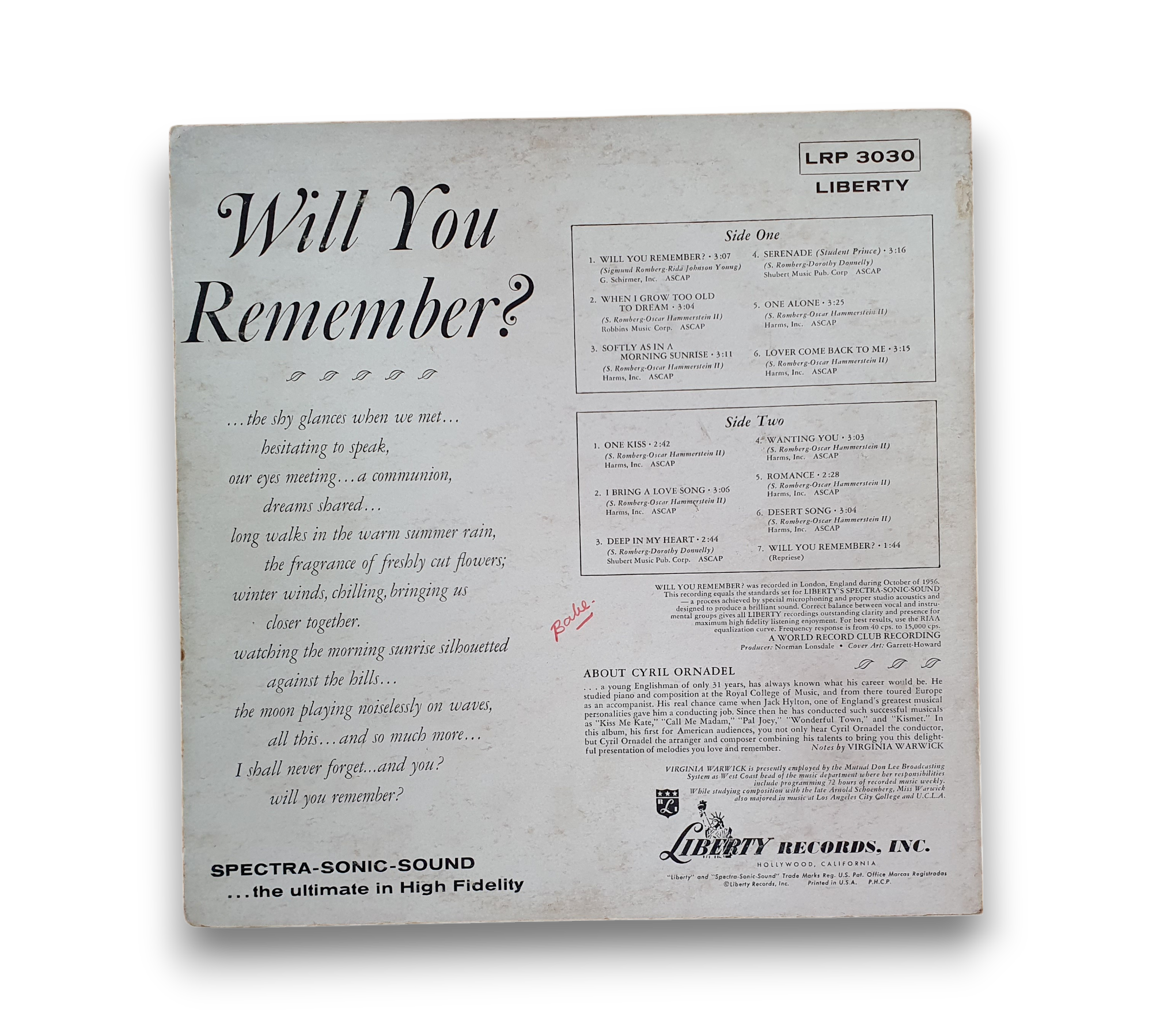Experience the enchanting sounds of jazz with "Will You Remember?" featuring Cyril Ornadel and the London Festival Orchestra. Released in 1957, this vinyl LP showcases a collection of timeless tracks, including "Will You Remember," "Softly As In A Morning Sunrise," and "Lover Come Back To Me." With its lush orchestration and heartfelt melodies, this album is a beautiful addition to any jazz lover's collection.
