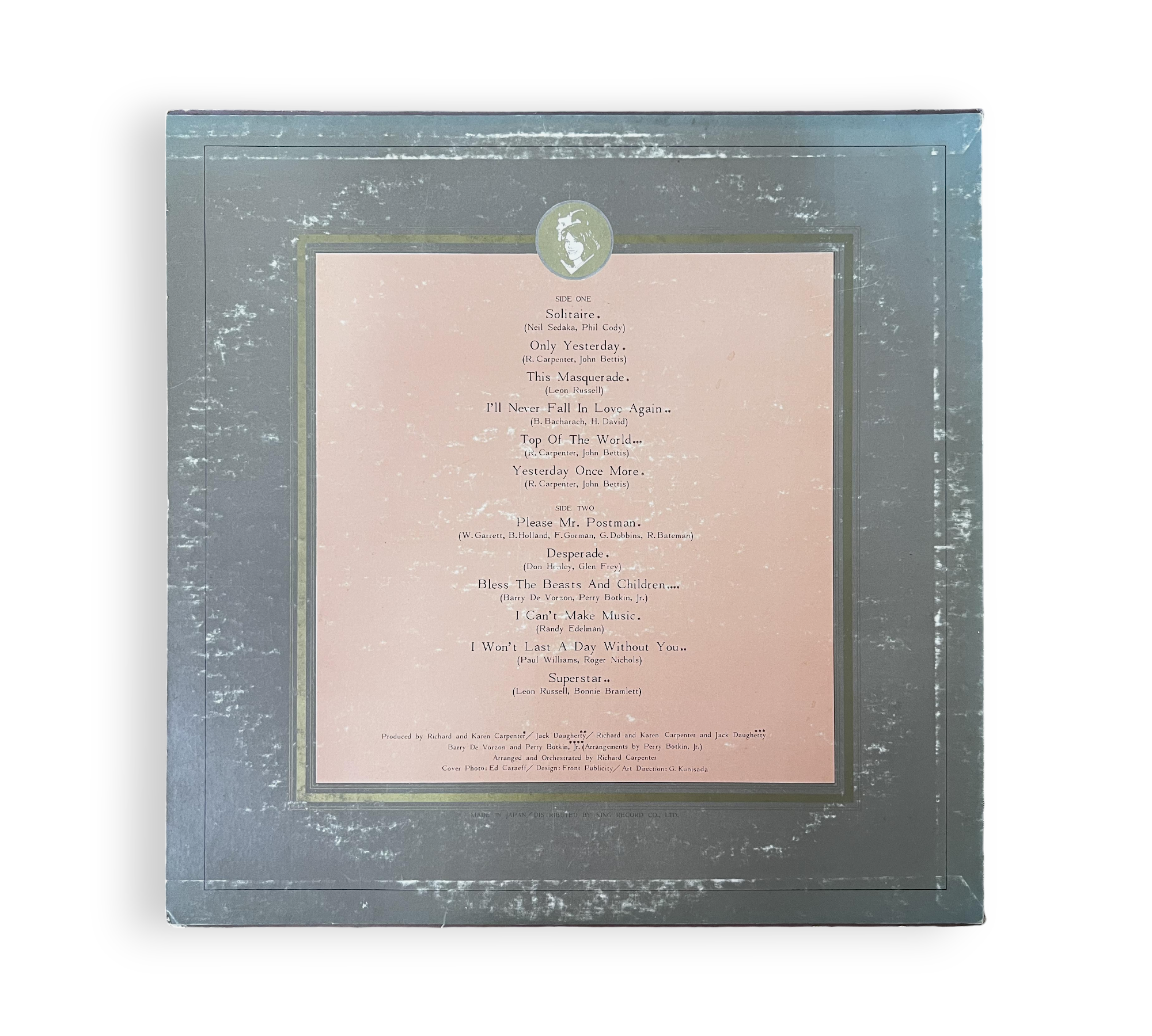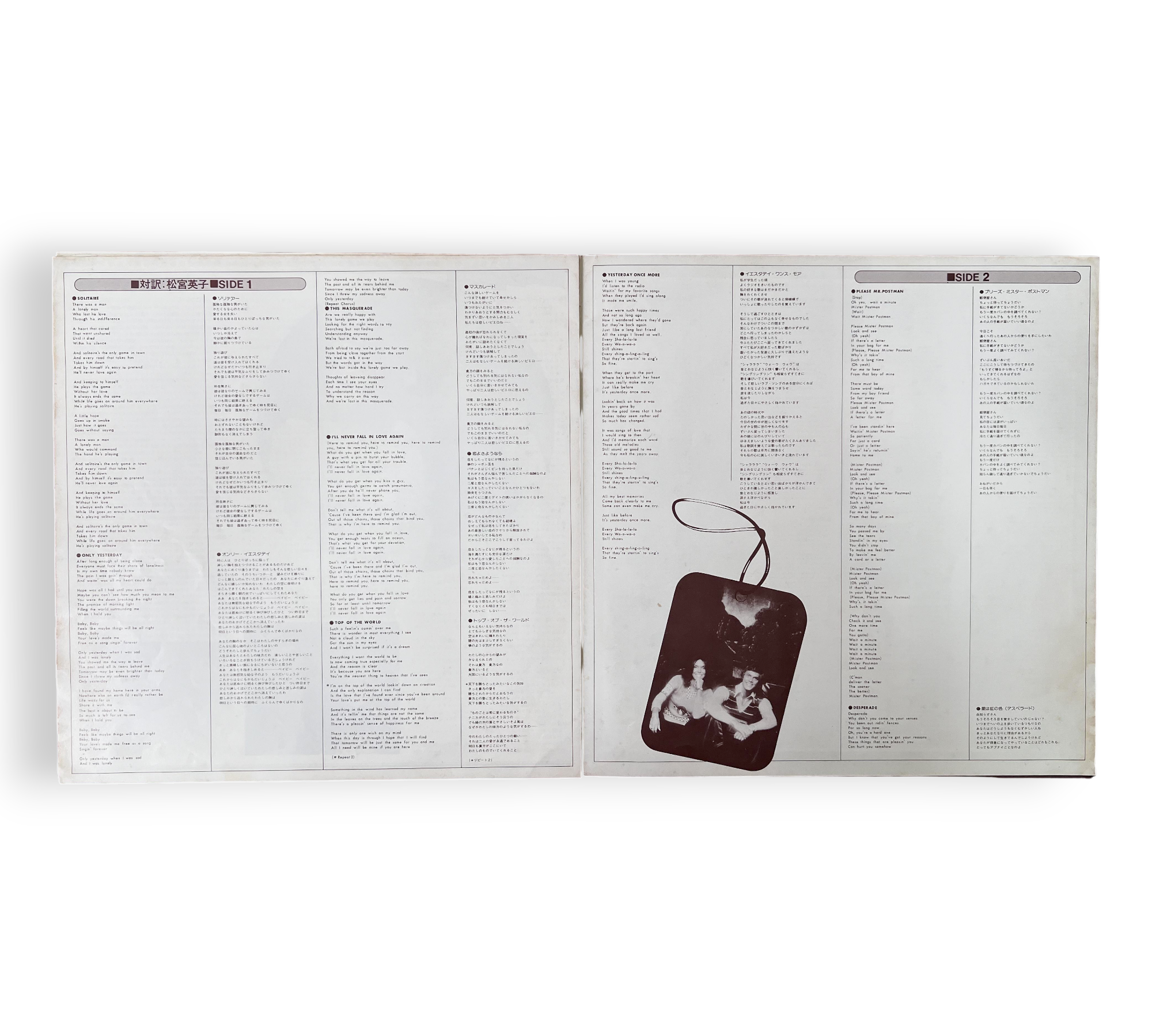 Discover the enchanting melodies of the Carpenters with the 1976 Japanese compilation album "Solitaire." This vinyl record features a curated selection of their beloved singles, including classics like "Only Yesterday," "Top Of The World," and "Superstar." Accompanied by a 20-page booklet with both English and Japanese lyrics, this release offers fans a deeper connection to the music. Perfect for collectors and newcomers alike, this album showcases the Carpenters' signature soft rock and ballad style in a beautifully packaged format.