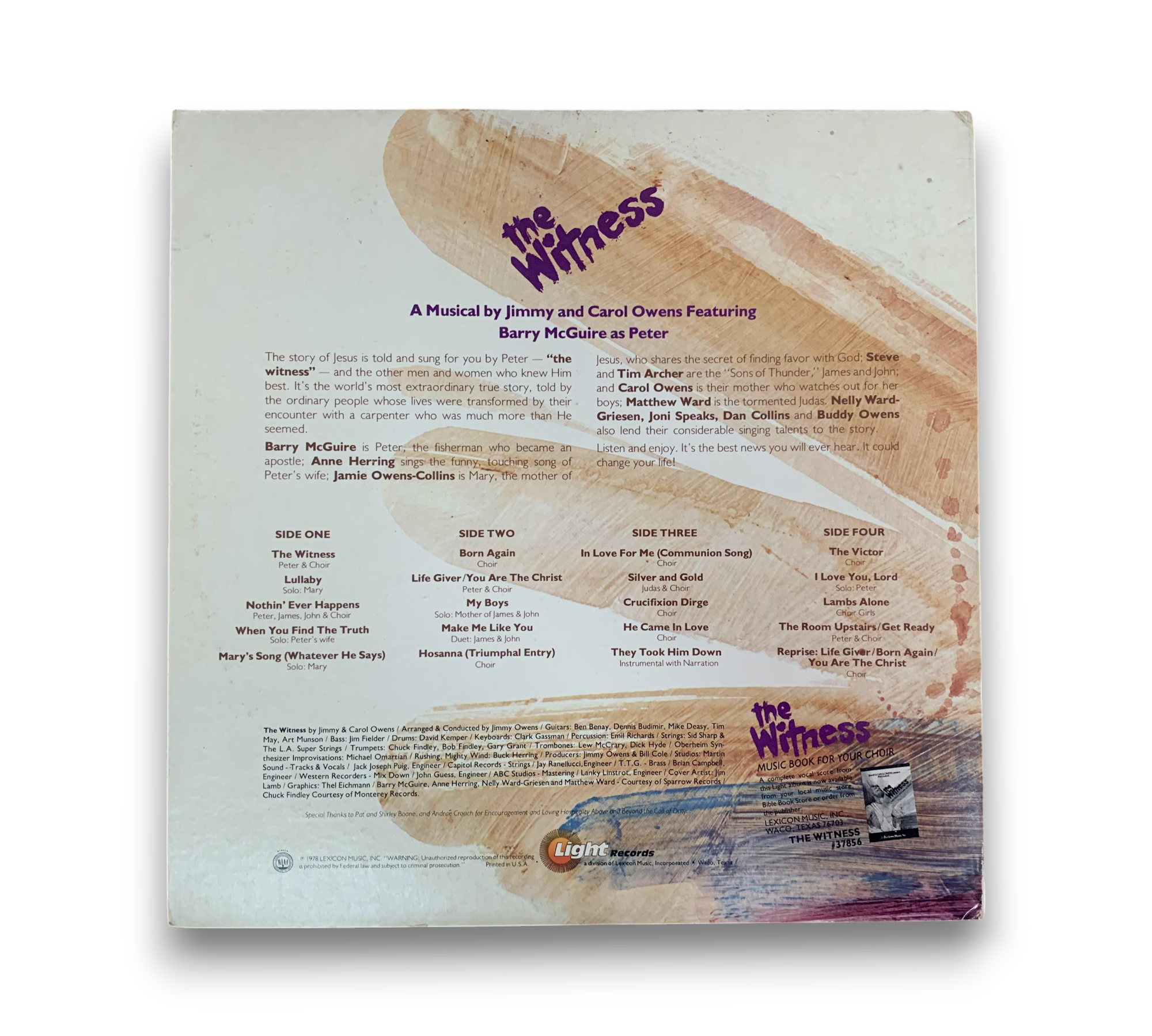 Experience the heartfelt melodies of Jimmy & Carol Owens with their 1978 vinyl release, "The Witness." This pop album features a compelling tracklist, including "The Witness," "Lullaby," and "Born Again," showcasing the duo's harmonious vocals and poignant storytelling. A must-have for fans of inspirational music, this record captures the essence of its time and offers a timeless listening experience.