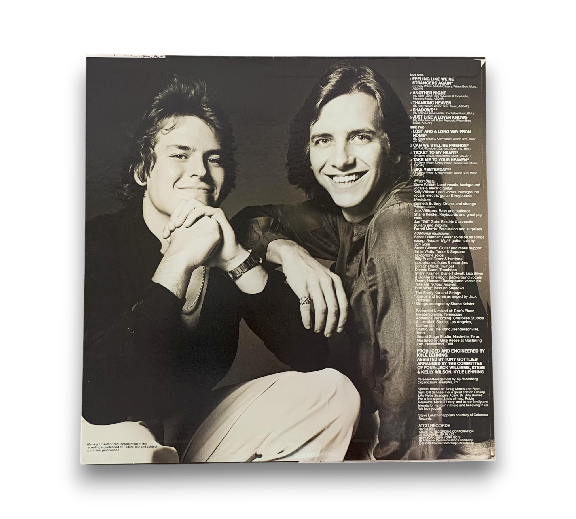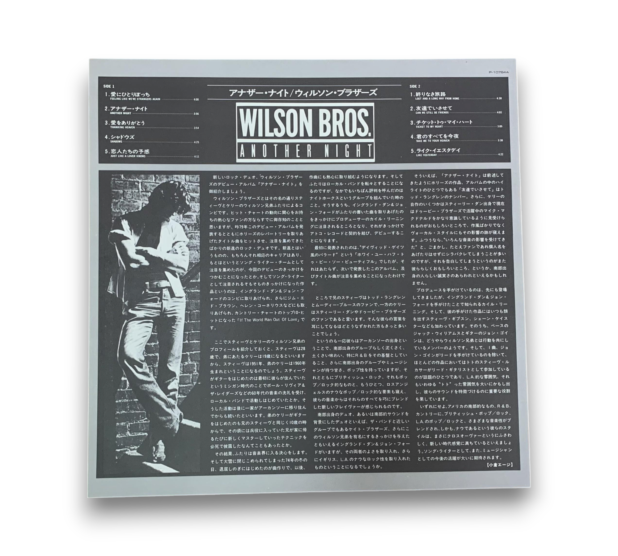 ℗ 1979 Atlantic Recording Corporation. This album, "Another Night" by Wilson Bros., was made by Warner-Pioneer Corporation in Japan and features recordings from various studios, including Doc's Place in Hendersonville, TN, and Cherokee Studios in Los Angeles, CA. The mastering was completed at Mastering Lab in Hollywood, CA. A lyric sheet is included; please refer to the accompanying photos for further details on the packaging and inserts.