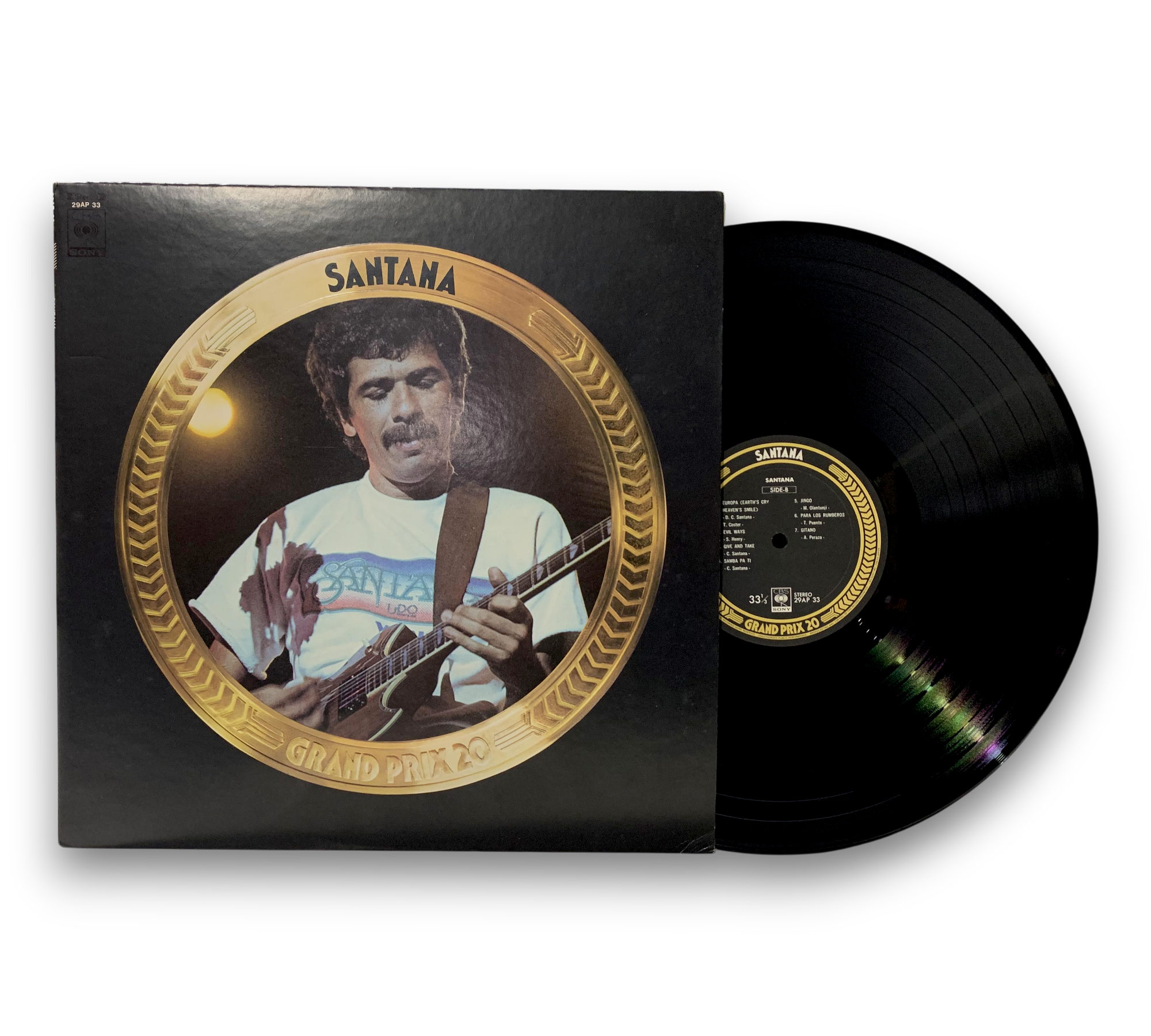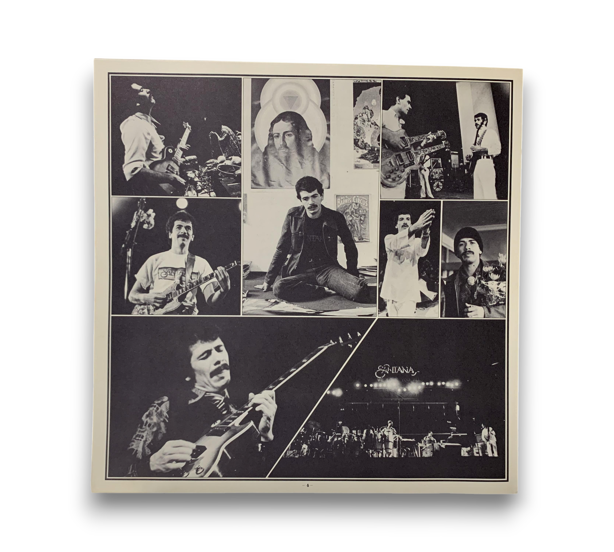 This listing features a record by Santana, presented in an embossed sleeve. The accompanying images reveal a four-page lyrics sheet included with the album. For further details regarding the condition and specifics of the packaging, please refer to the provided photographs.