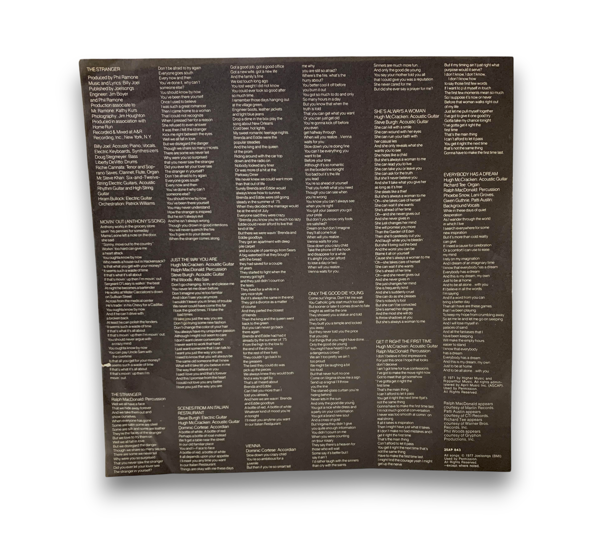 This listing features a believed 1977 pressing of Billy Joel's "The Stranger." The record includes notable contributions from various artists, with all songs copyrighted in 1977. The sleeve indicates copyright by CBS Inc. from both 1977 and 1978. The runouts are etched, adding to the authenticity of this pressing. For specific details regarding packaging and inserts, please refer to the accompanying photos, as they provide a visual representation of the item.