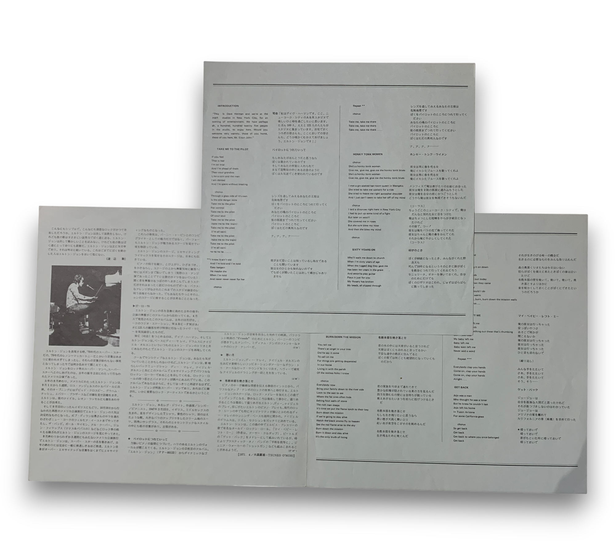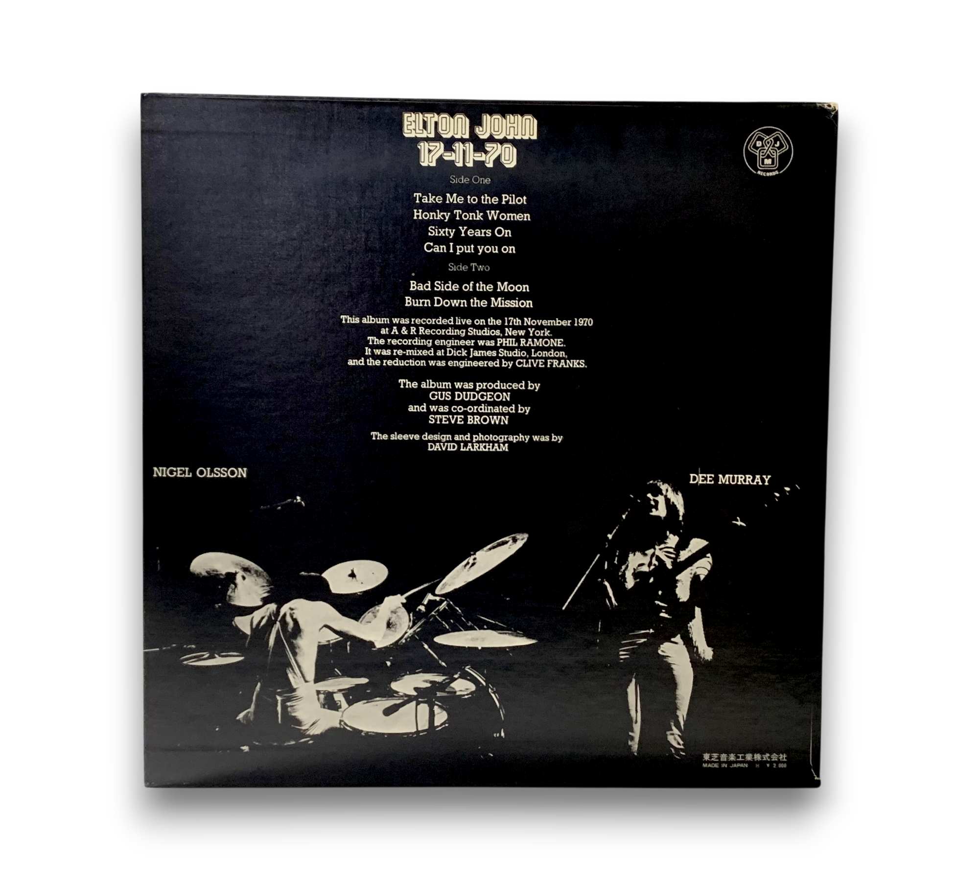 The album "17-11-70" by Elton John features live performances recorded during a radio concert at A&R Recording Studios in New York on November 17, 1970. The release is presented in a heavyweight, textured sleeve. Accompanying the record is a six-page English/Japanese lyric booklet. The album includes tracks such as "Take Me to the Pilot," "Honky Tonk Women," and "Burn Down the Mission." For further details regarding the packaging and inserts, please refer to the accompanying photos.