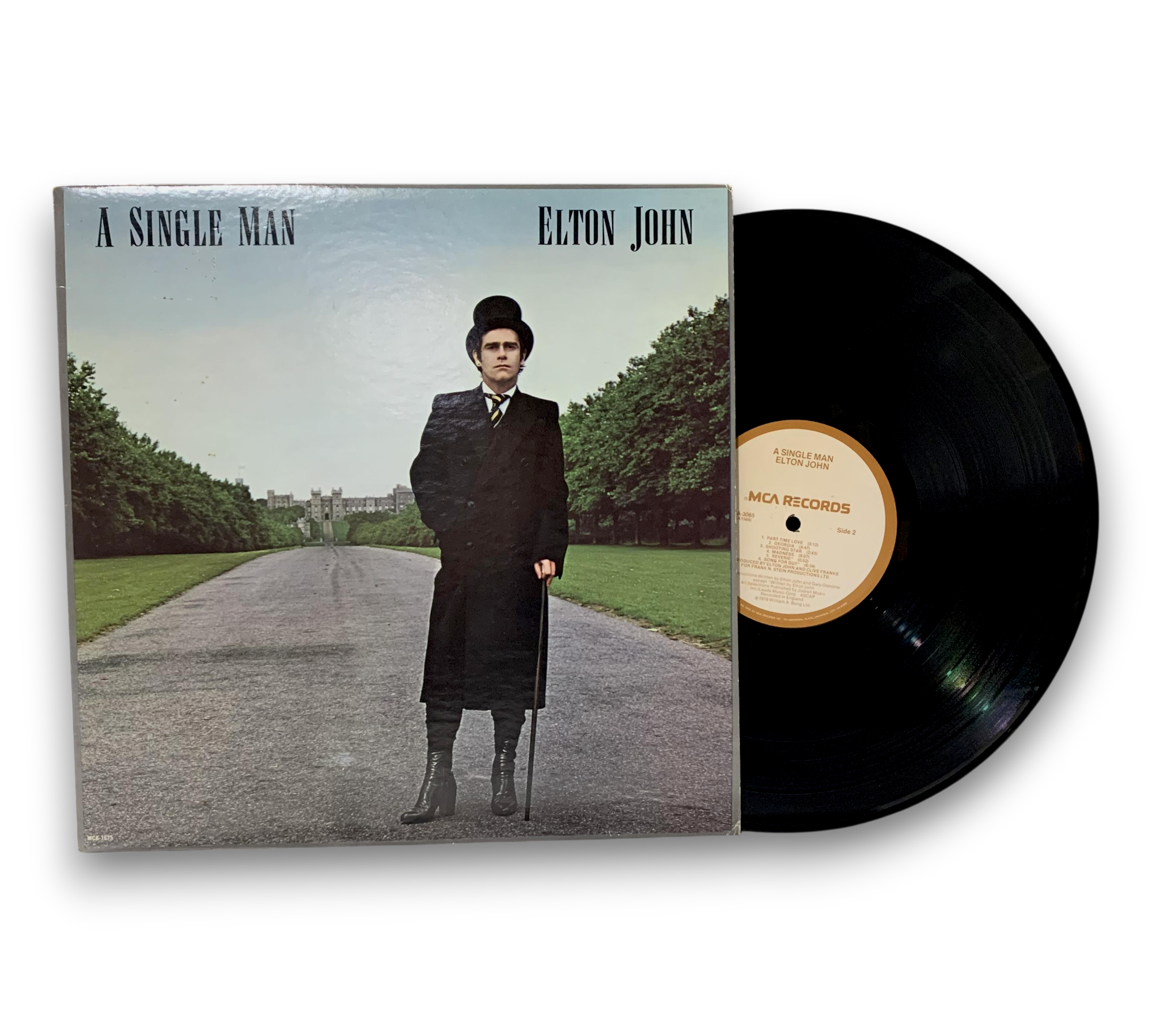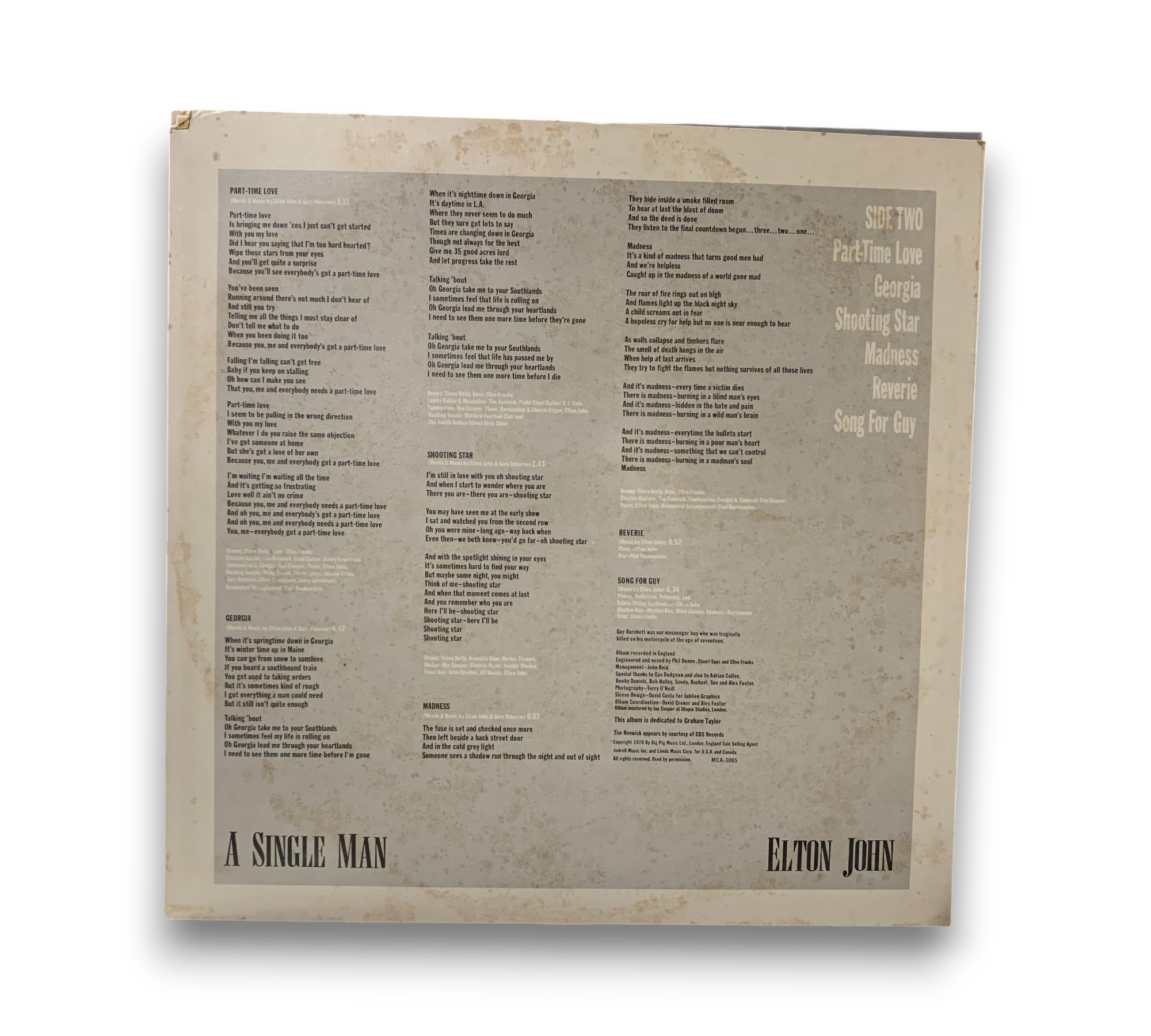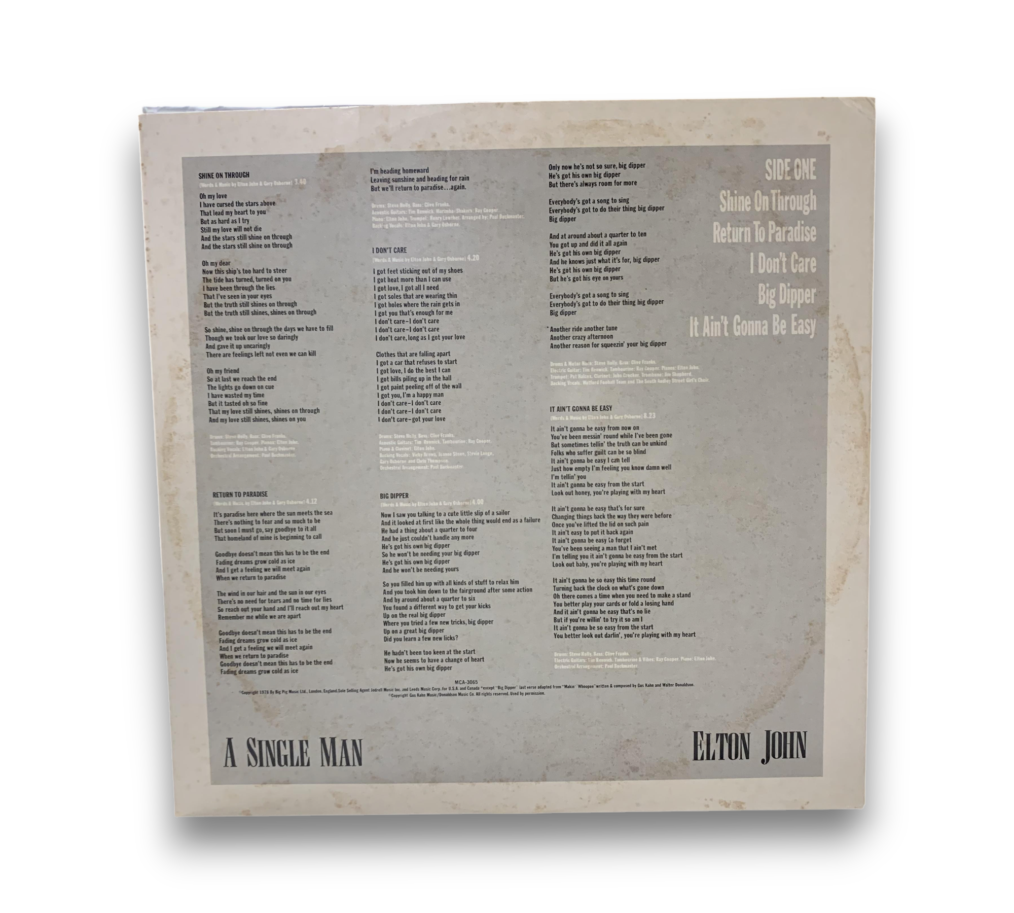 This listing features Elton John's album "A Single Man," originally released in 1978. The record is pressed by MCA Pressing Plant, Gloversville, as indicated by the ⧈-G-⧈ stamp in the runouts. The album includes a printed lyric and credit inner sleeve, which provides insights into the tracks and production details. The spine of the sleeve notes the catalog number MCA-3065, and the album is dedicated to Graham Taylor. For a closer look at the packaging and any additional details, please refer to the accompanying photos.