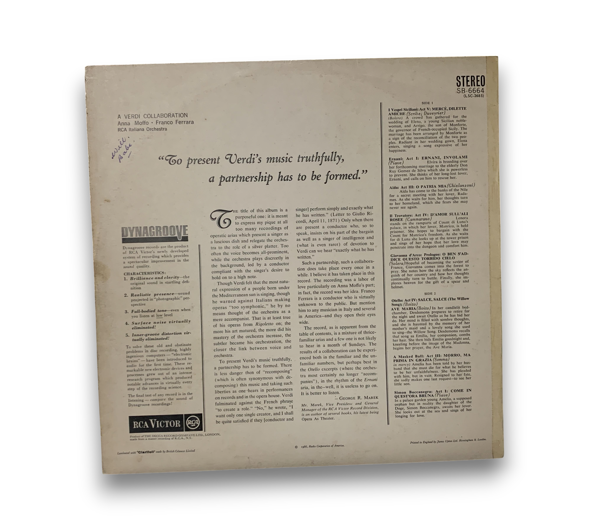 Experience the timeless beauty of Giuseppe Verdi's operatic masterpieces with "A Verdi Collaboration," featuring the enchanting vocals of Anna Moffo. This vinyl record showcases a selection of iconic arias, including "O Patria Mia" from Aida and "D'Amor Sull'Ali Rosee" from Il Trovatore, capturing the essence of Romantic opera. Released in the UK, this collection is a must-have for classical music enthusiasts and opera lovers alike.