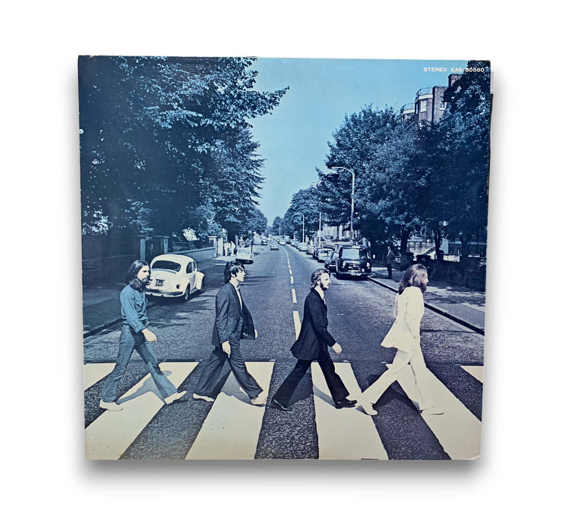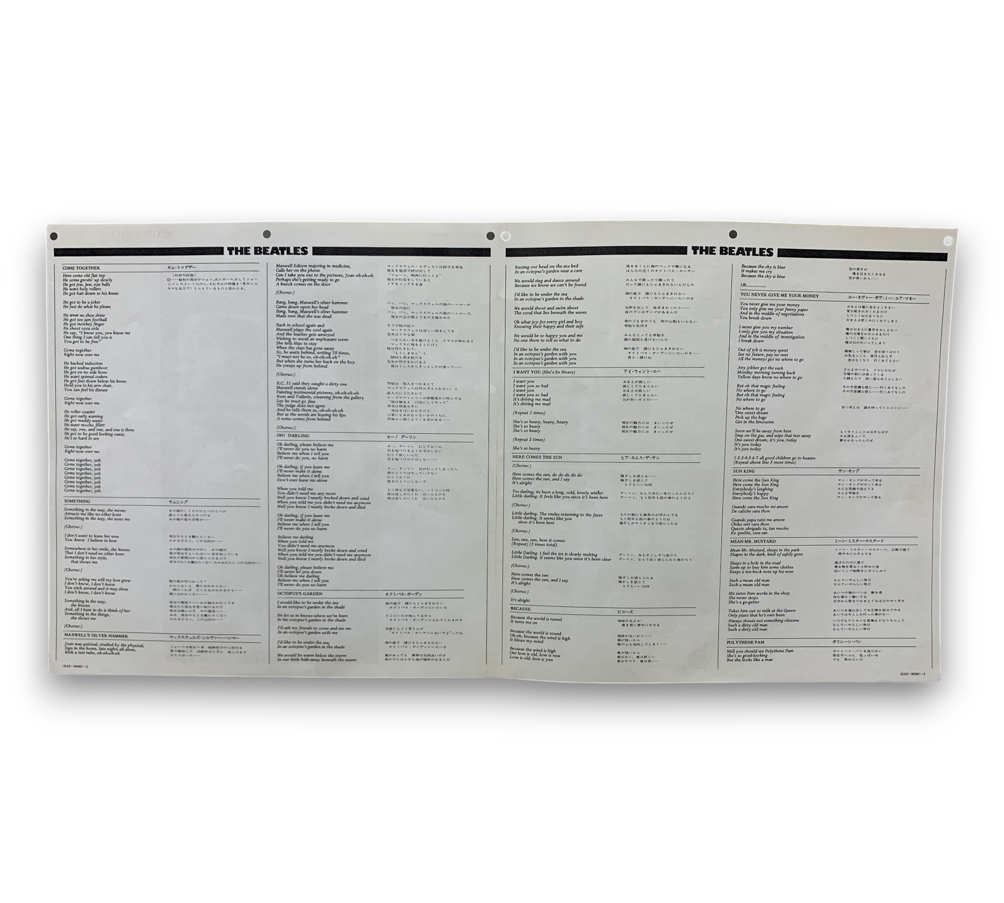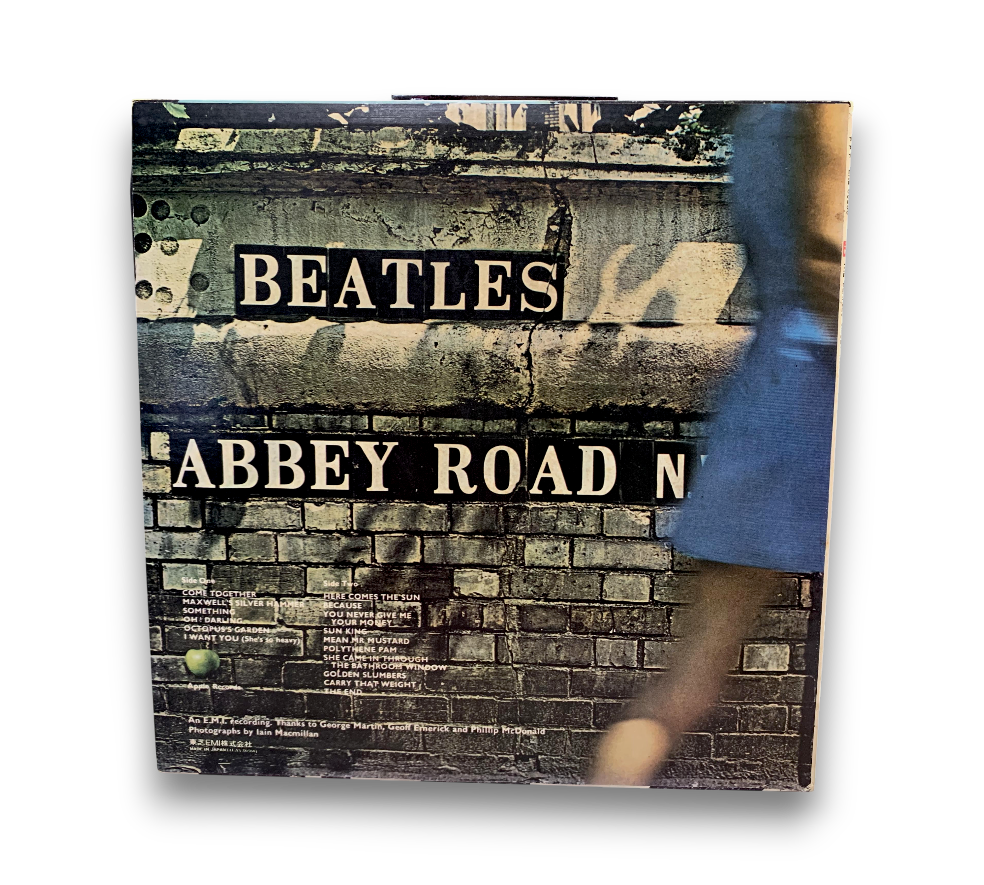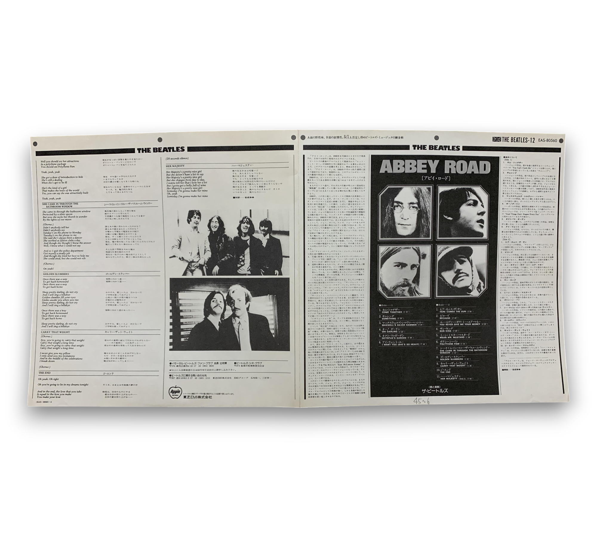 This listing features the 1976 "Country Flag" obi re-issue of the Beatles' iconic album, part of the EAS series, designated as issue number 12. The record showcases a lighter green Apple label and utilizes a UK master, as indicated by the matrix stamp. The back cover includes Apple and Japan EMI text, and the track listing mirrors that of the UK release, with "Maxwell's Silver Hammer" mistakenly listed as the second track instead of "Something." The included Japanese/English bio-lyric sheet insert is visible in the accompanying photos. For further details regarding packaging and inserts, please refer to the images provided.
