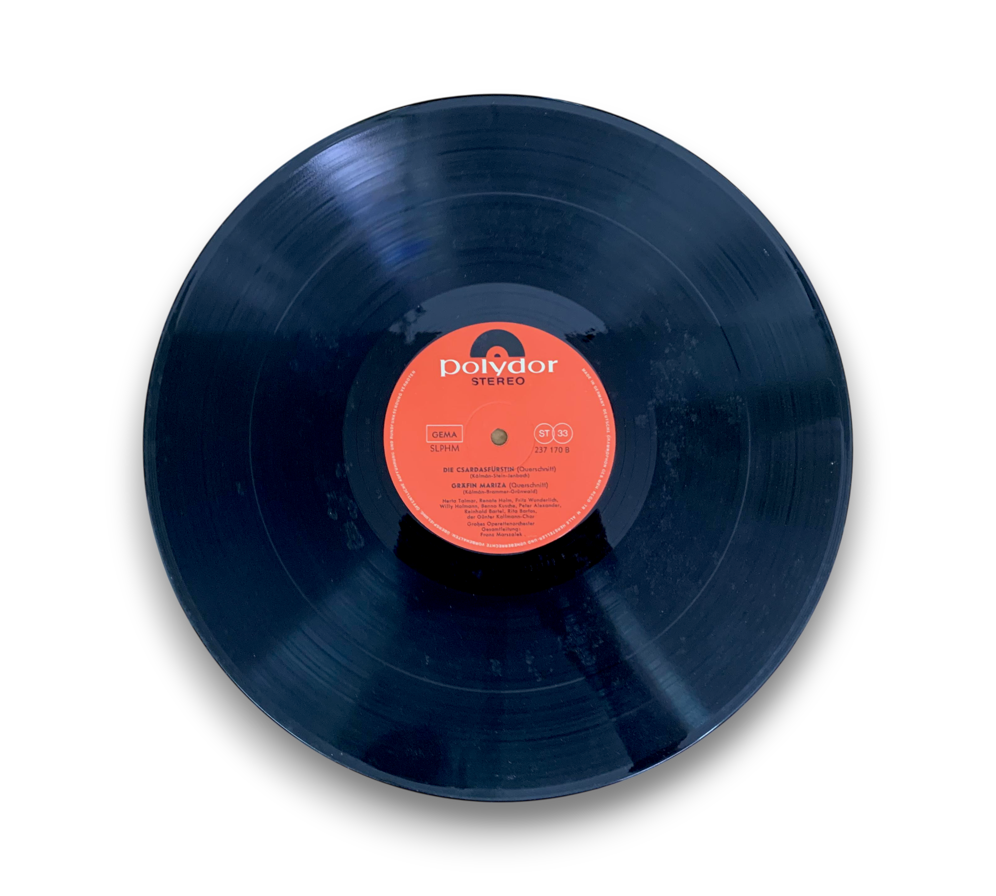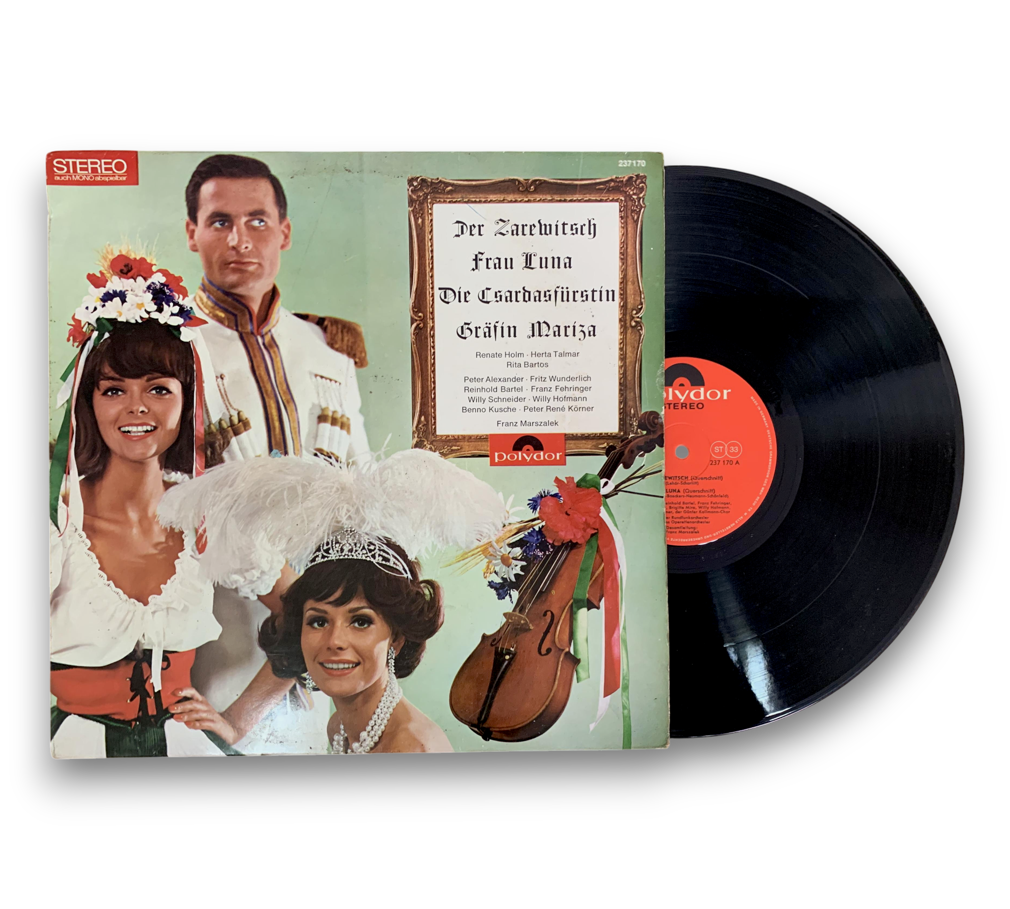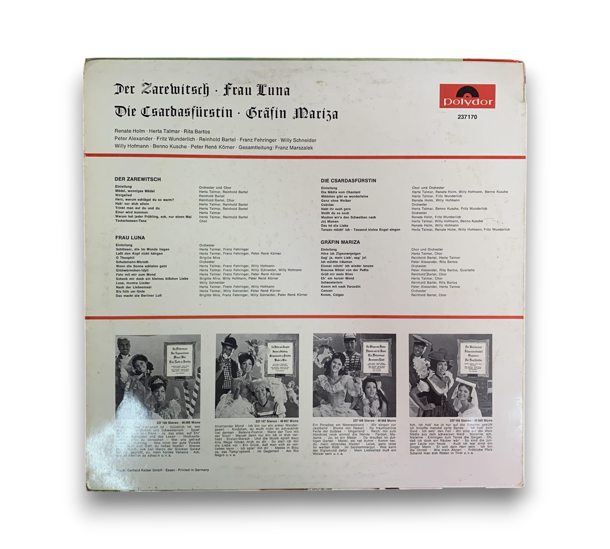 Querschnitt durch 4 Operetten is a captivating collection featuring selections from "Der Zarewitsch," "Frau Luna," "Die Csardasfürstin," and "Gräfin Mariza." This record, printed in Germany in October 1965, showcases performances by notable artists such as Renate Holm, Herta Talmar, and Rita Bartos. The album is presented in stereo format under the Polydor label. For further details regarding the packaging and inserts, please refer to the accompanying photos.