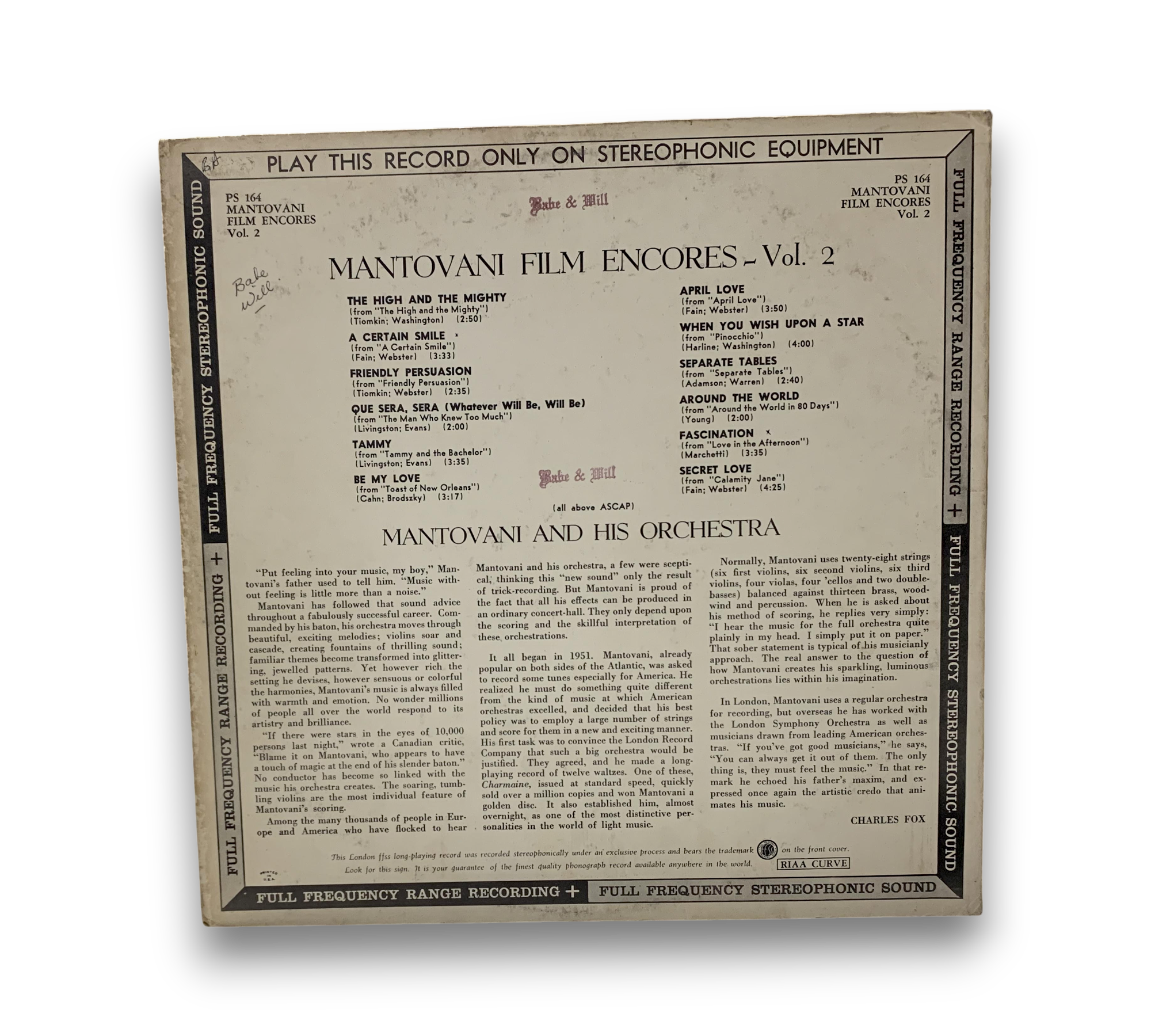 Delight in the soothing melodies of "Film Encores Vol. 2," featuring the enchanting sounds of Mantovani And His Orchestra. Released in the UK in 1959, this vinyl LP offers a collection of beloved film themes, including classics like "Que Sera, Sera" and "When You Wish Upon A Star." Perfect for easy listening enthusiasts, this album captures the essence of cinematic nostalgia and showcases the lush orchestral arrangements that Mantovani is renowned for.